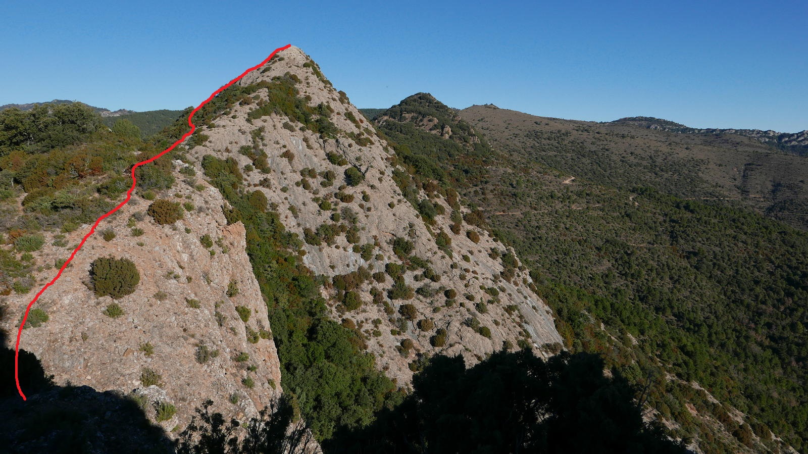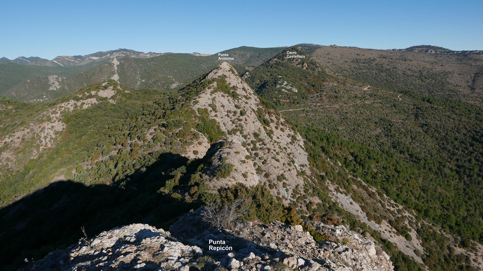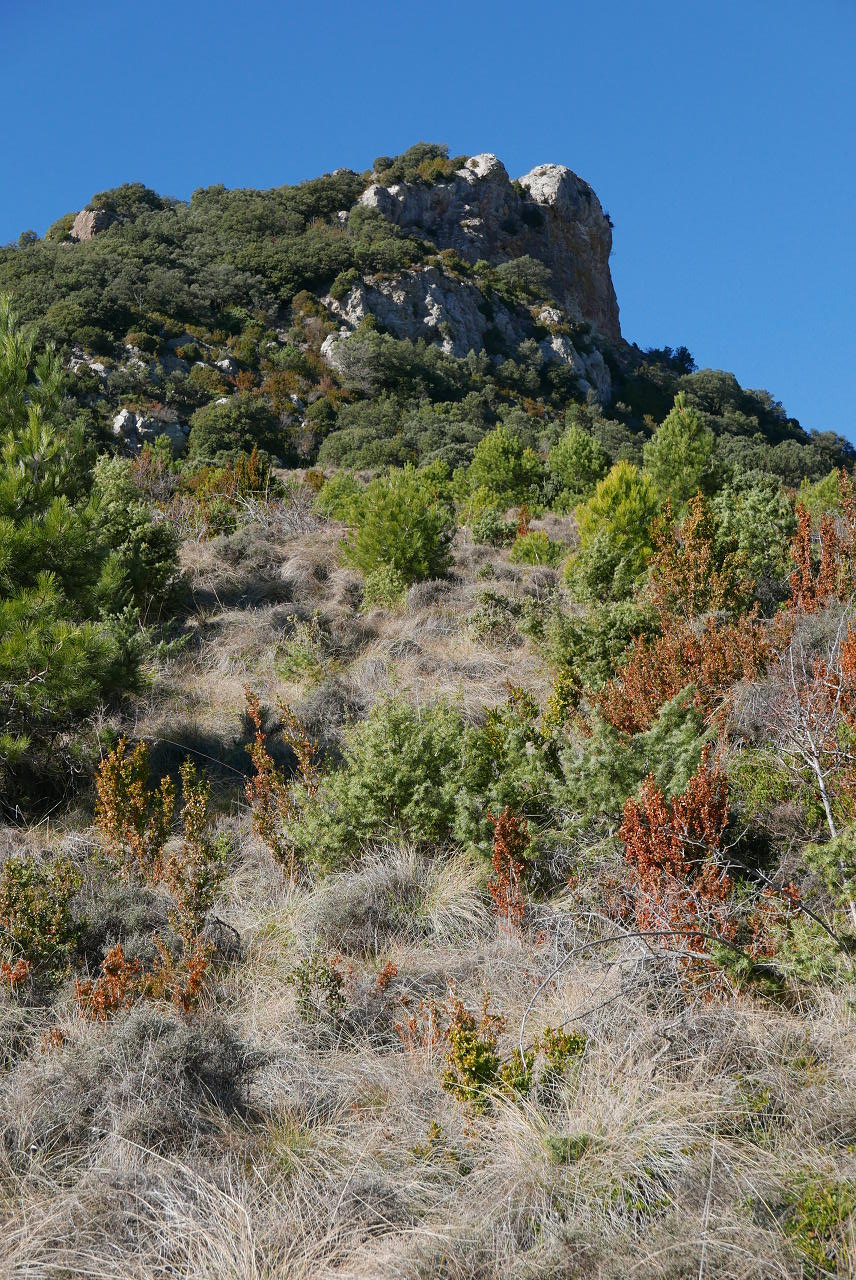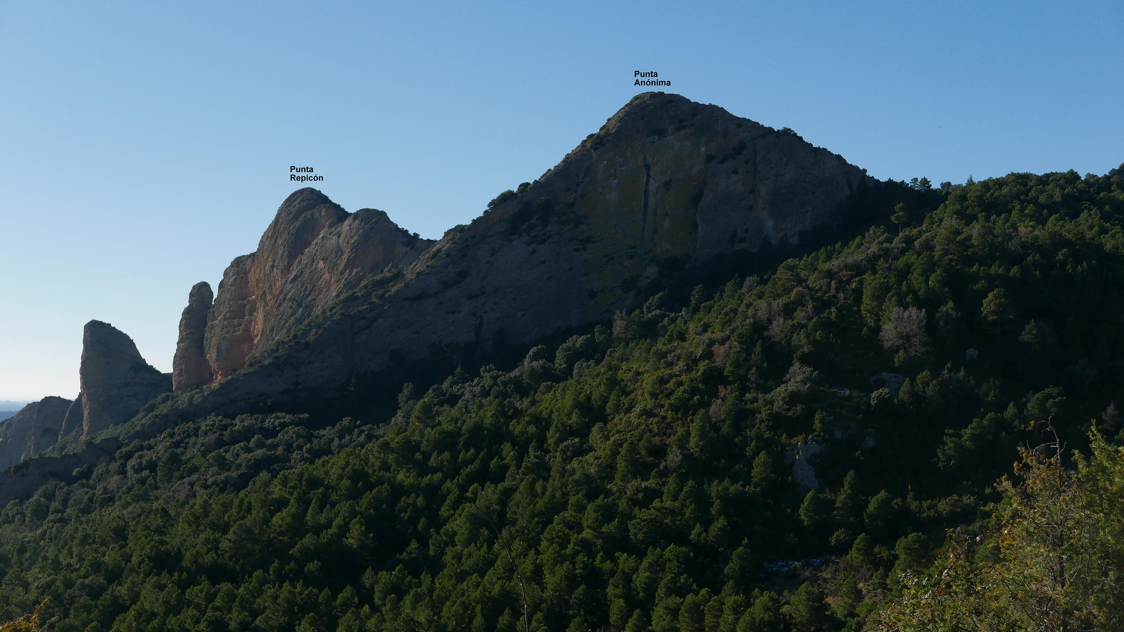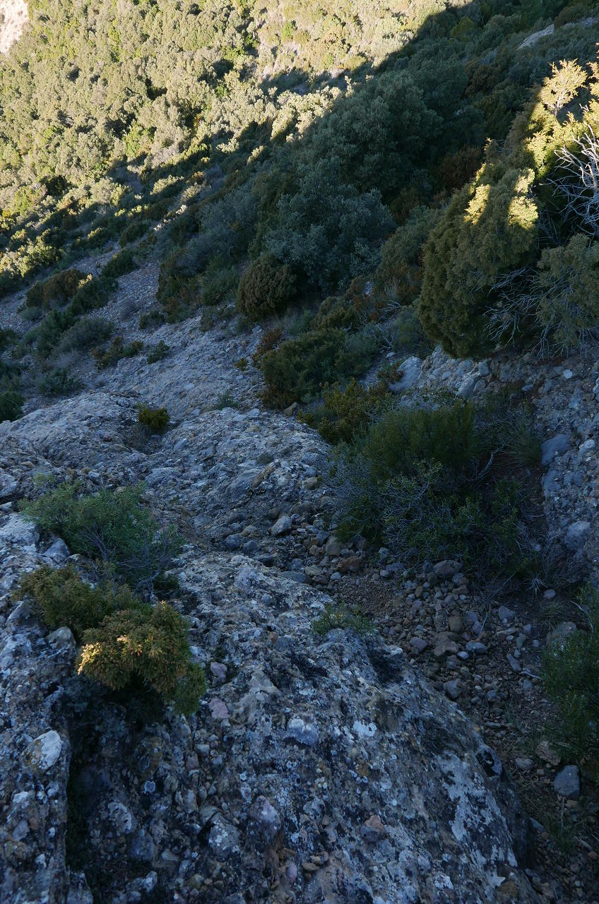 No tomo la pista, sino una sendita a la izquierda oculta entre la vegetación. El ascenso no es problemático y, aunque está bastante pisada, hay que estar atento para no perderla. Cambia a la vertiente sur (1004m 1h27′) y sigue a la izquierda muy difusa y entre pinchos. Bajo la Punta Anónima dejo la senda (1000m 1h30′) y subo a la izquierda por una zona un poco más abierta, pedregosa y con mucha pendiente que se introduce en la roca de conglomerado. Casi sin trepar, pero apoyando las manos por la fuerte pendiente, llega a la Punta anónima (1039m 1h38′). Desciendo más o menos por la misma ruta hasta la senda difusa y continúo. Hay algún trapo blanco atado en las ramas. Un primer resalte se evita por la derecha. Luego un segundo resalte con alguna trepada y finalmente asciendo la Punta Repicón (1032m 1h57′).