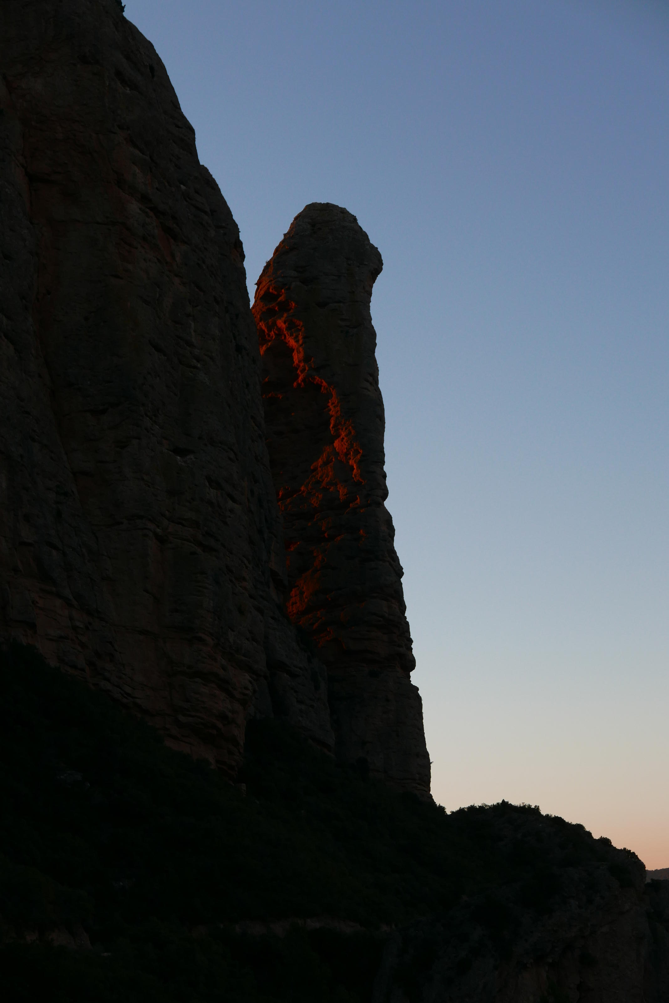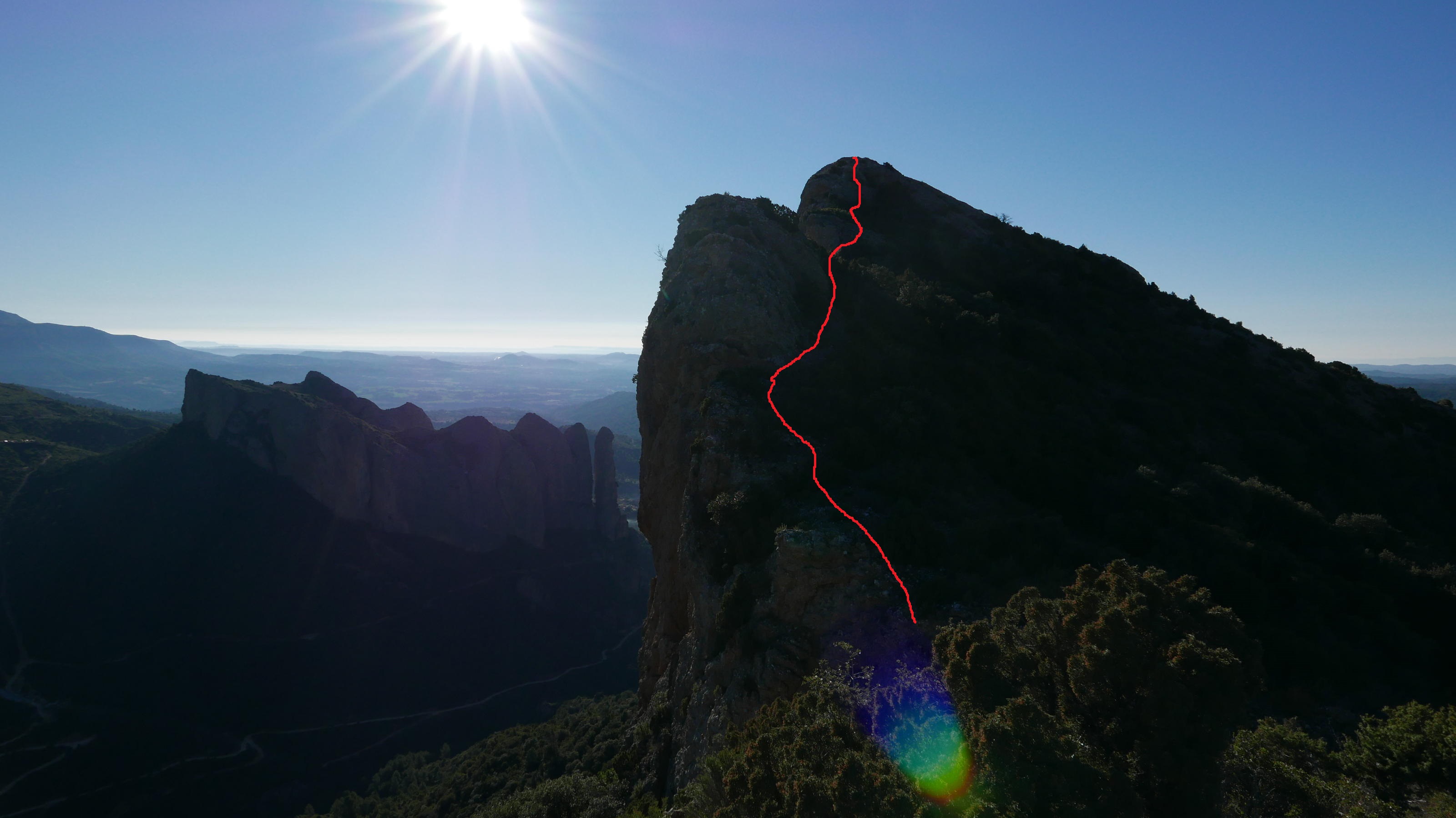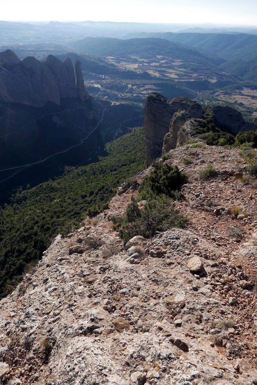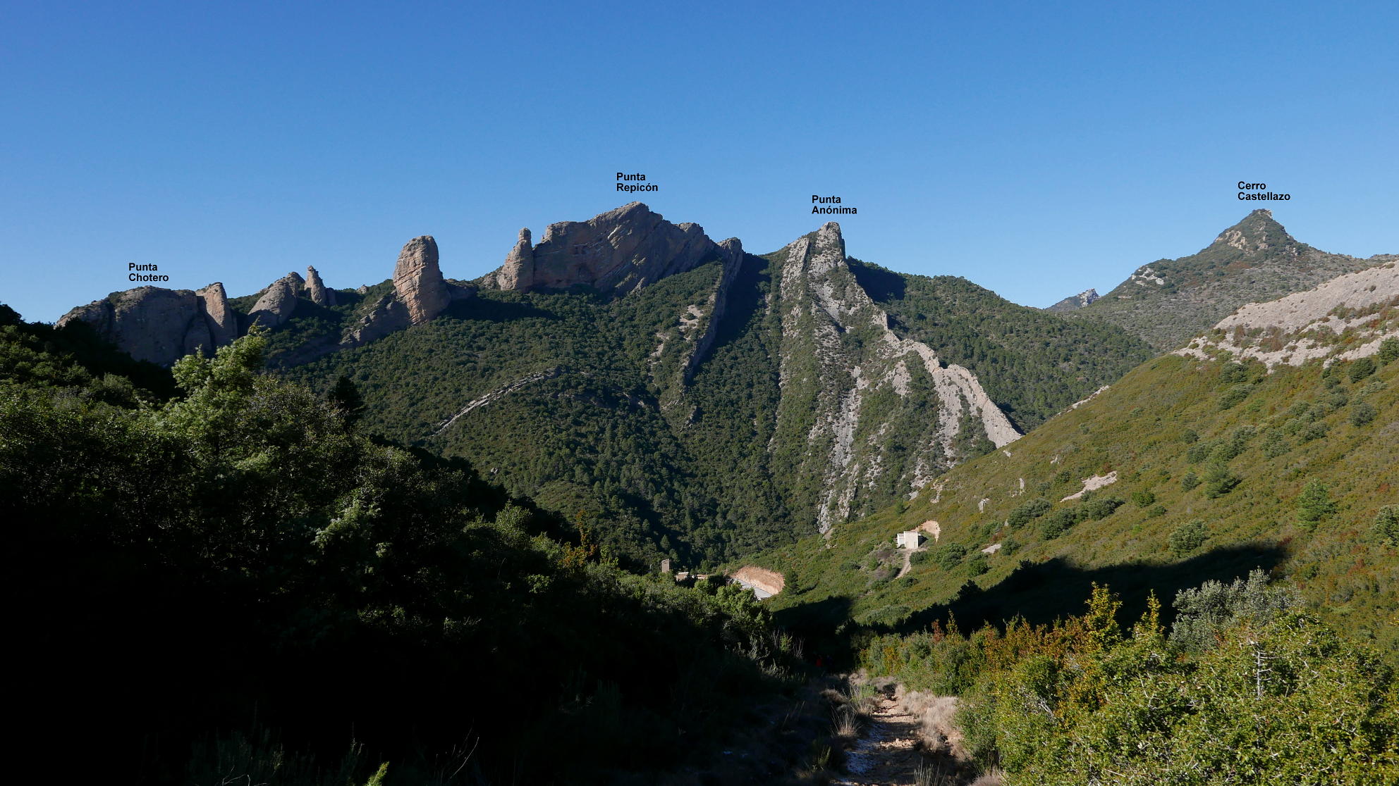 No tomo la pista, sino una sendita a la izquierda oculta entre la vegetación. El ascenso no es problemático y, aunque está bastante pisada, hay que estar atento para no perderla. Cambia a la vertiente sur (1004m 1h27′) y sigue a la izquierda muy difusa y entre pinchos. Bajo la Punta Anónima dejo la senda (1000m 1h30′) y subo a la izquierda por una zona un poco más abierta, pedregosa y con mucha pendiente que se introduce en la roca de conglomerado. Casi sin trepar, pero apoyando las manos por la fuerte pendiente, llega a la Punta anónima (1039m 1h38′). Desciendo más o menos por la misma ruta hasta la senda difusa y continúo. Hay algún trapo blanco atado en las ramas. Un primer resalte se evita por la derecha. Luego un segundo resalte con alguna trepada y finalmente asciendo la Punta Repicón (1032m 1h57′).