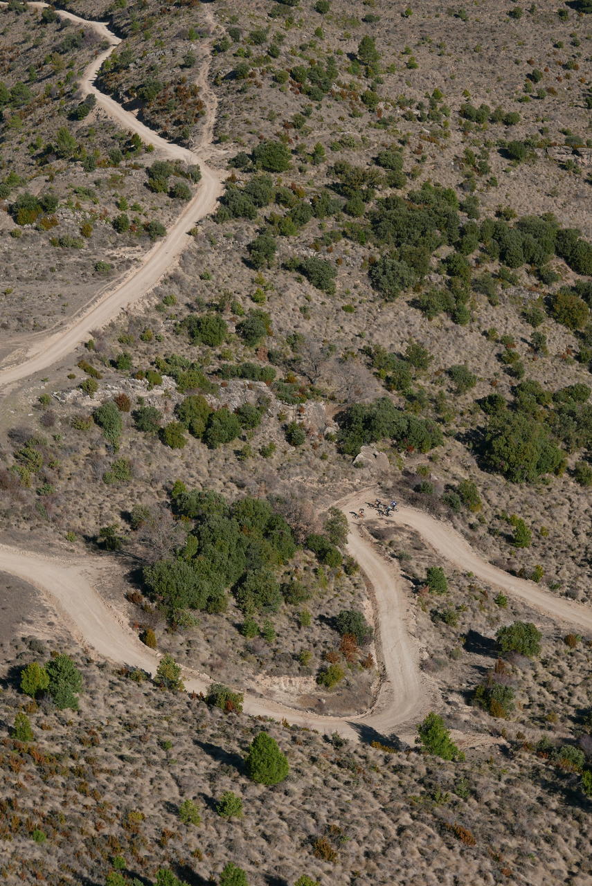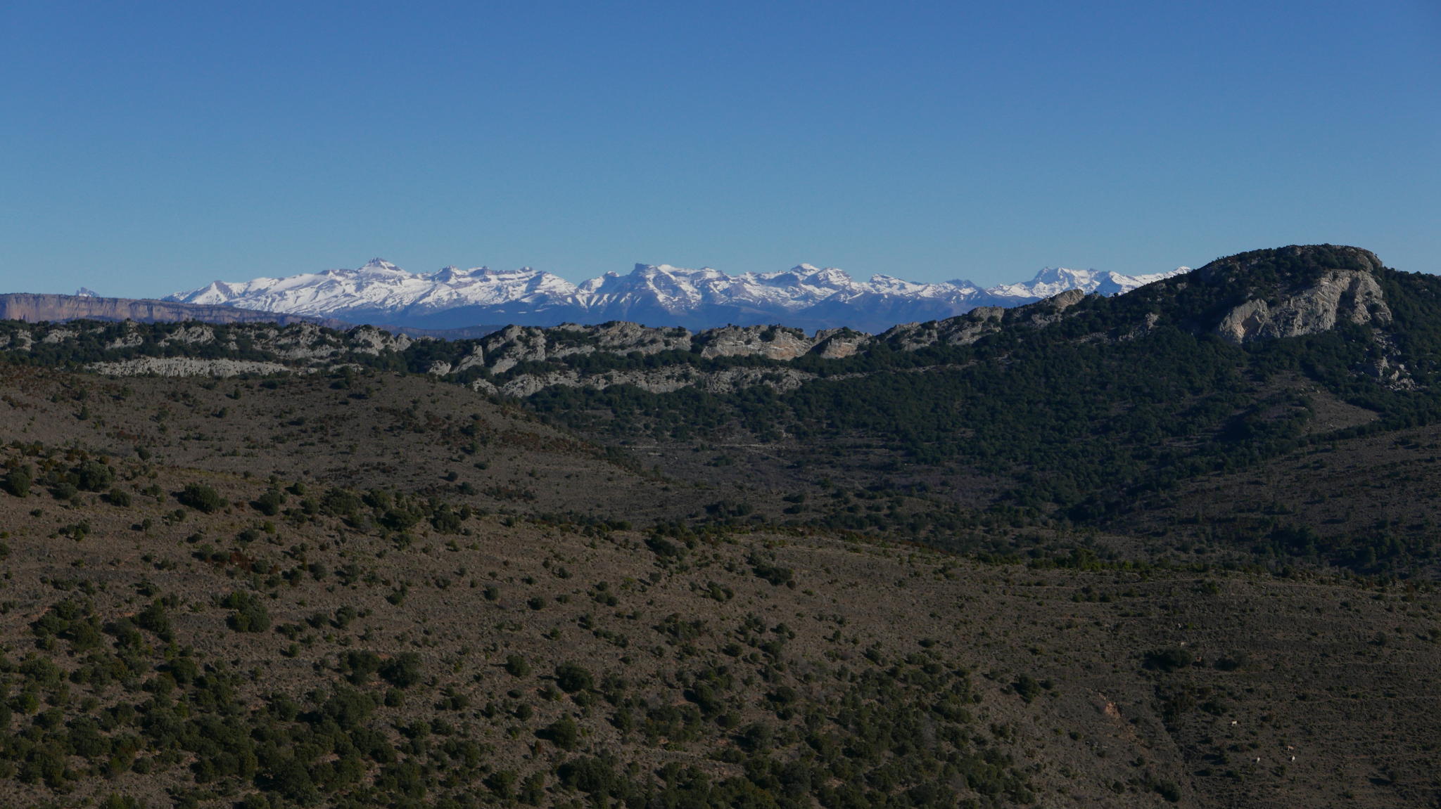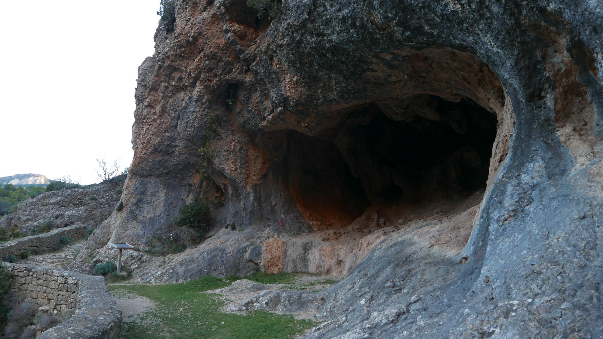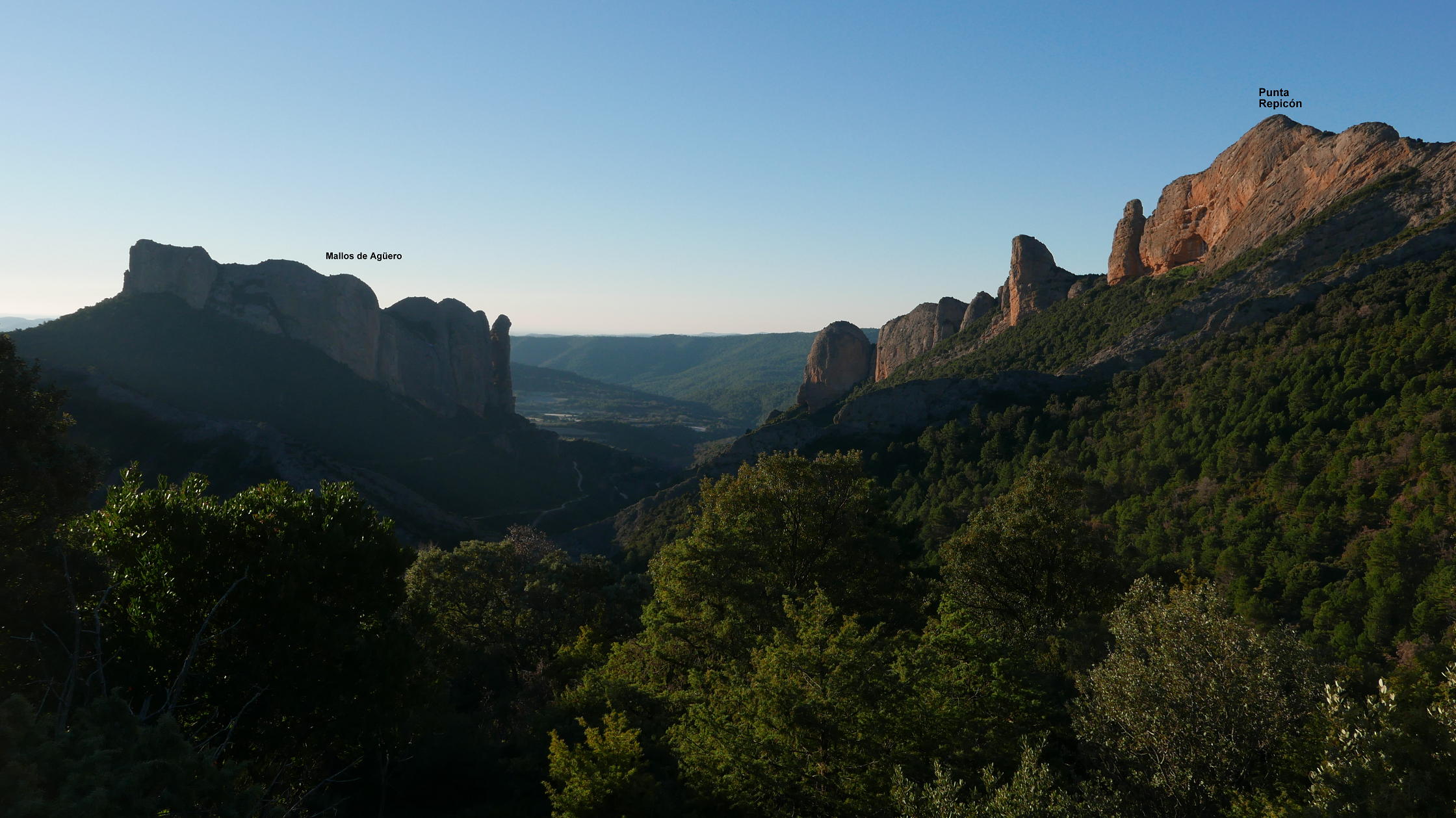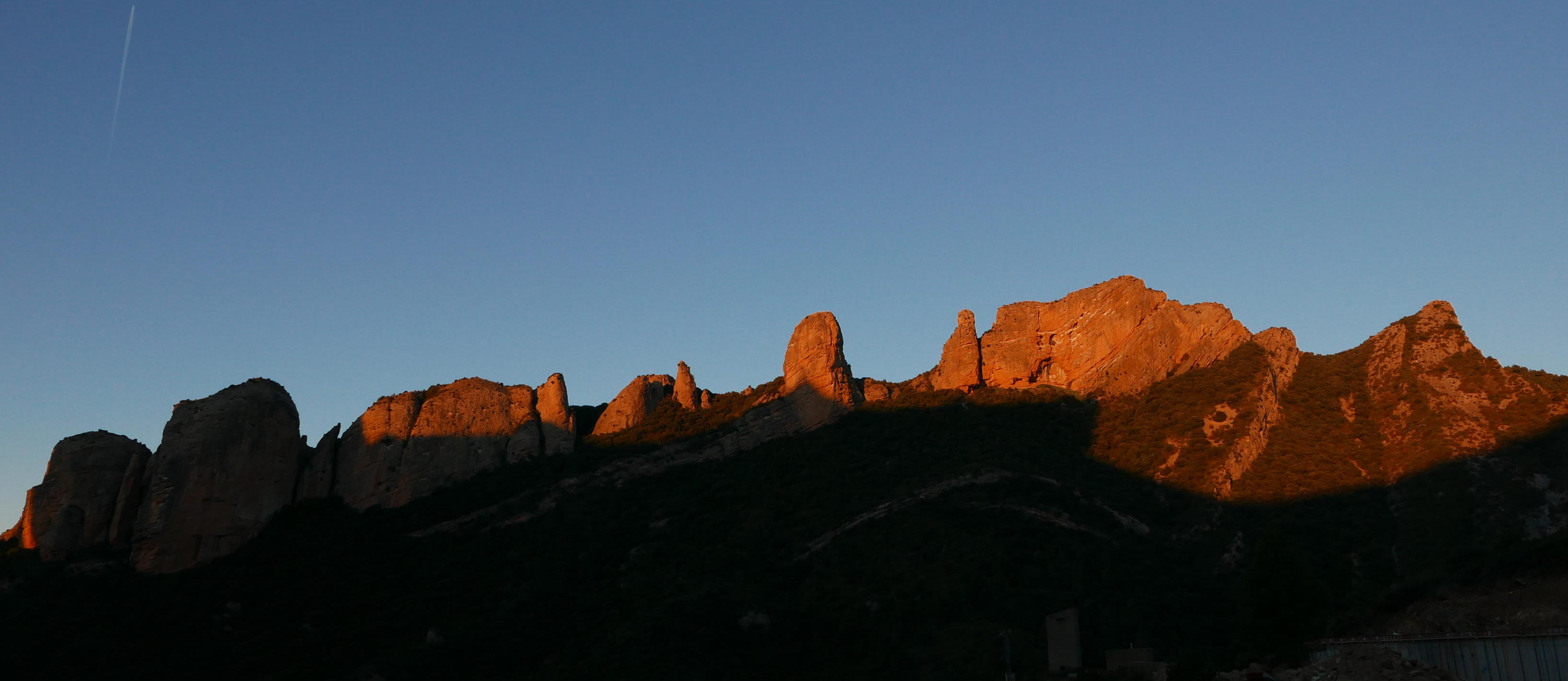 Pasadas las obras está la cueva Al-Foraz (745m 0h35′). A mi izquierda se van iluminando las puntas de los mallos occidentales que luego subiré. Se pasa una portilla y enseguida tengo que dejar el sendero e irme a la izquierda (725m 0h41′) para bajar a cruzar el barranco Castillo Mango. Esta senda tiene algún hito y alguna marca de pintura blanca. Tras el barranco empieza a subir entre carrasca hasta desembocar en una pista en la collada Abadía (925m 1h17′).