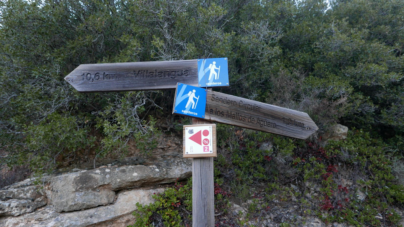 Descripción del recorrido: Desde el aparcamiento (660m) retrocedo unos metros por la carretera y subo por una calle empinada con un cartel «Ruta alrededor de los mallos y cueva Al-Foraz». Inicio esta ruta circular en sentido horario. El camino pasa junto a una casa rural, tras la cual sale un camino con escaleras a la derecha y, más arriba, llega a una bifurcación que tomo a la izquierda dirección Villalangua (720m 0h11′). El camino es bastante llano. LLega hasta una zona de obras donde parece que están haciendo un depósito de agua. Allí sigo a la izquierda (735m 0h38′) y a la vuelta llegaré a este punto para tomar el camino hacia arriba que ahora queda a mi derecha.