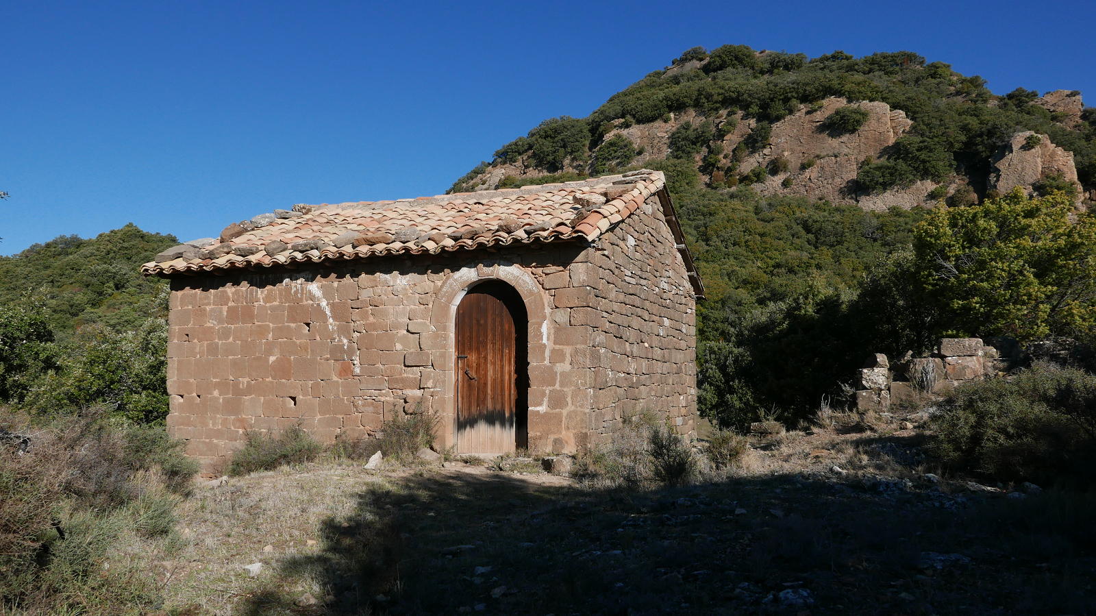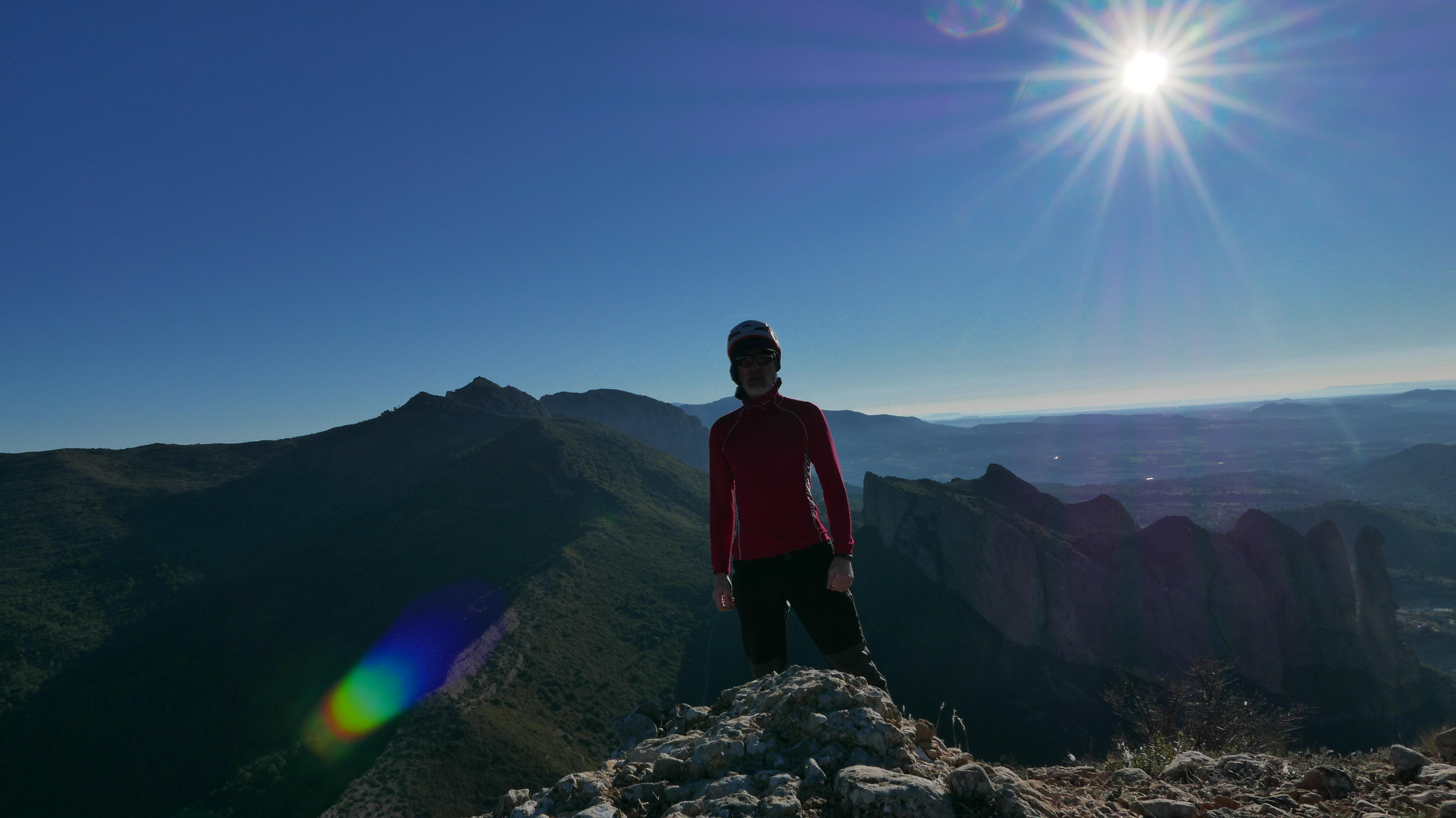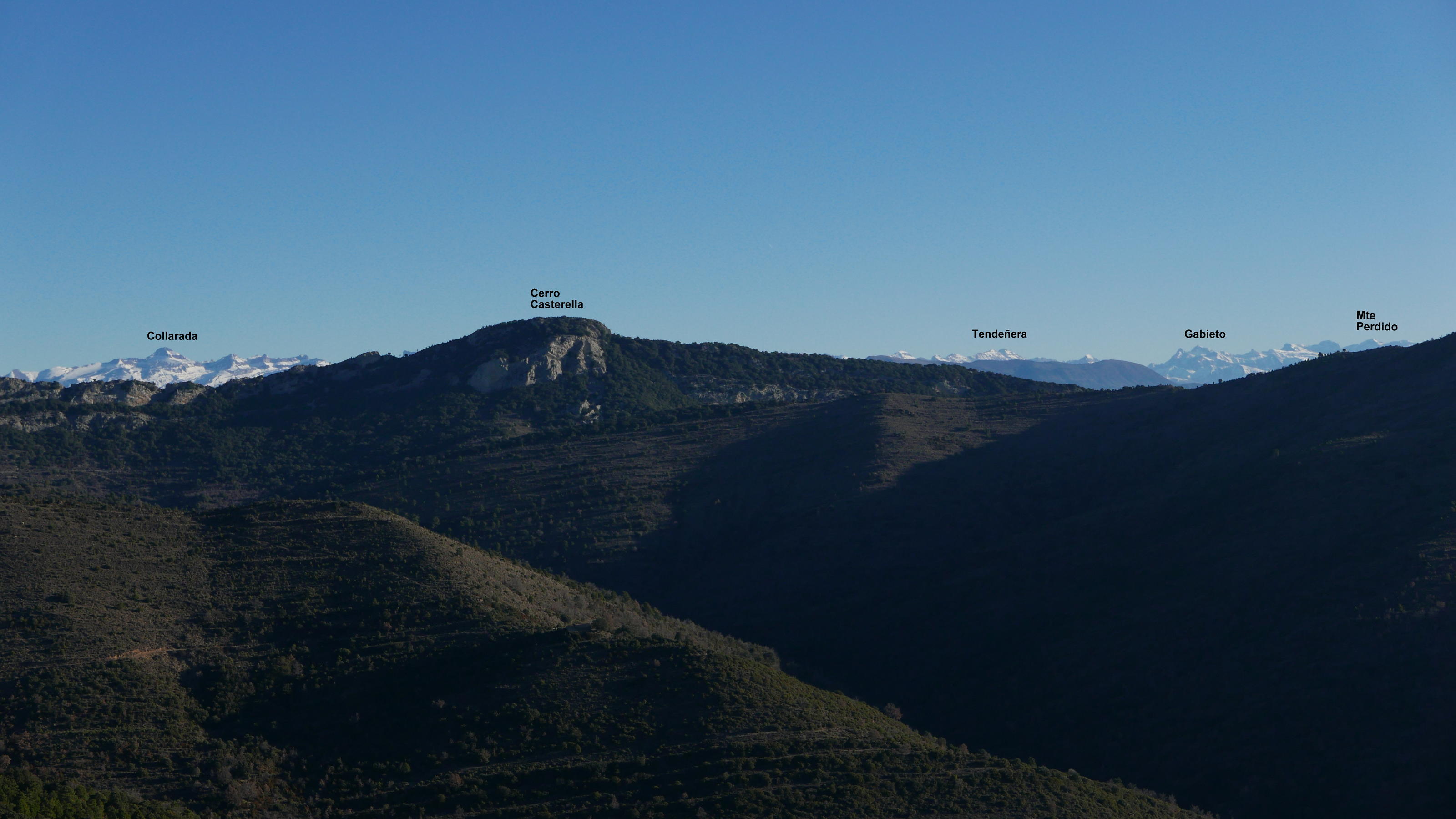 Regreso hasta la collada Abadía (930m 2h35′) y sigo la pista hacia la derecha. En una curva a la izquierda (940m 2h42′) tomo una bifurcación a la izquierda y luego otra vez a la izquierda hacia ermita de San Esteban (960m 2h45′). Es un camino en subida hasta una explanada de hierba a cuya izquierda está la ermita de San Esteban (1000m 2h49′). Desde la explanada se toma a la derecha una senda oculta por la vegetación. Es muy difusa, hay algún hito. En un momento hay que dejar la senda con hitos y tirar a la derecha (1035m 2h59′) con fuerte pendiente hacia arriba. Aprovechando las repisas de los estratos rocosos y entre carrasca (también algún hito) hasta la cima del Cerro Castellazo (1097m 3h07′).