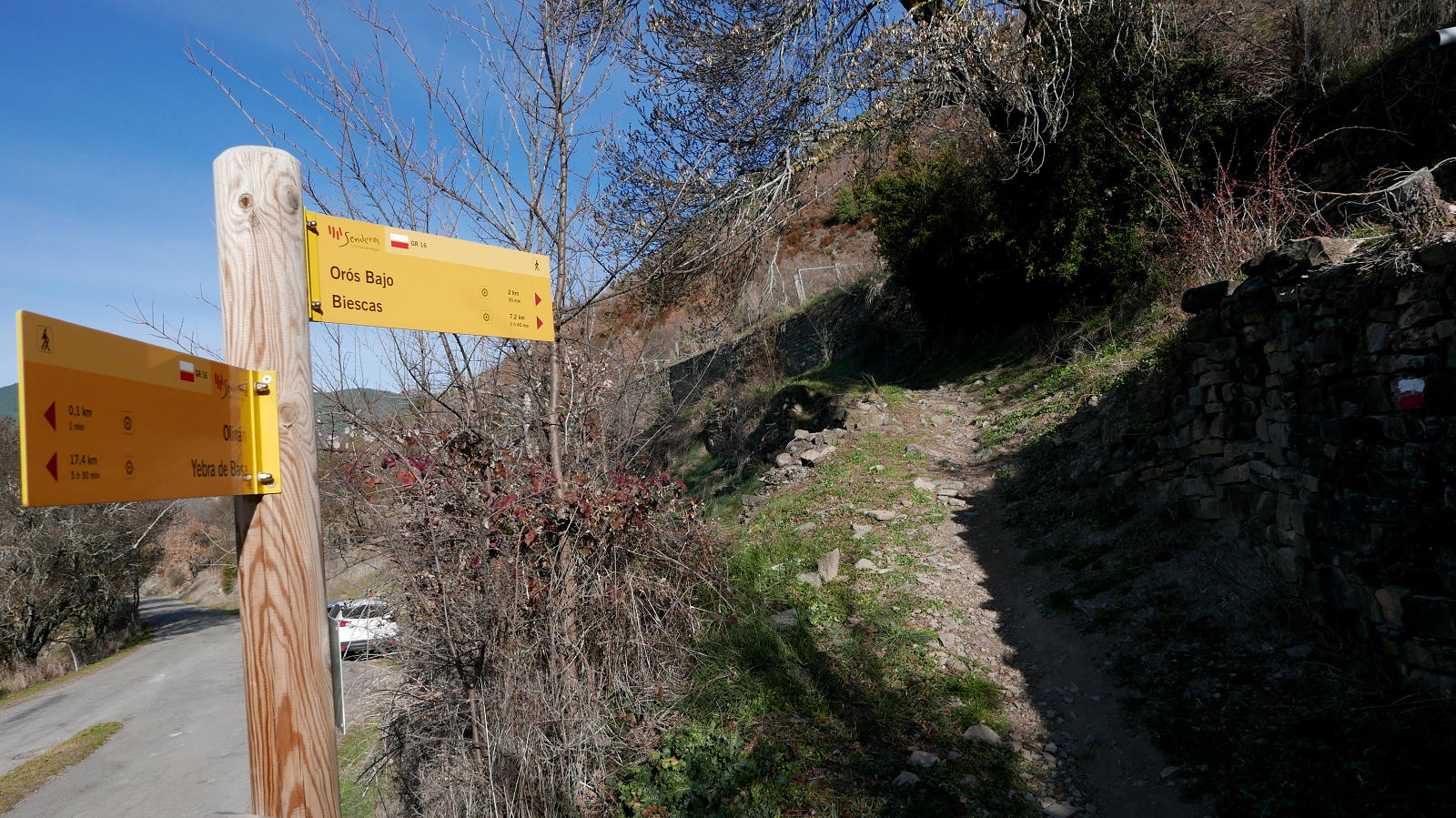 Acceso: En la N-260, de Sabiñánigo a Biescas, entre los KM 511-510, se toma a la derecha la carretera a Oliván. El cartel de entrada al pueblo está al llegar a unas granjas, pero aún hay que seguir 1,5km más para llegar a la entrada del pueblo donde aparcamos.