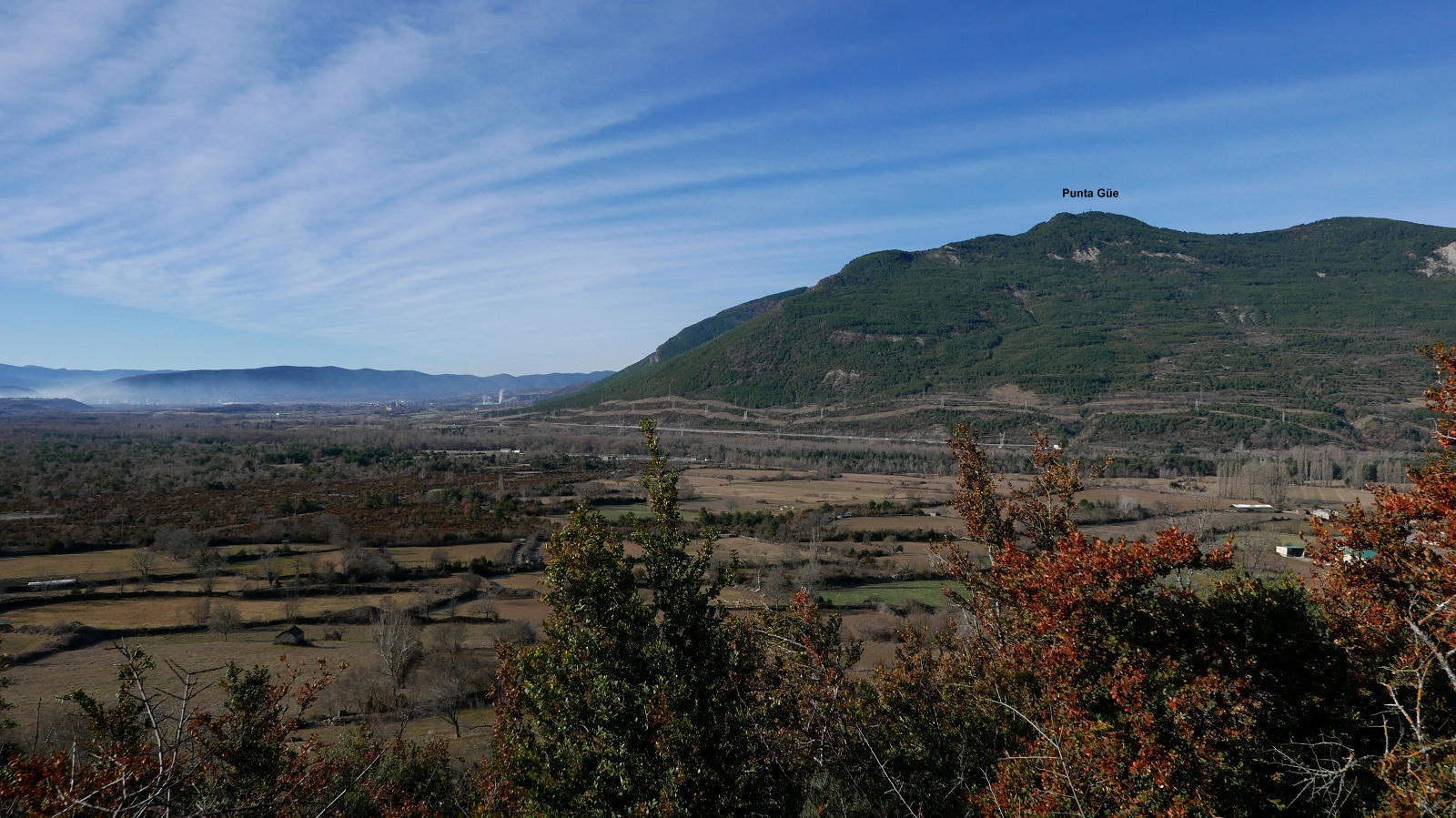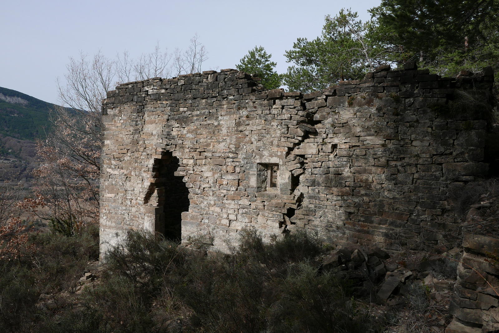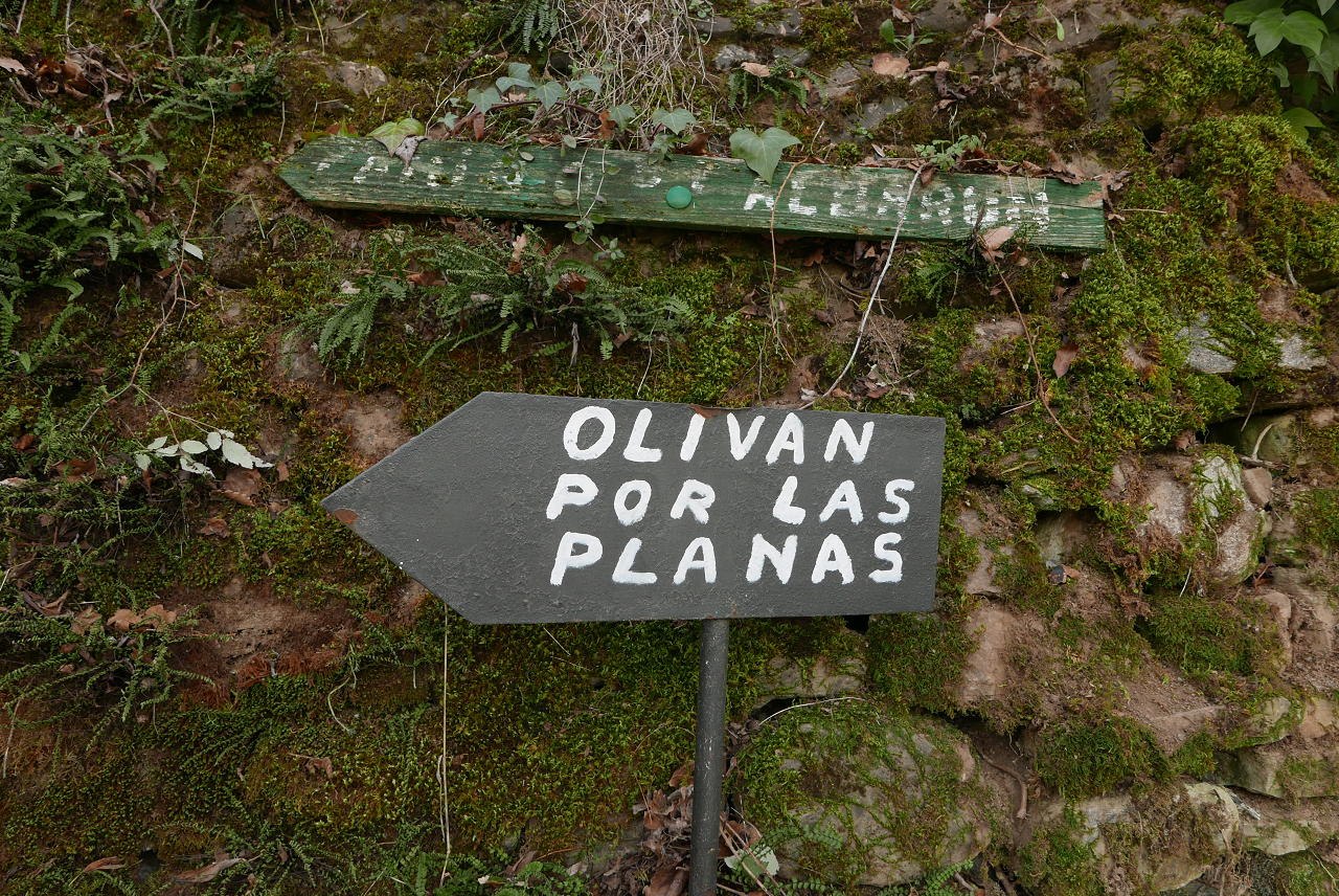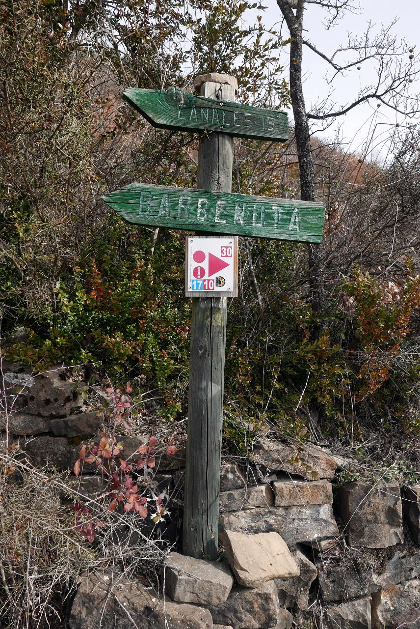 Esta agradable senda por bosque de pino y boj, señalizada como PR y con algún hito, nos lleva, pasando junto a la ermita en ruinas de la Virgen de las Canales (980m 2h21′), al GR-16 donde el cartel de Barbenuta que habíamos dejado a la ida. Y desde allí otra vez a Oliván (895m 2h39′)