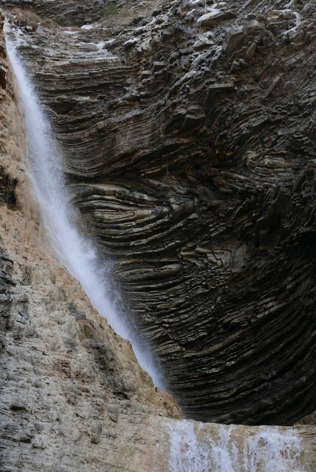 El sendero asciende junto a la orilla derecha del barranco de Lucas. Primero hay una cascada que desagua una presa. Después se avanza sobre una ladera muy pendiente y erosionada, buscando los mejores pasos, aunque a veces hay que superar algún resalte en que debemos asegurar bien los pasos. Pero la recompensa merece la pena al llegar a la cascada de Orós Bajo (940m 0h57′) encajada en un enclave espectacular.