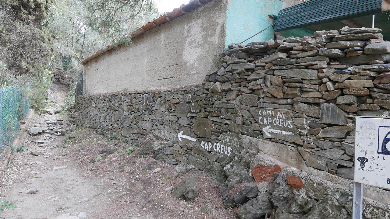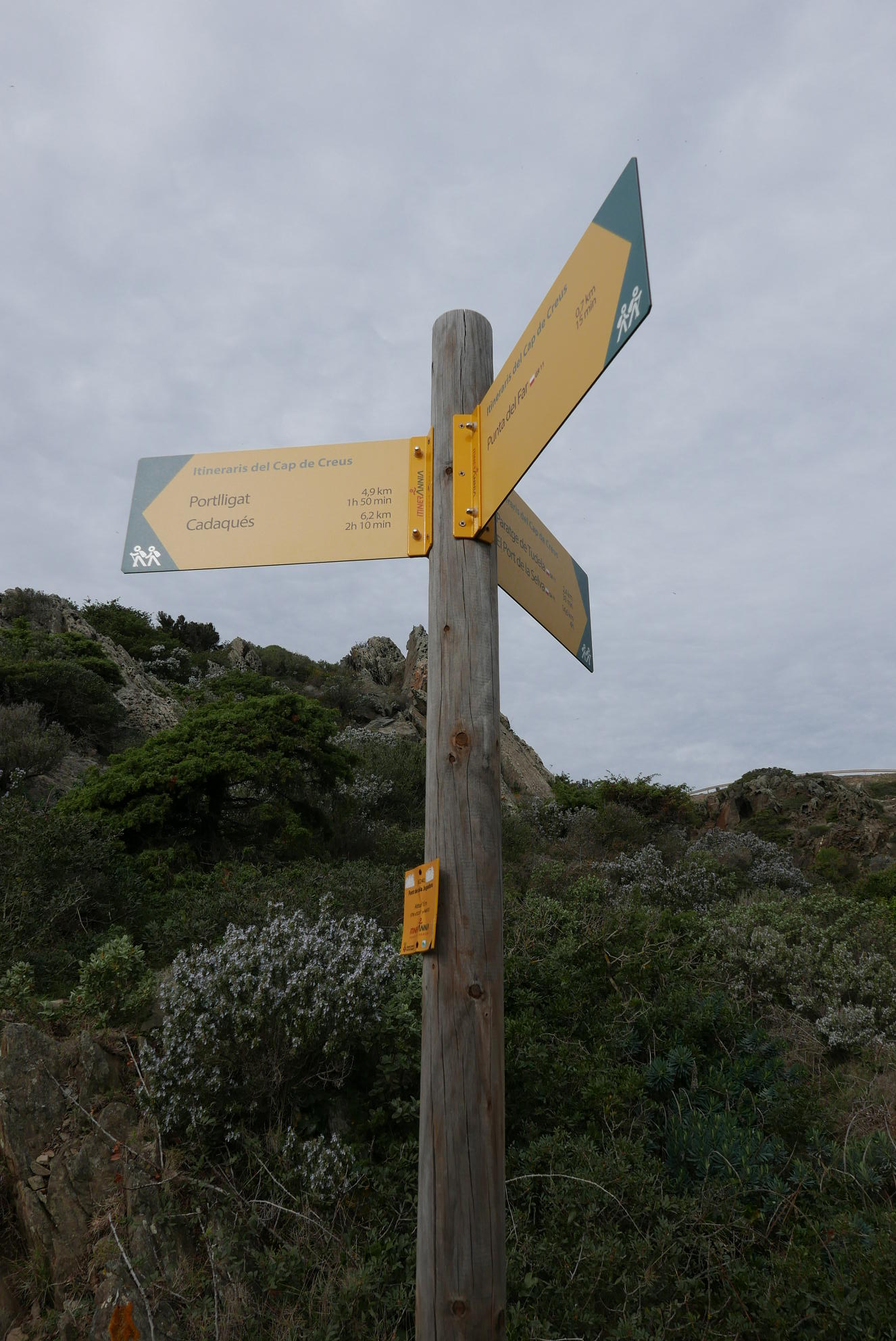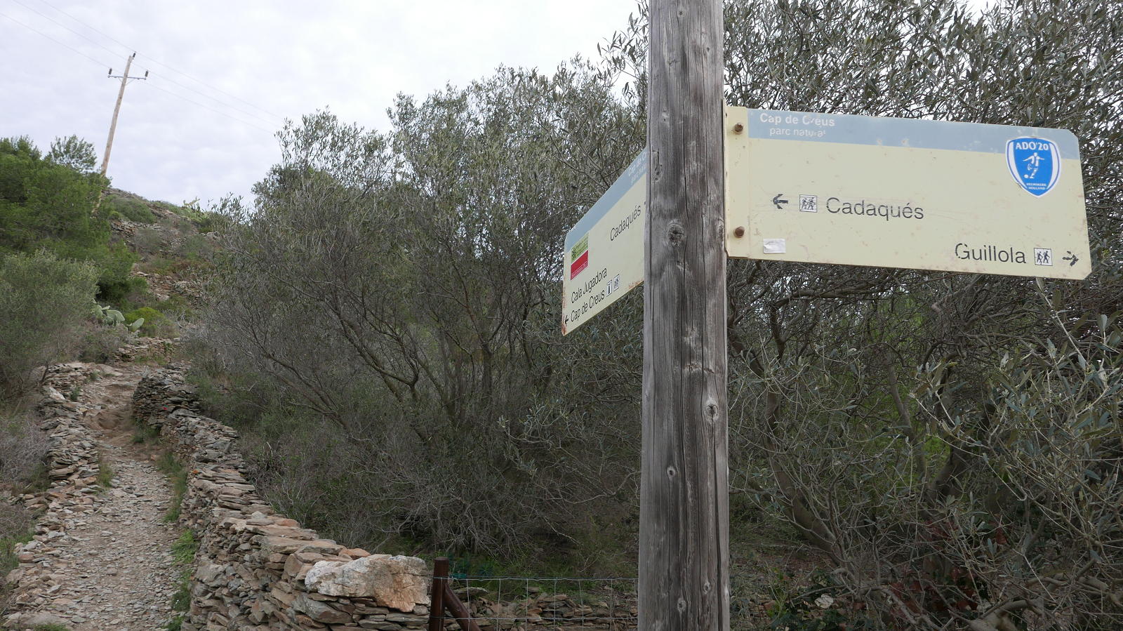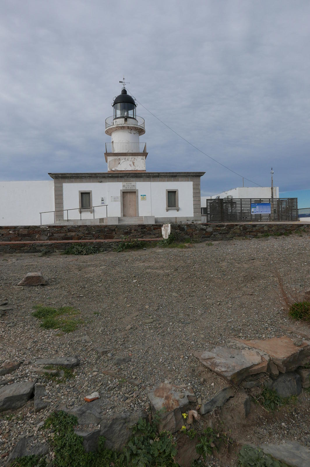 La playa de Guillola (2m 1h16′) es una tranquila calita de guijarros donde almorzamos. Seguimos la senda que asciende entre terrazas de campos de olivos y chumberas hacia el oeste, siendo un tramo de camino sin señalizar. Al fin sale al Camí Antiq (35m 1h58′) con las pintura roja y verde, tomándolo hacia la derecha. Hay una bifurcación que seguimos a la izquierda (50m 2h04′), con pintura, mientras que la rama de la derecha tiene un hito. Nuestro ramal sale a una pista (70m 2h09′)(cartel de dirección y ubicación Sota Puig Pelegrí) que llega al punto donde cerramos el círculo (desvío a playa Guillola) y volvemos a tomar la senda, ahora a la izquierda, que indica con hacia el Cap de Creus. Terminamos con la fuerte subida enlosada al faro del Cap de Creus (80m 3h08′)