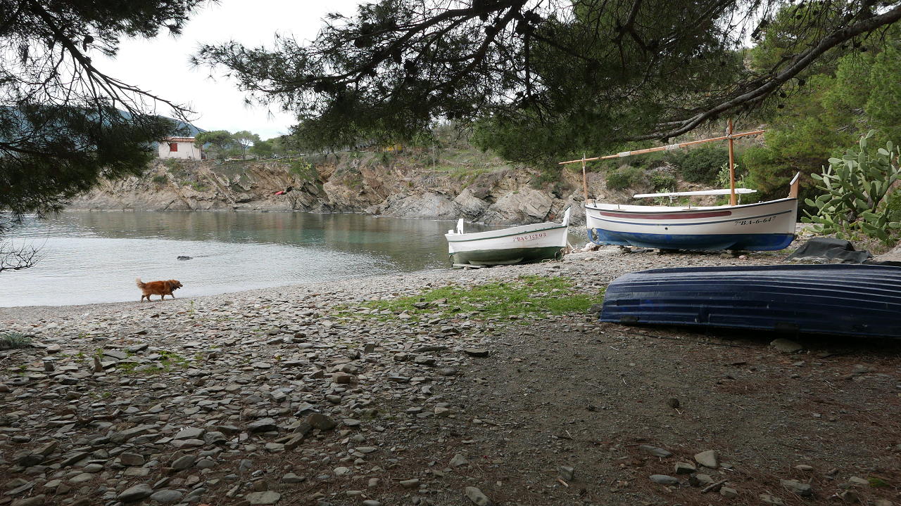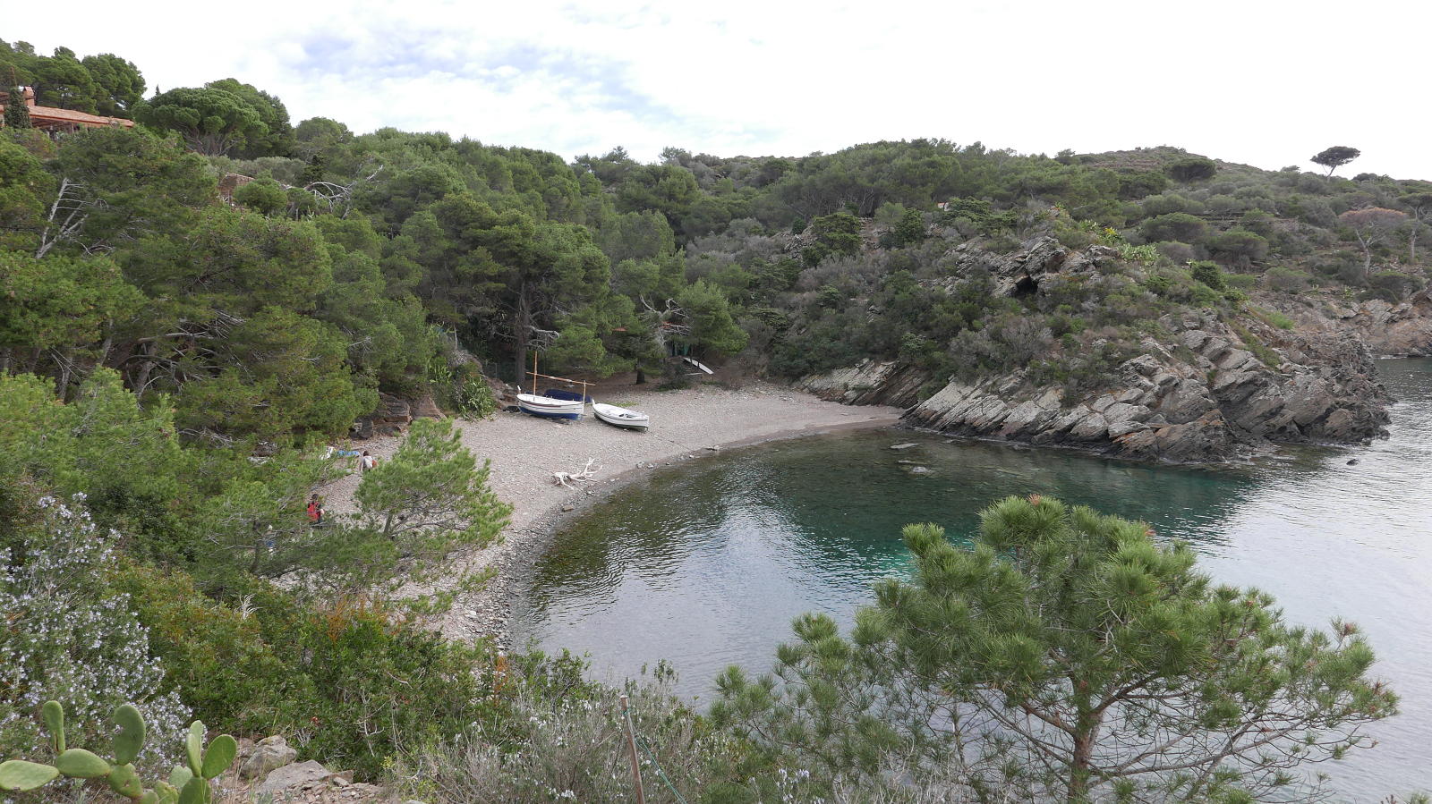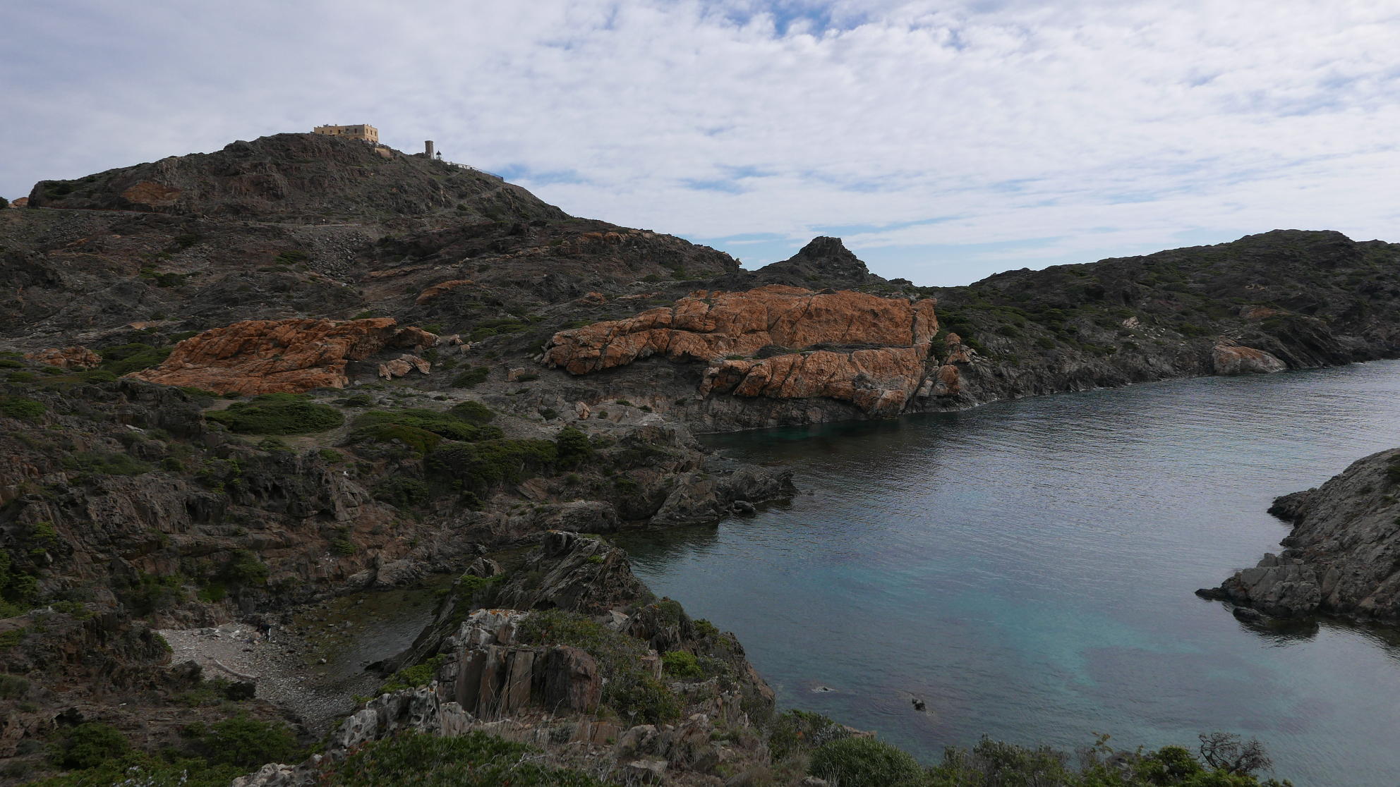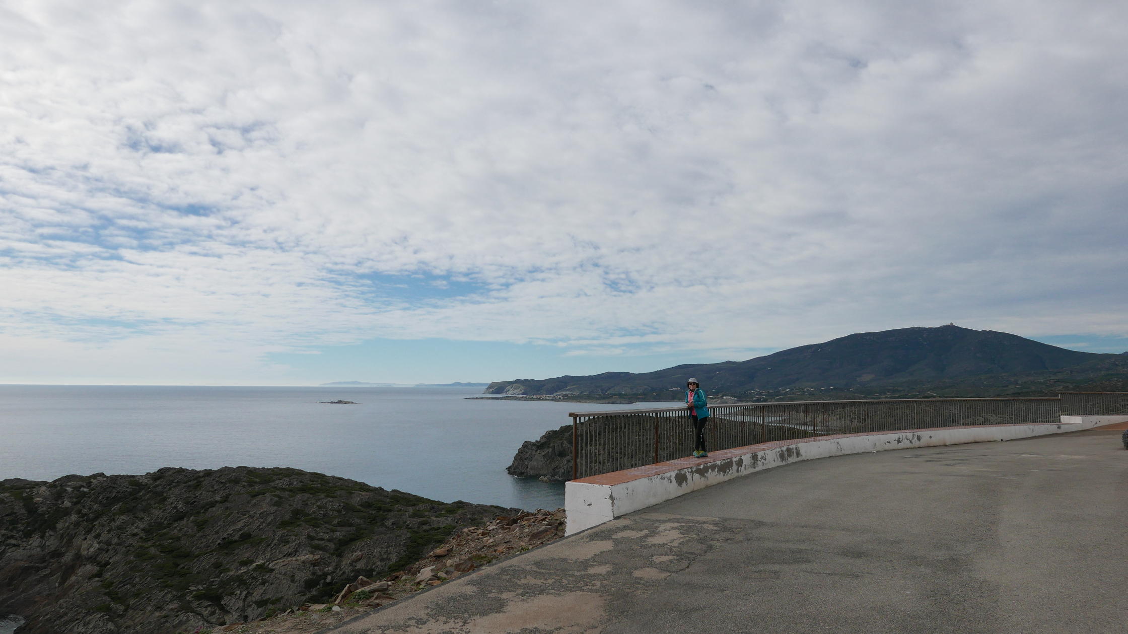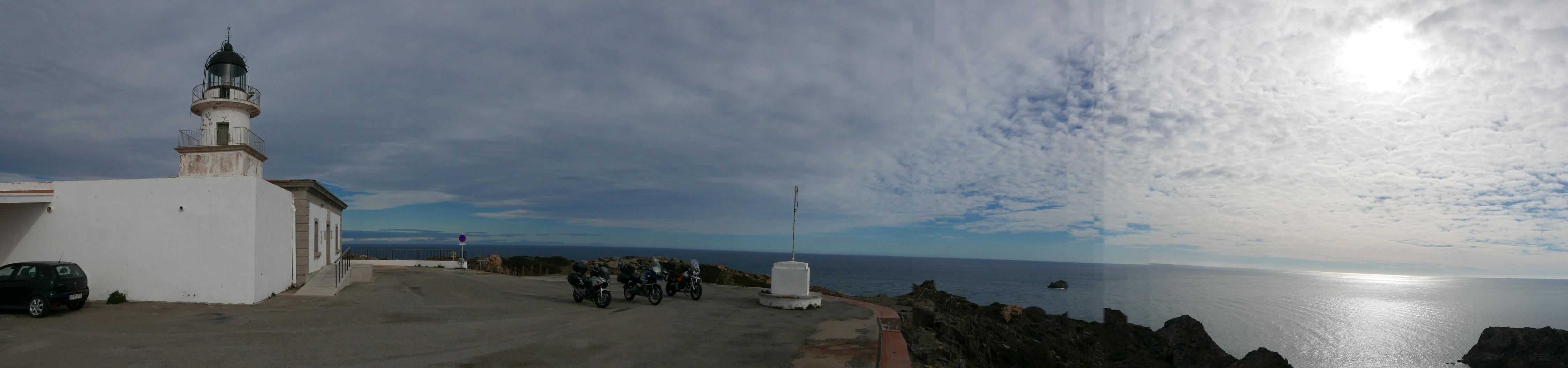 La playa de Guillola (2m 1h16′) es una tranquila calita de guijarros donde almorzamos. Seguimos la senda que asciende entre terrazas de campos de olivos y chumberas hacia el oeste, siendo un tramo de camino sin señalizar. Al fin sale al Camí Antiq (35m 1h58′) con las pintura roja y verde, tomándolo hacia la derecha. Hay una bifurcación que seguimos a la izquierda (50m 2h04′), con pintura, mientras que la rama de la derecha tiene un hito. Nuestro ramal sale a una pista (70m 2h09′)(cartel de dirección y ubicación Sota Puig Pelegrí) que llega al punto donde cerramos el círculo (desvío a playa Guillola) y volvemos a tomar la senda, ahora a la izquierda, que indica con hacia el Cap de Creus. Terminamos con la fuerte subida enlosada al faro del Cap de Creus (80m 3h08′)