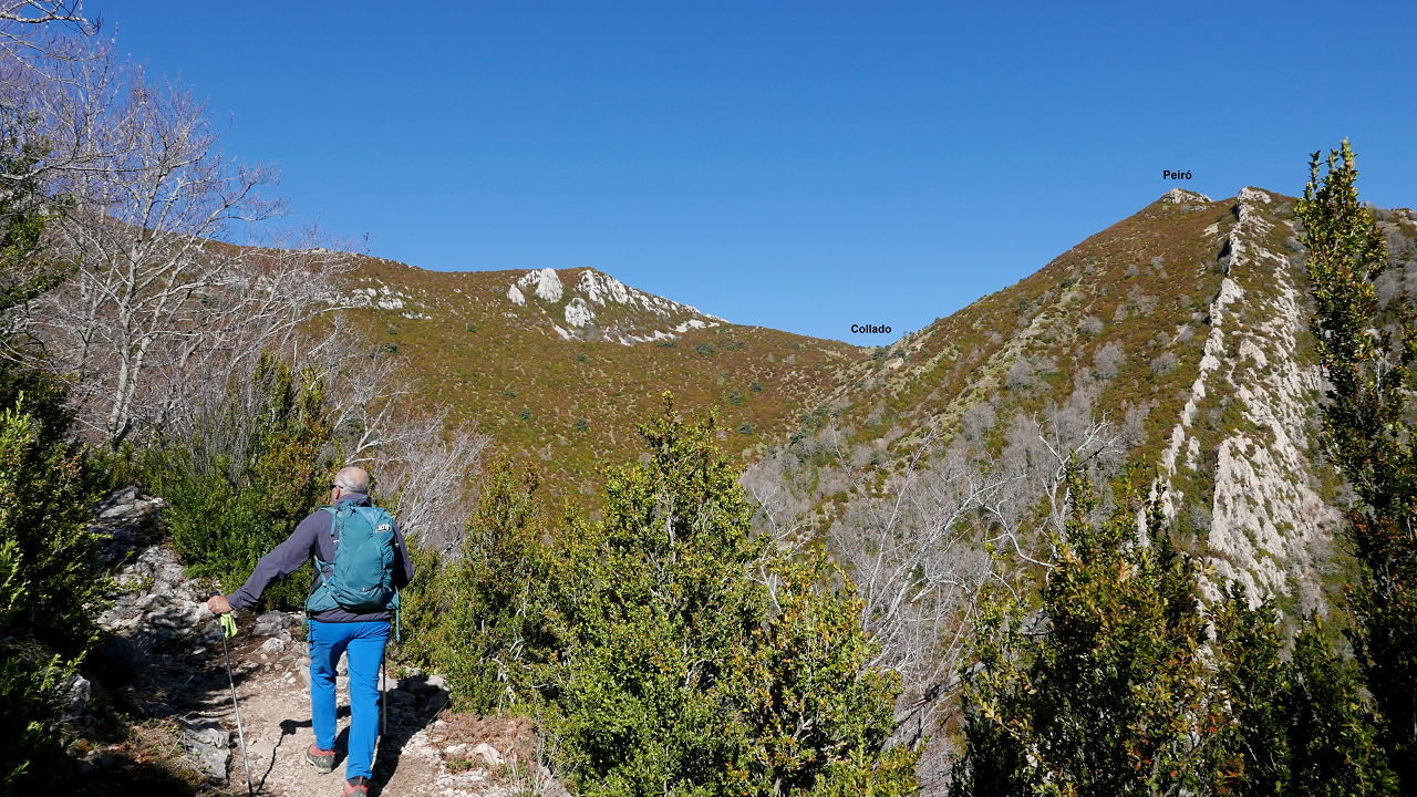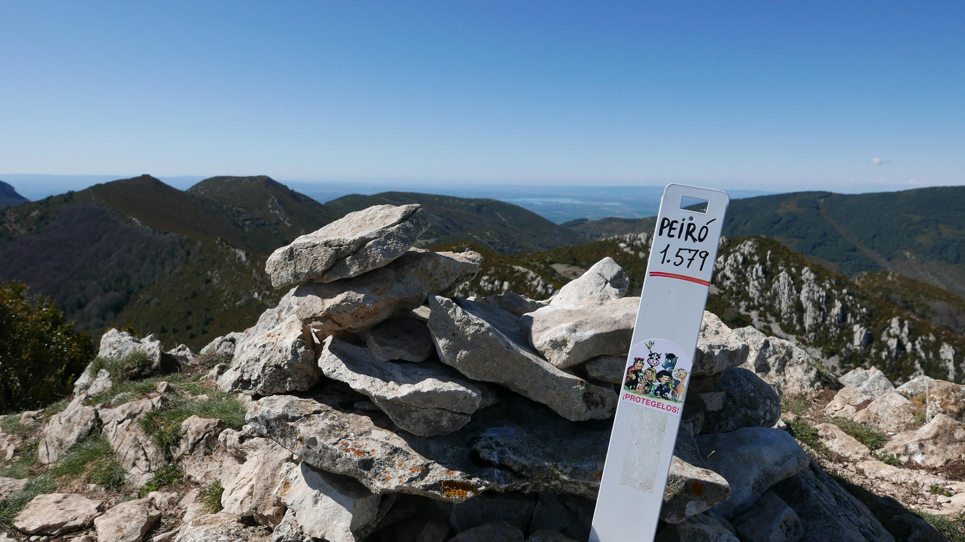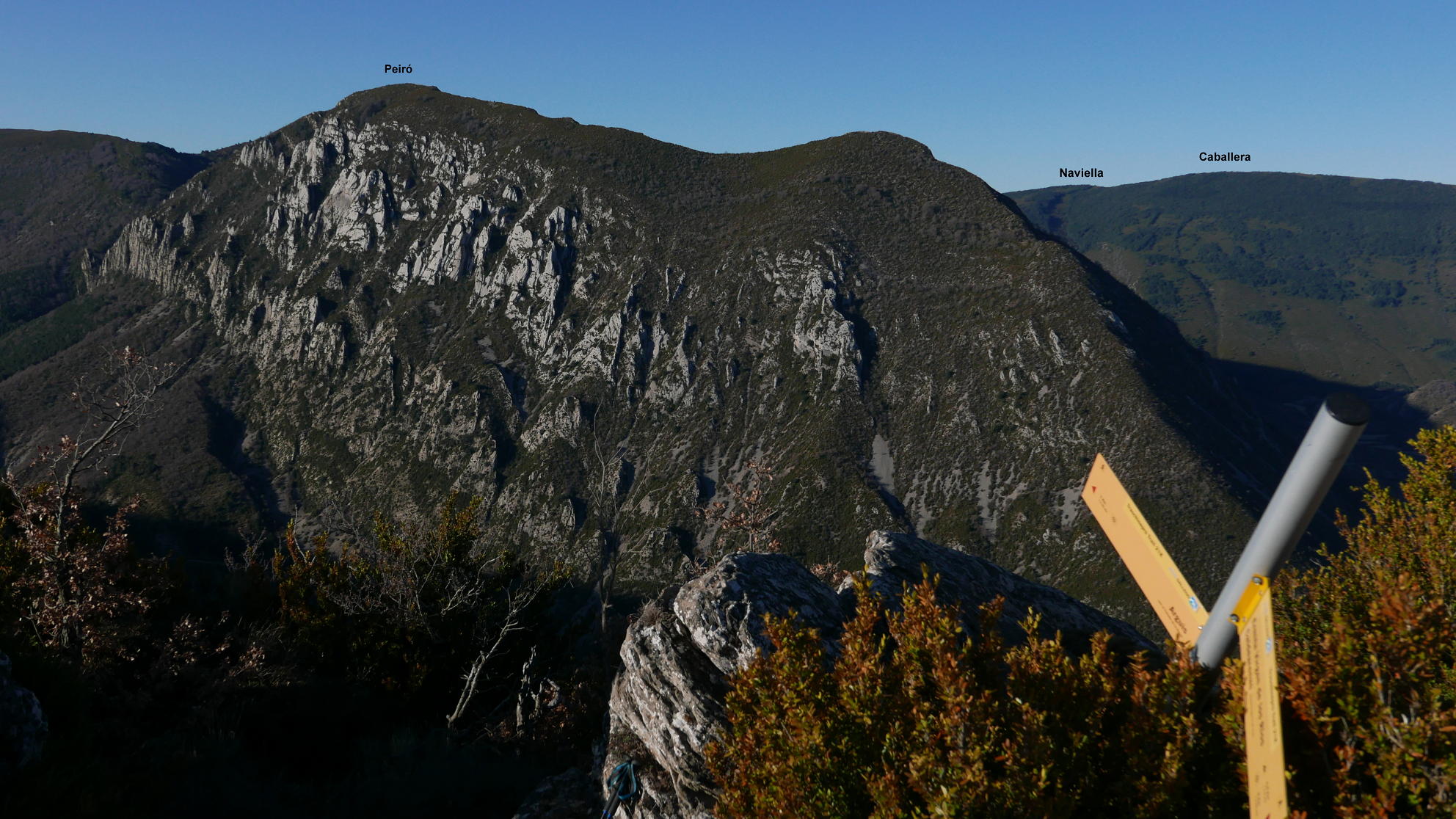 Se llega a una bifurcación (1370m 0h28′). A la izquierda hacia el collado Sarramiana y recto hacia el Peiró (y ahora pone que faltan 2.8km ¡está más lejos que cuando empezamos!). El camino vuelve a tener un poco más de pendiente y, por terreno cada vez más abierto, nos lleva al collado que desciende a Bentué de Rasal (1490m 0h46′). A nuestra derecha se alza el Peiró. Una sendilla entre los erizones sube zigzaguenado hasta el pico (Peiró 1579m 1h07′). Misma ruta de descenso (aparcamiento 1140m 1h50′)