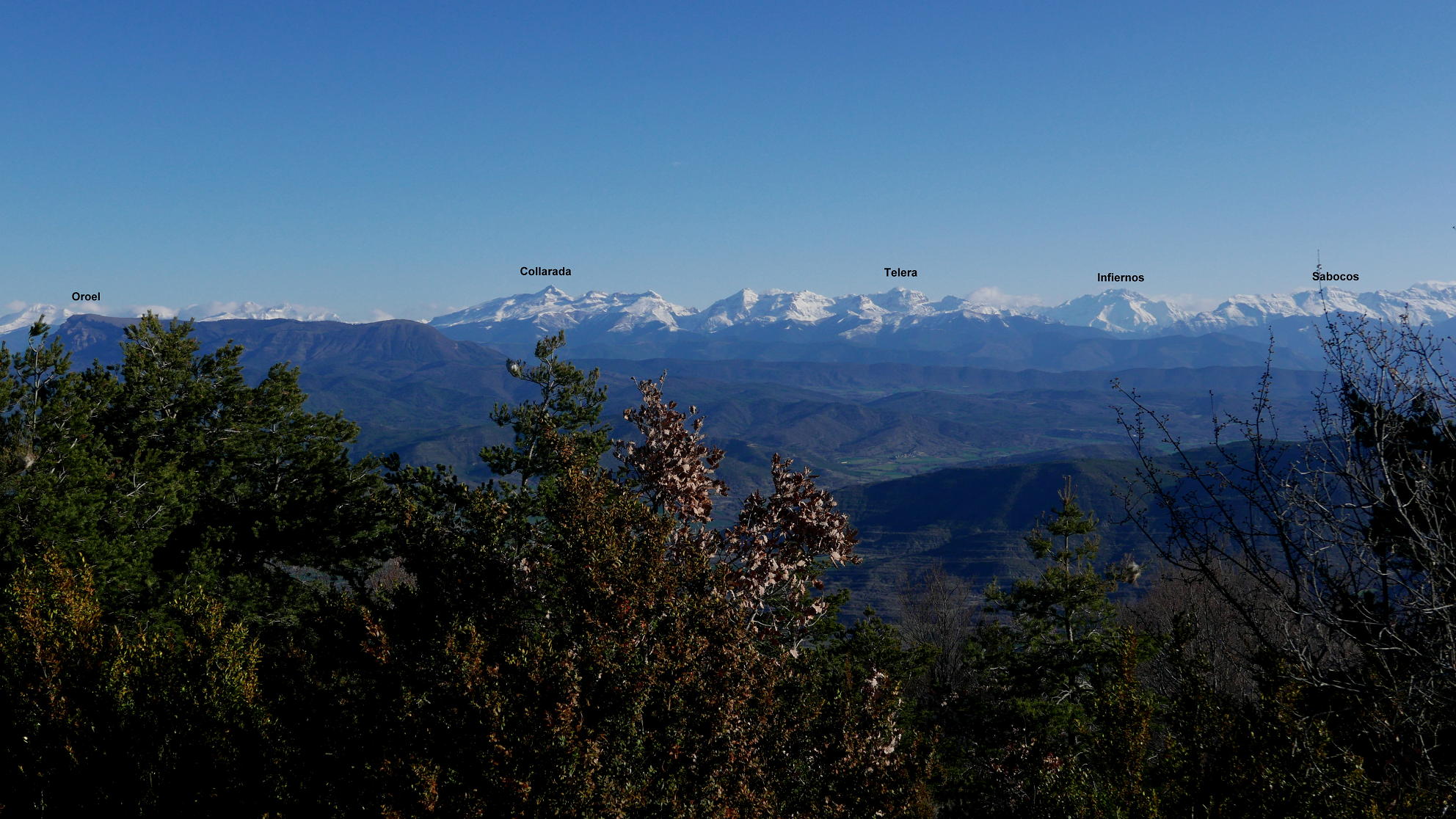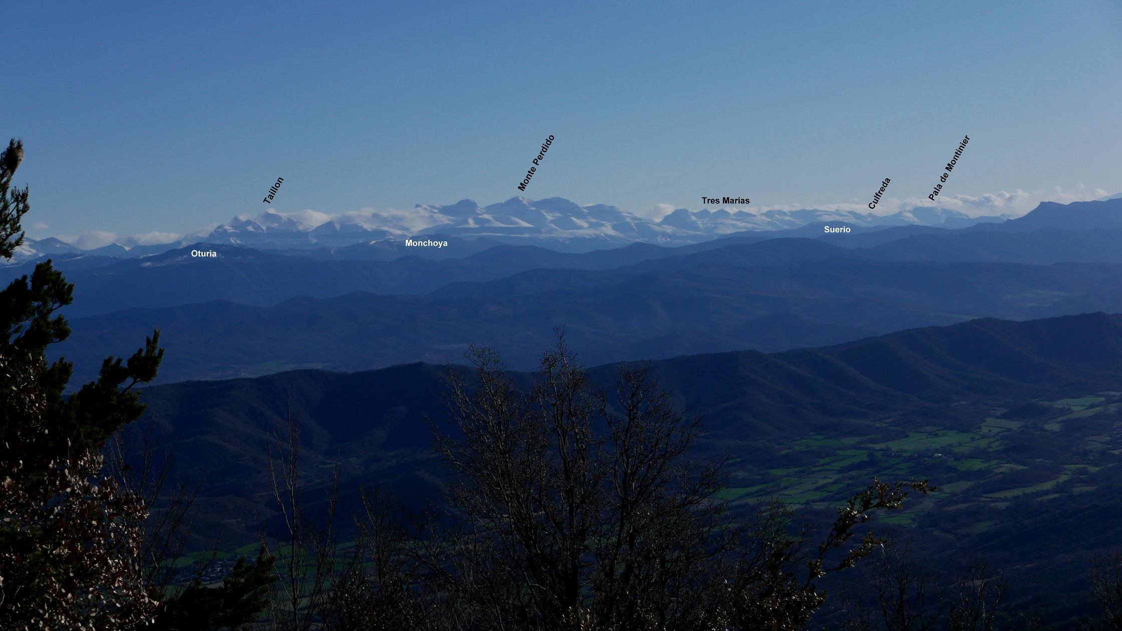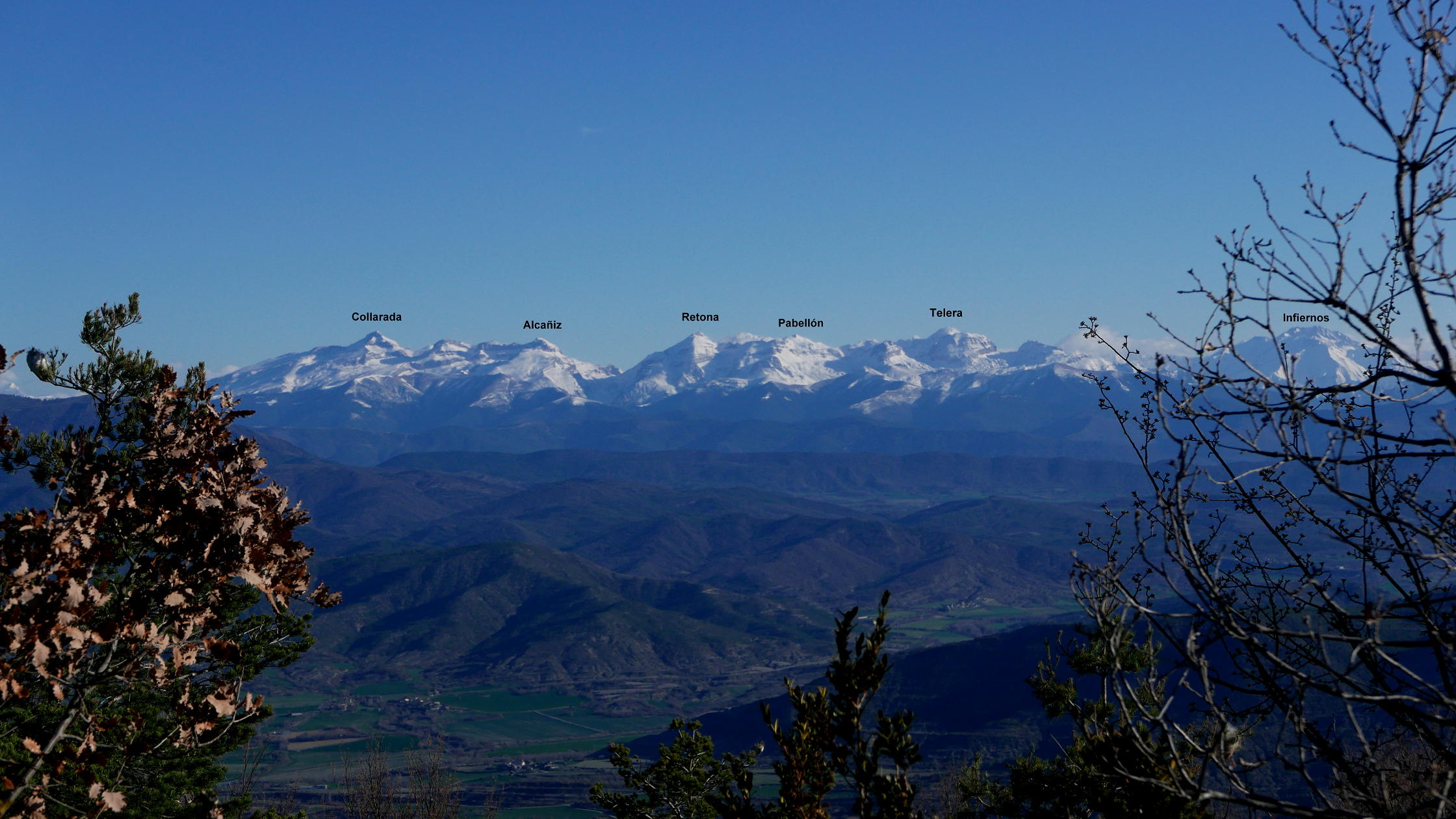 Aprovechamos un domingo sumamente frío para estar ya en abril (-6ºC al empezar), pero soleado y sin viento. Las vistas del Pirineo desde ambas montañas son espléndidas.
