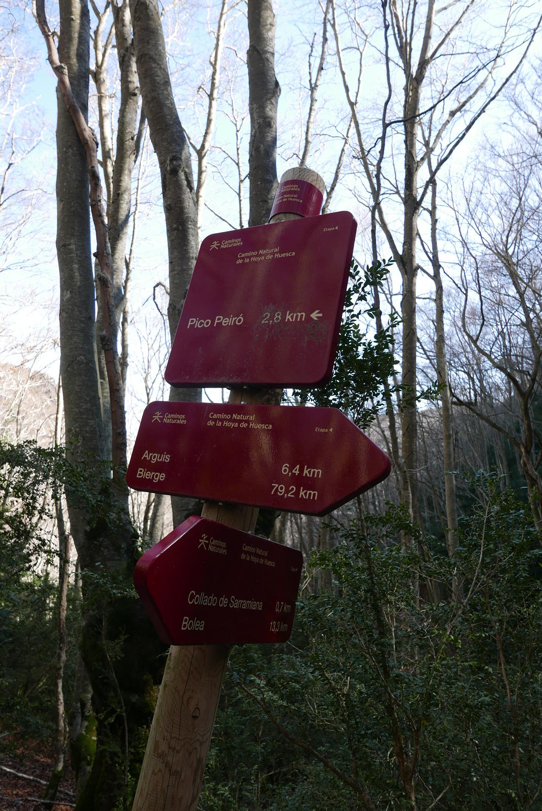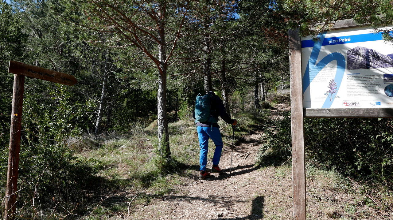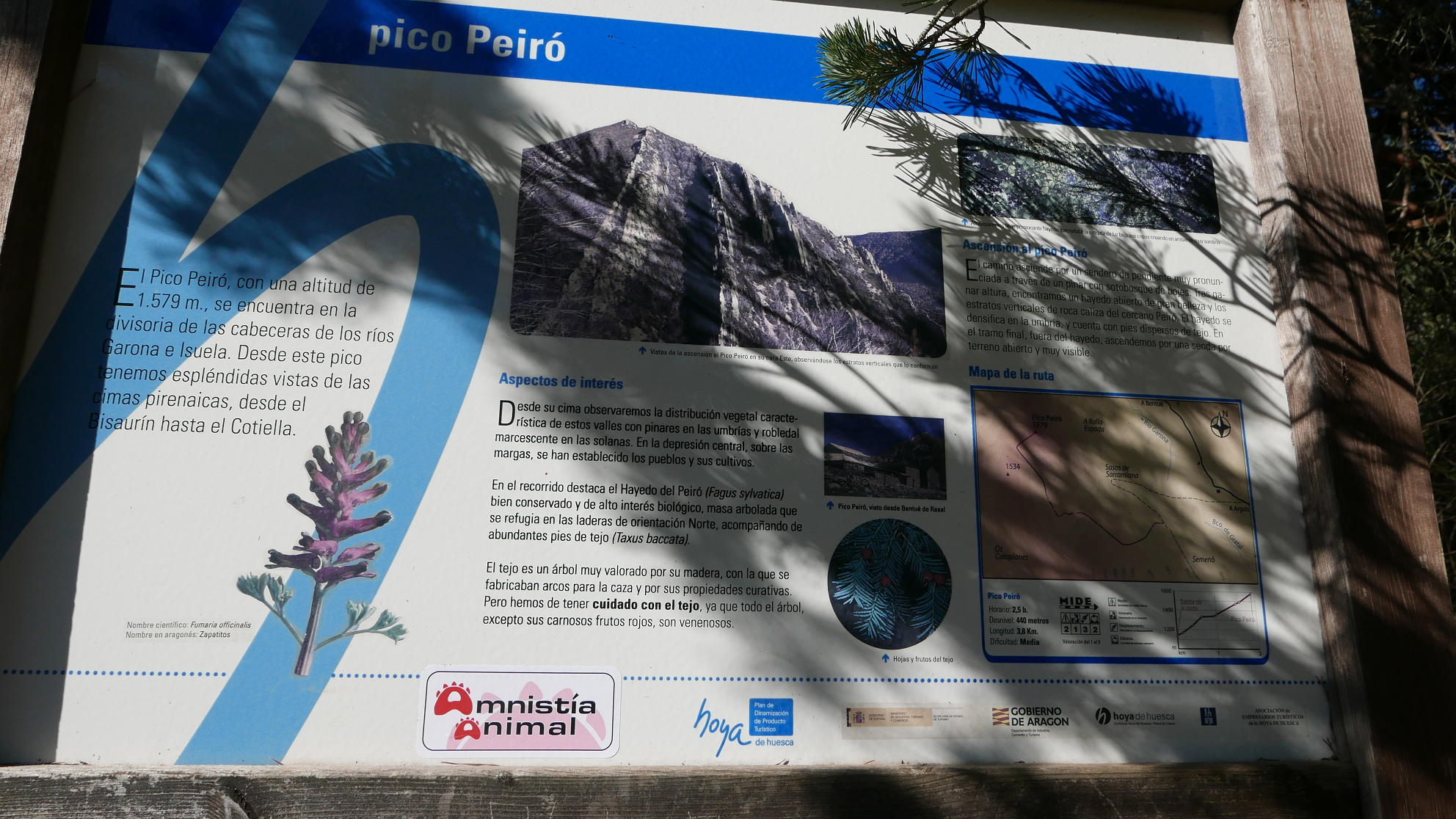 Acceso: Desde el collado Labarza recorremos unos metros hacia Arguis y tomamos una pista a la derecha (oeste) con carteles de madera indicando el Peiró. Se toma una bifurcación a la derecha que lleva al inicio del camino al Peiró (panel de información y cartel de dirección). Pista en condiciones para pasar con cualquier vehículo.