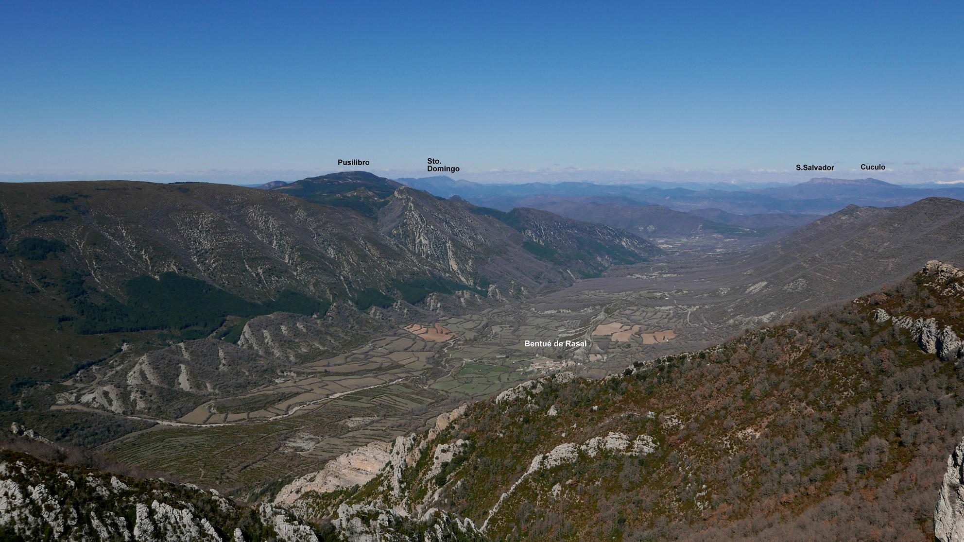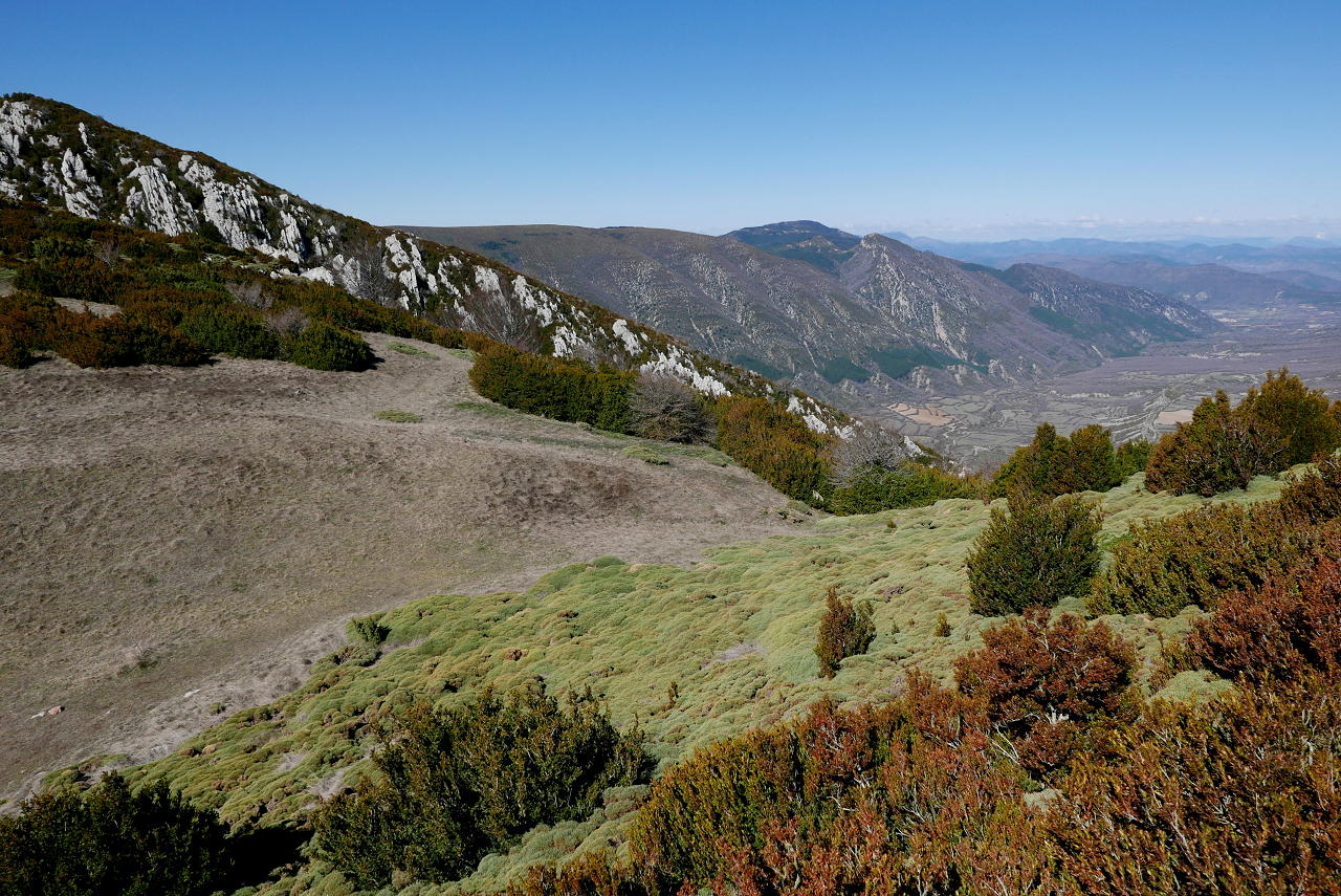 Aquí ya tenemos una magnífica vista de la Peña Oroel y del Pirineo, y también de la continuación de la cresta hasta el Presín. Accedemos al vértice geodésico sin ninguna dificultad (Presín 1432m 1h14′) y descendemos por el mismo camino al punto de partida (collado Labarza 1125m 2h20′)