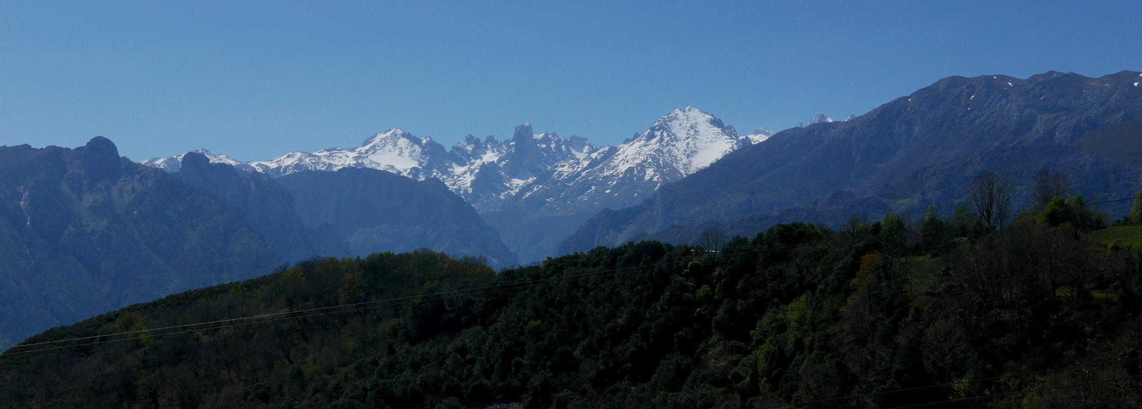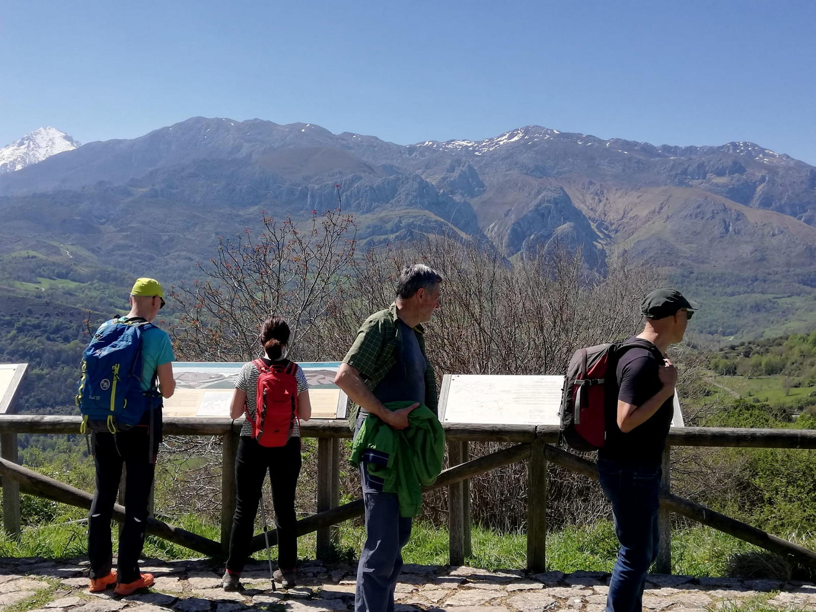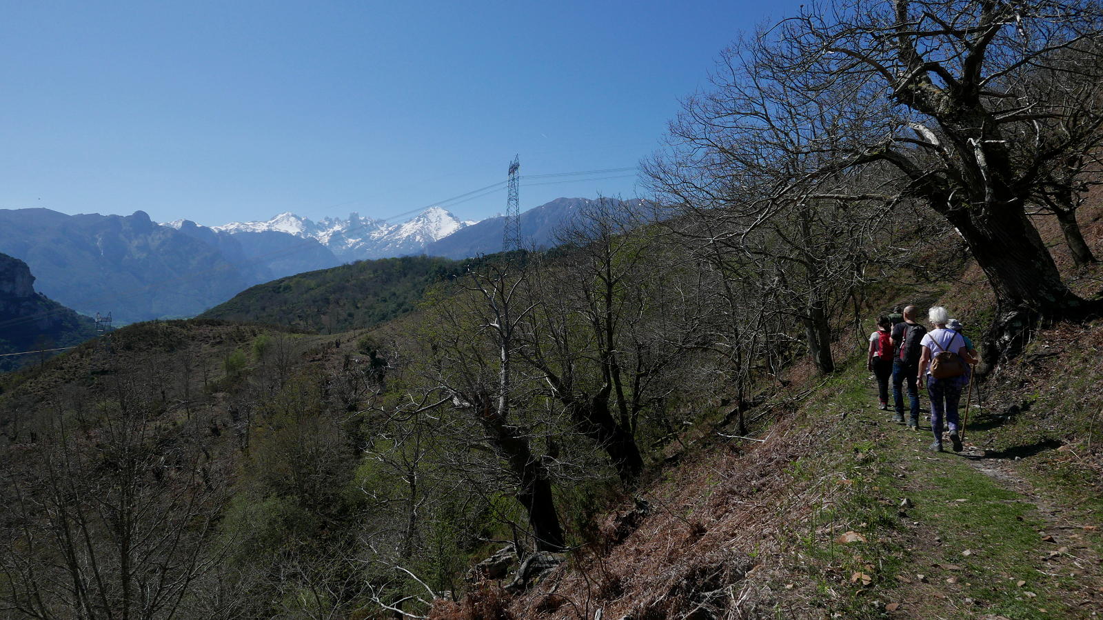 Mi primera intención era subir el pico Torbina, máxima cota de la sierra del Cuere, pero se han metido las nieblas en la zona costera de Llanes y el Torbina queda completamente cubierto. Además, como es una excursión con un grupo diverso, parece preferible una salida senderista suave que todos podamos hacer cómodamente. Para este objetivo esta ruta es un acierto y, además, salimos de la niebla y disfrutamos de una mañana de sol espléndida, cielos despejados y espectaculares vistas de los Picos de Europa todavía nevados.