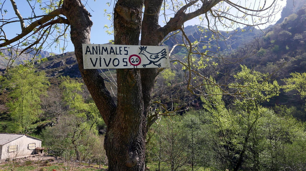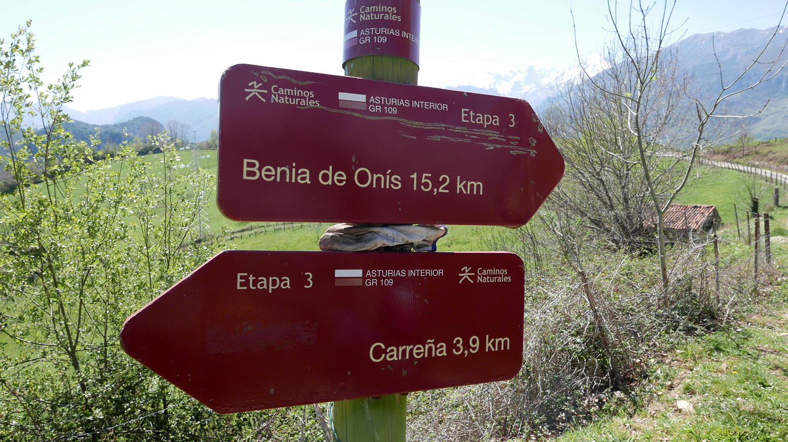Descripción de la ruta: Aparcamos a la entrada del pueblo de Carreña (185m) por el oeste, aunque luego veo que un poco más adelante, a la salida por el este, hay un área de aparcamiento estupenda. Seguimos la calle de la carretera general y, pasado el arroyo de la Ría; tomamos la calle a la izquierda (norte) que sube a la plaza del Ayuntamiento y ermita de la Virgen de la Salud. Siempre hacia el norte vamos saliendo del pueblo y cruzamos por un puente el arroyo de la Ría, para seguir una pista por su orilla derecha. Aún quedan algunas casas hasta salir definitivamente de Carreña. Hay señales de pintura roja y blanca del GR-109 (que va desde Panes hasta hasta Santalla, recorriendo 606 km de Cordillera Cantábrica; nuestra ruta seguirá parte de este GR en su etapa Carreña-Benia de Onís)