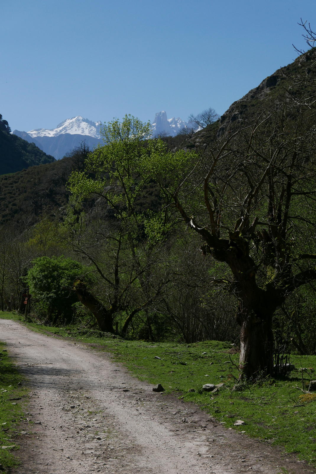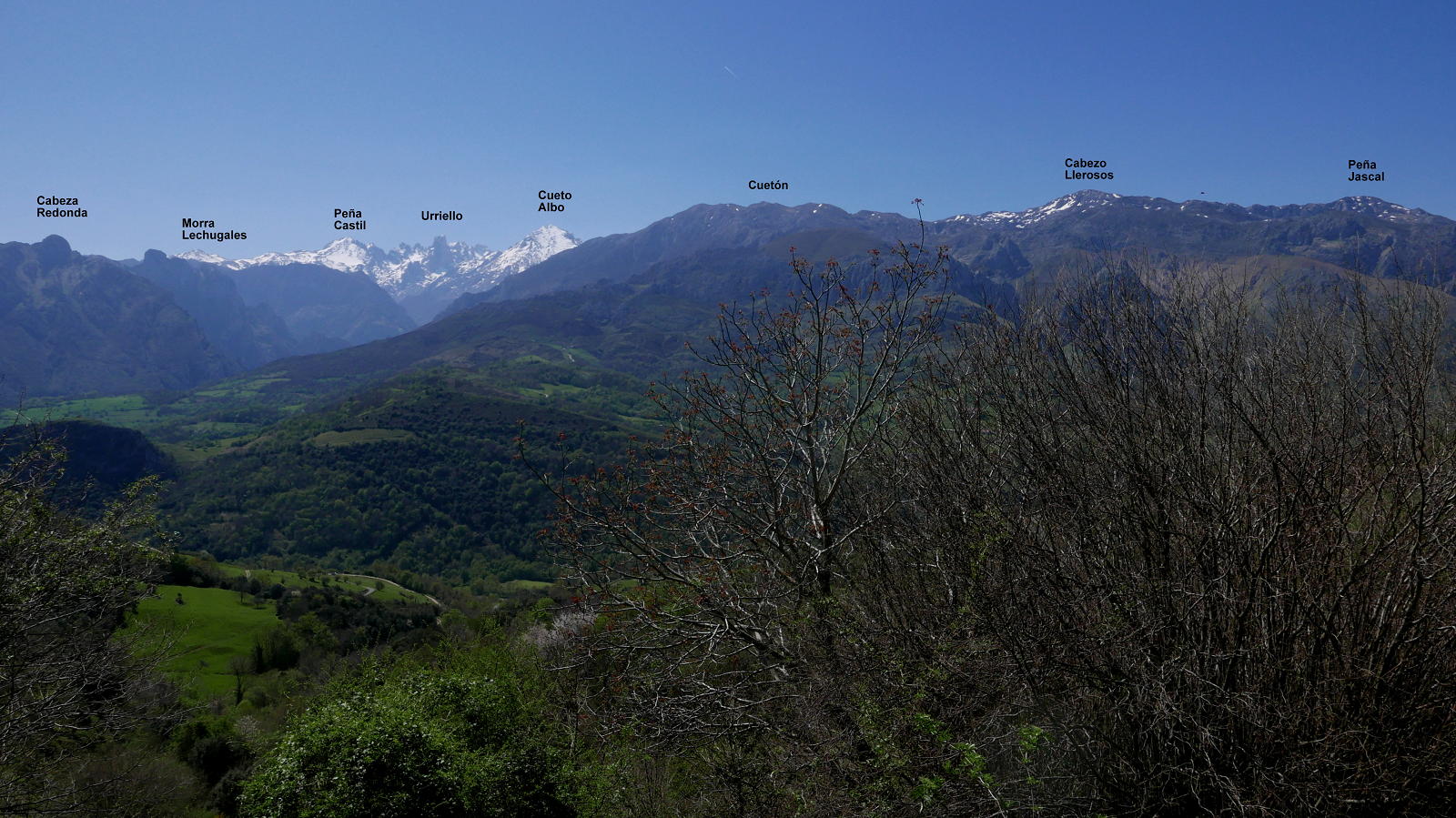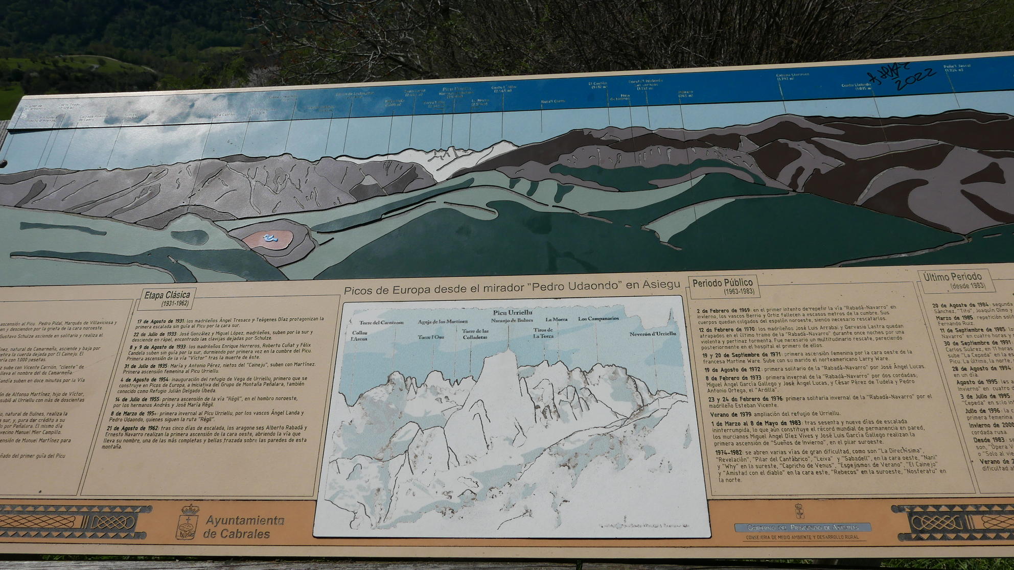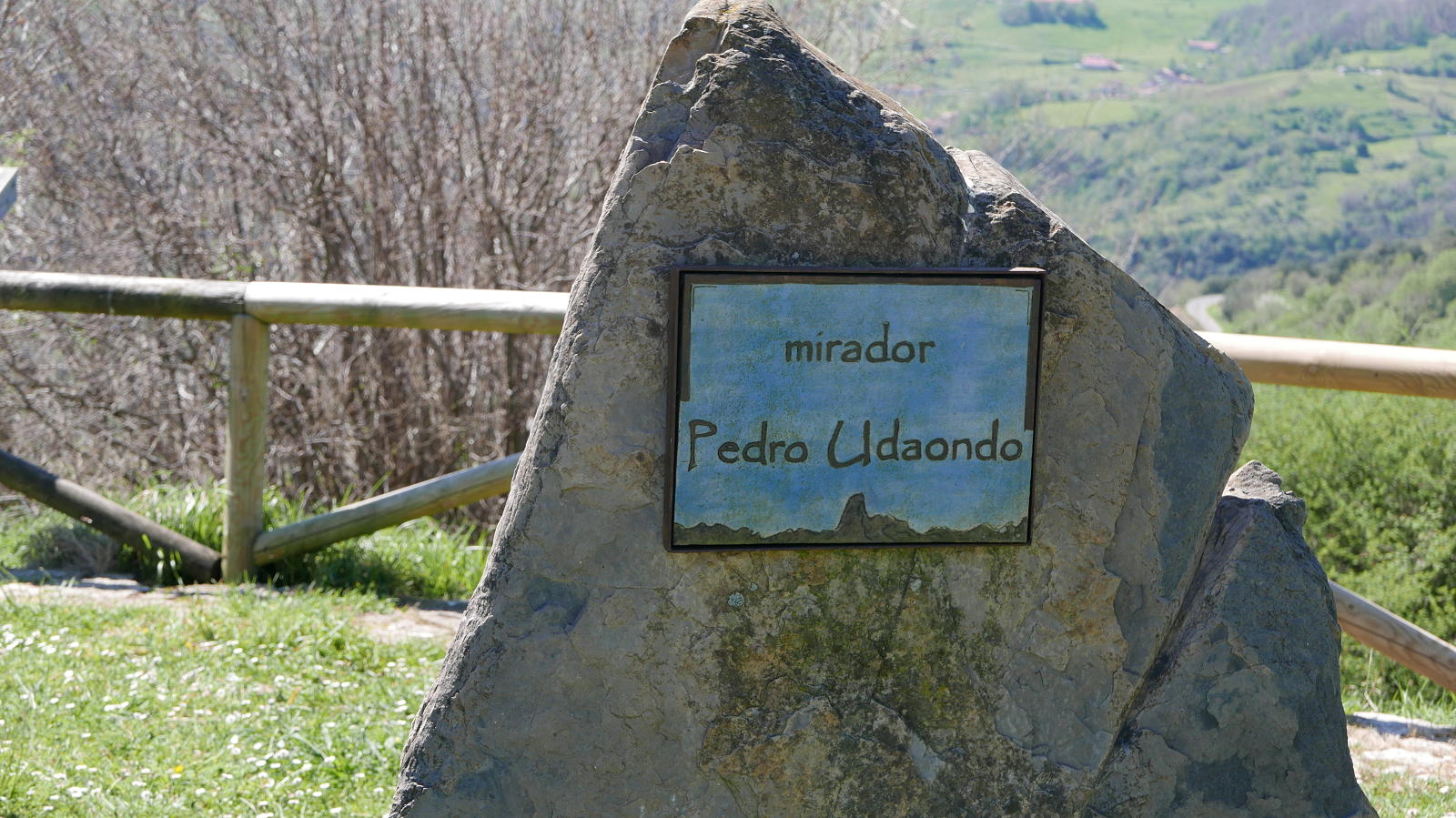 Tomamos un sendero en fuerte subida dirección sur que desembocará en la curva de una pista que seguimos recto (450m 1h07′) (el ramal de la izquierda no tendría salida). Por toda esta zona tenemos una inmejorable vista de los Picos de Europa con el Urriello destacado. Pasamos una barrera canadiense (490m 1h17′) saliendo a otra curva de una pista principal donde tomamos el ramal de la izquierda. Después hay otra bifurcación a la derecha (490m 1h24′) y, enseguida, el mirador de Pedro Udaondo (muerto a los 72 años en 2007 en la aproximación a Peña Santa de Enol; entre sus escaladas más famosas está la primera invernal al Naranjo de Bulnes), con la historia de este escalador y una mesa de orientación, precioso lugar para unos minutos de descanso.