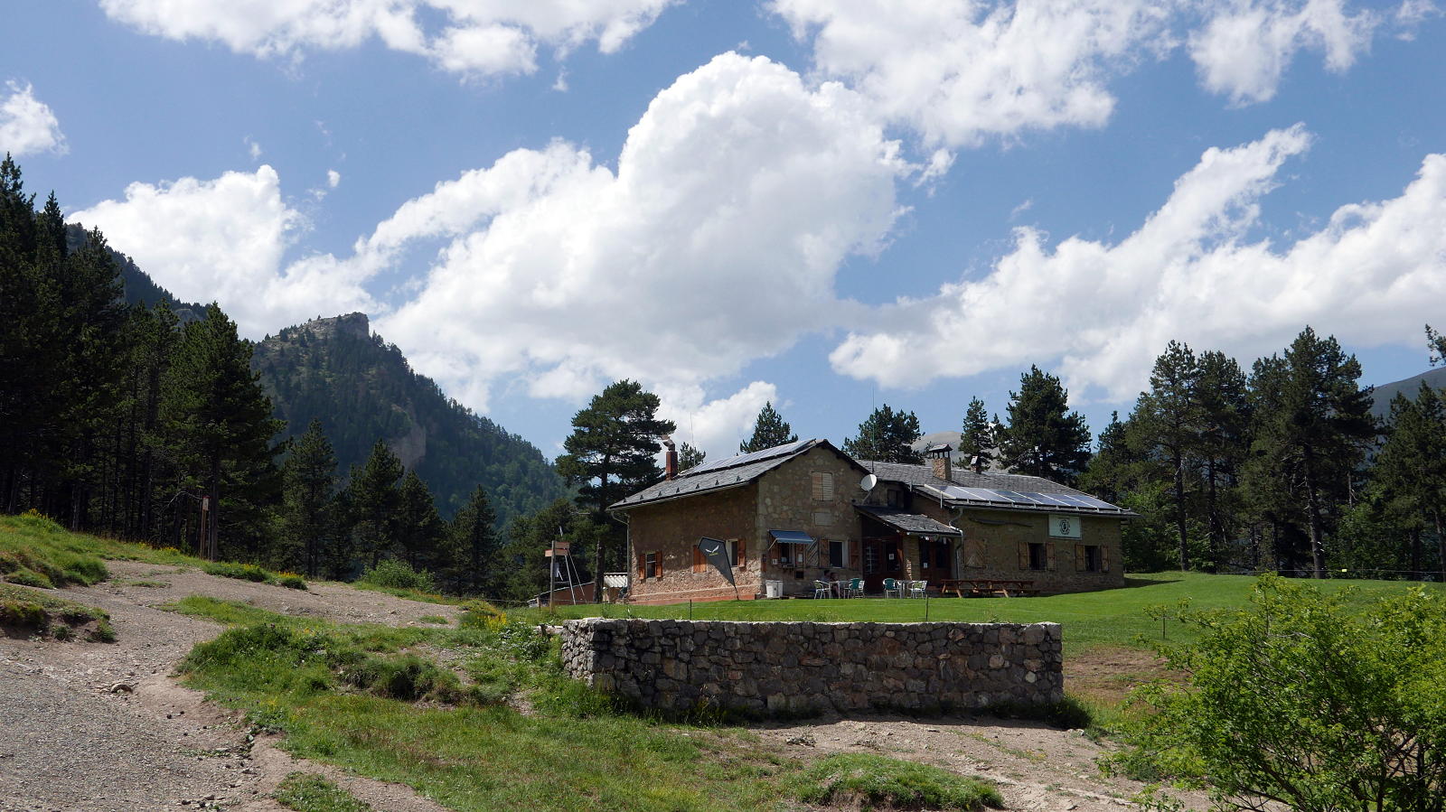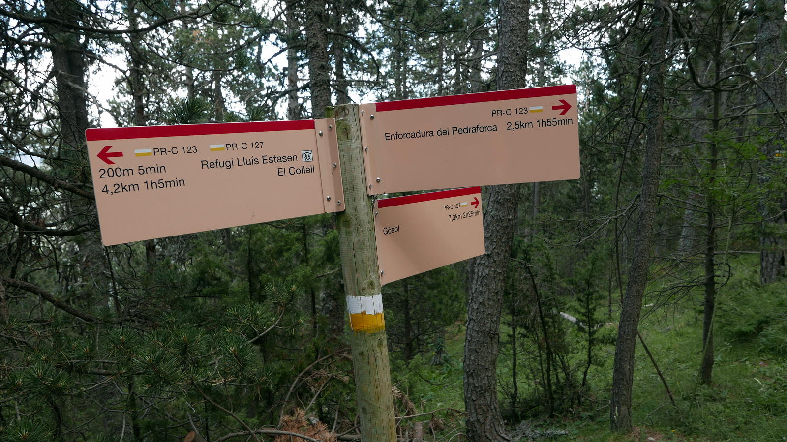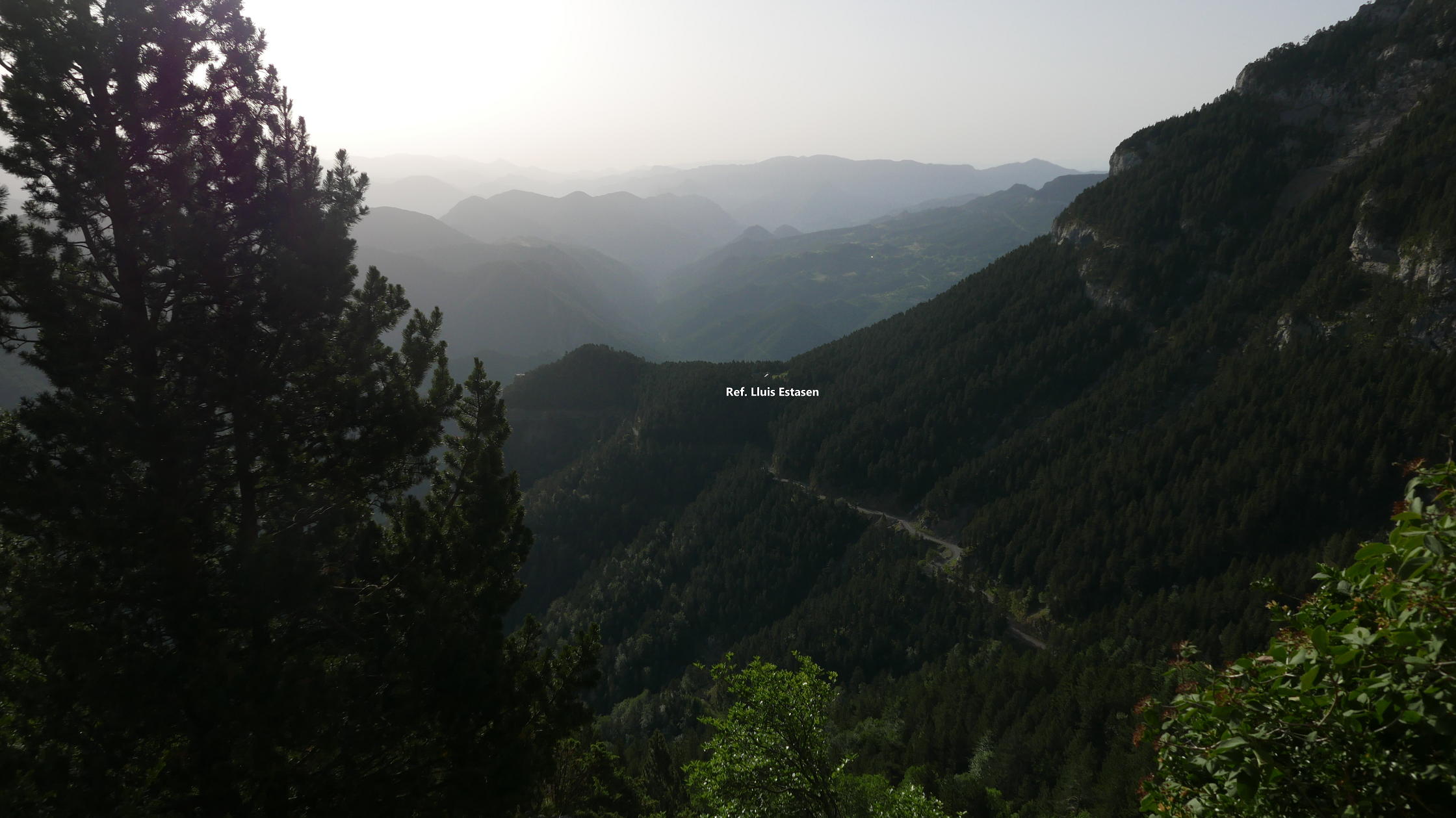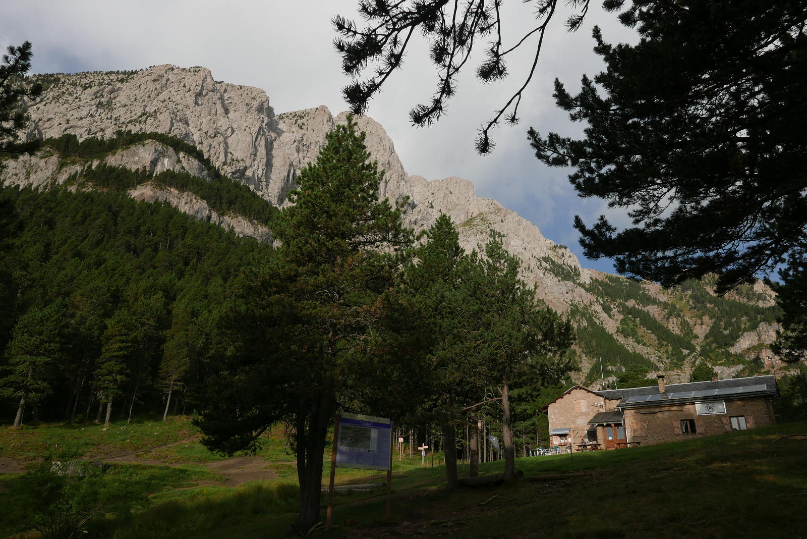 Descripción de la ruta: Mirador de Gresolet (1573m). Justo antes de la zona de aparcamiento sale a la izquierda el agradable camino bajo la sombra del pinar, indicado con carteles al refugio Lluis Estasen (1675m 0h15′). Hago una parada, descargo de la mochila la ropa de recambio y los enseres de pasar la noche; cae una ligera llovizna y continúo mi camino. El refugio está situado en una preciosa pradera rodeado de bosque de pinos y bajo las verticales murallas de Pedraforca.