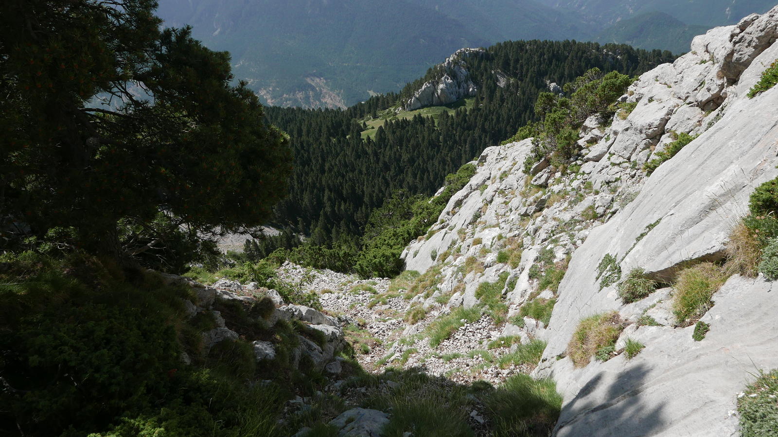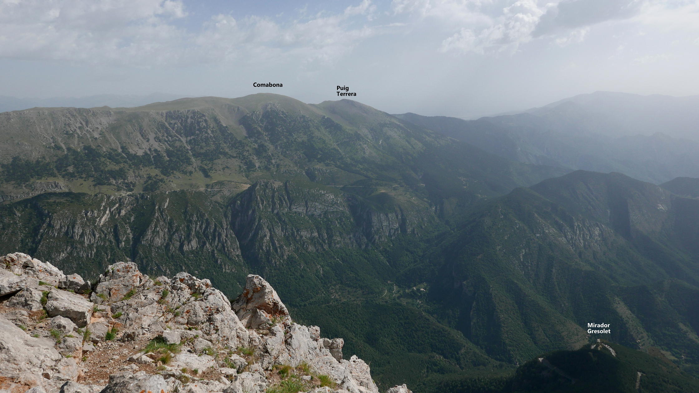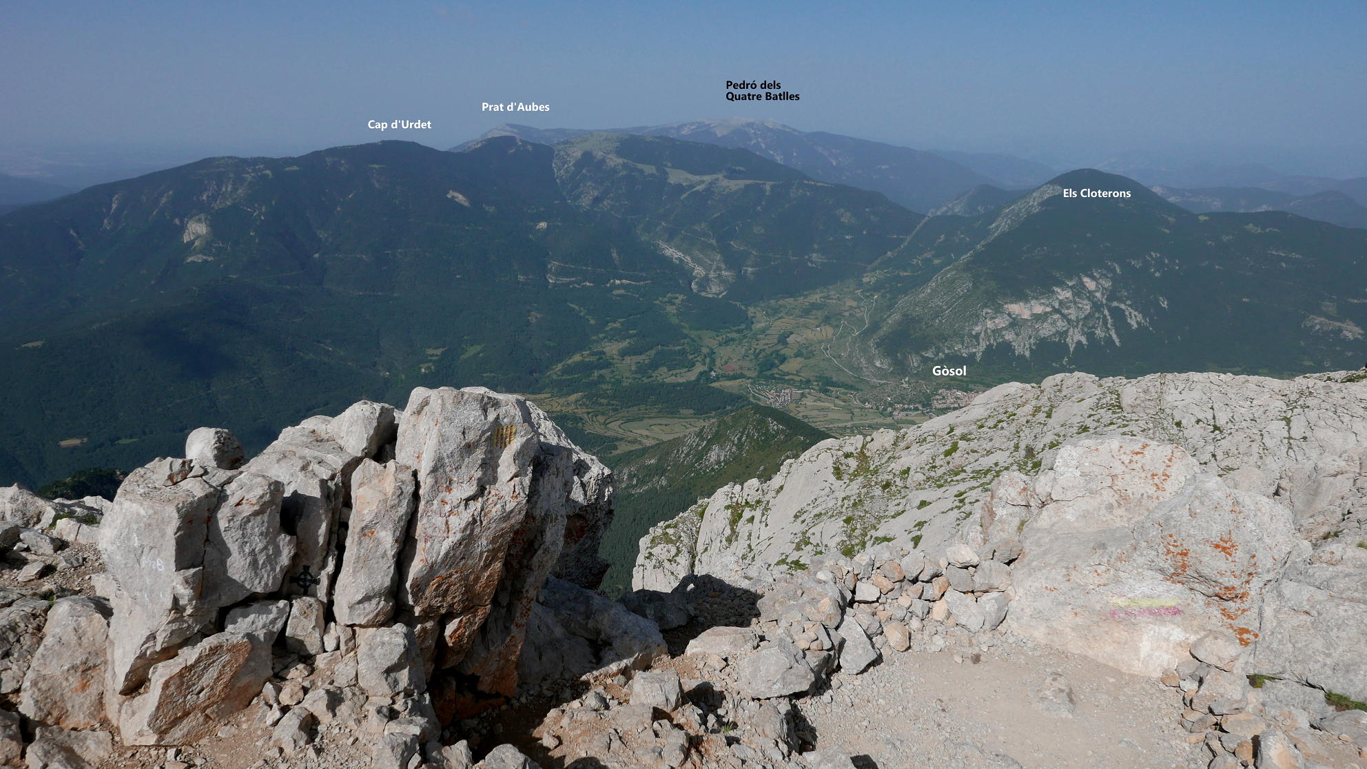 Comienzo el descenso hacia la Enforcadura por terreno también de roca pero de poca dificultad (Enforcadura 2356m 3h42′). Aquí ya hay algo más de gente que sube desde Gòsol. Sigo la amplia vaguada un poco pedregosa hacia Gòsol, hasta que en un momento dado dejo el camino y me voy a la izquierda (2275m 3h56′). Sin senda, subo un lomo y empiezo a descender por la cresta rocosa de dicho lomo, encontrando marcas azules (puede que vayan al Coll de Jou, pero no lo sé). Después voy entrando en el bosque de pinos, atravieso un pedrera (2055 4h35′) y entro otra vez en el bosque por una senda no muy clara pero con las marcas azules.