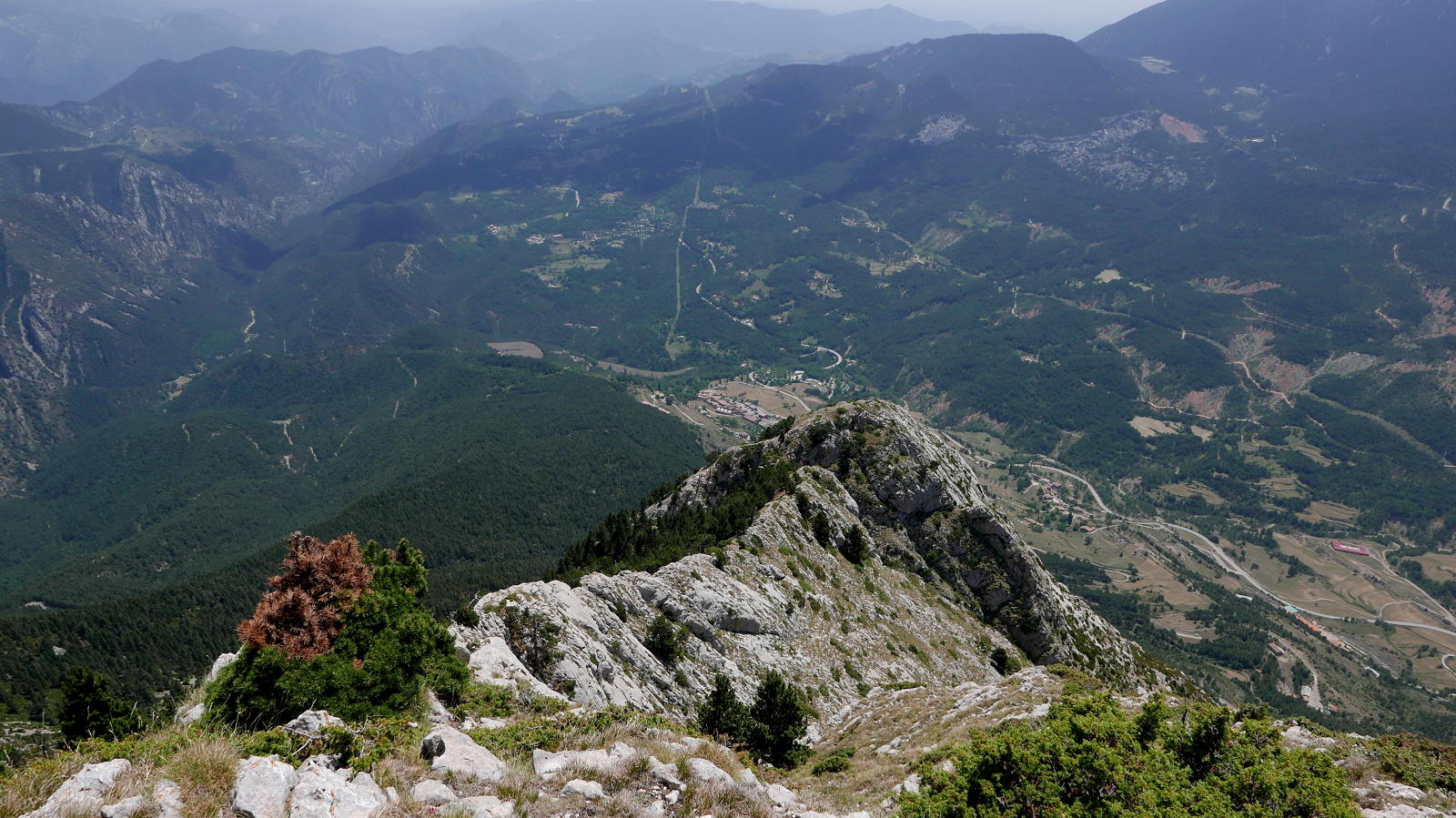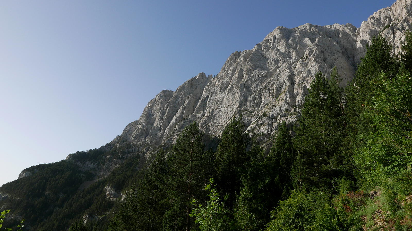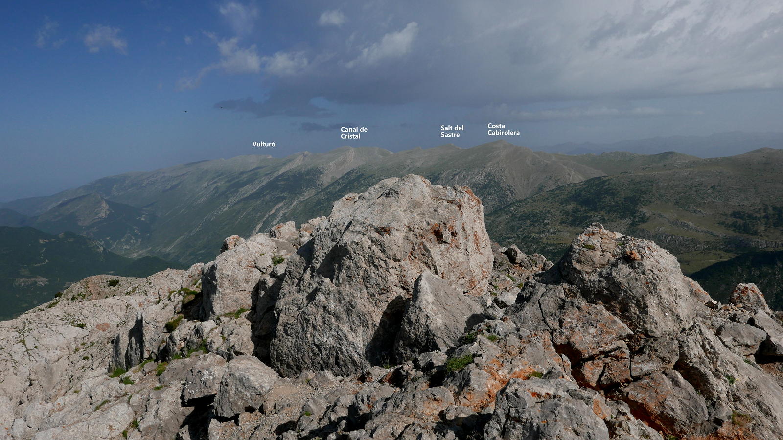 Comienzo el descenso hacia la Enforcadura por terreno también de roca pero de poca dificultad (Enforcadura 2356m 3h42′). Aquí ya hay algo más de gente que sube desde Gòsol. Sigo la amplia vaguada un poco pedregosa hacia Gòsol, hasta que en un momento dado dejo el camino y me voy a la izquierda (2275m 3h56′). Sin senda, subo un lomo y empiezo a descender por la cresta rocosa de dicho lomo, encontrando marcas azules (puede que vayan al Coll de Jou, pero no lo sé). Después voy entrando en el bosque de pinos, atravieso un pedrera (2055 4h35′) y entro otra vez en el bosque por una senda no muy clara pero con las marcas azules.