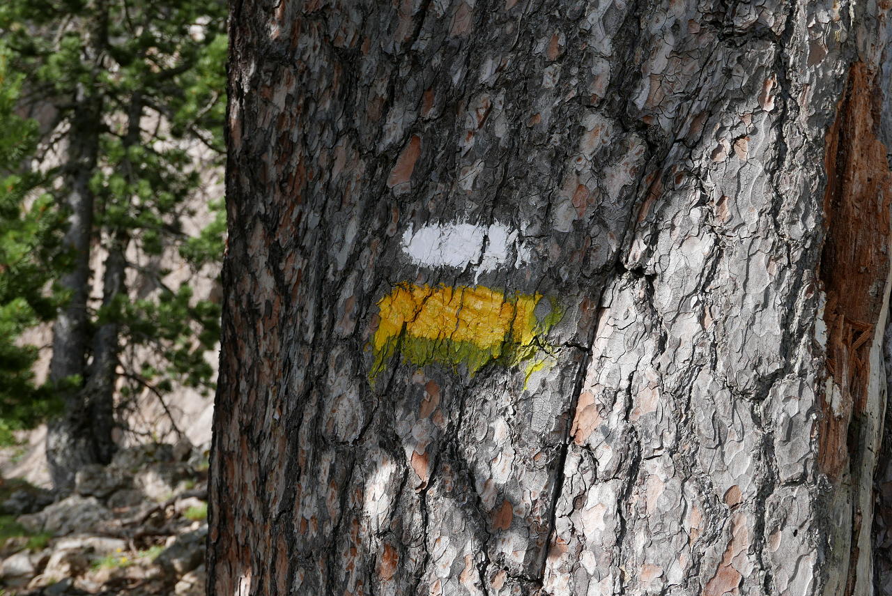 Salgo por una senda hacia el oeste, con las paredes calizas al sur. El camino sortea algunas barranqueras que descienden de Pedraforca y, cuando bajen con agua, deben arrasar todo a su paso, ya que encuentro grandes bloques de roca que hay que esquivar. Estás balizado con marcas amarillas y blancas.