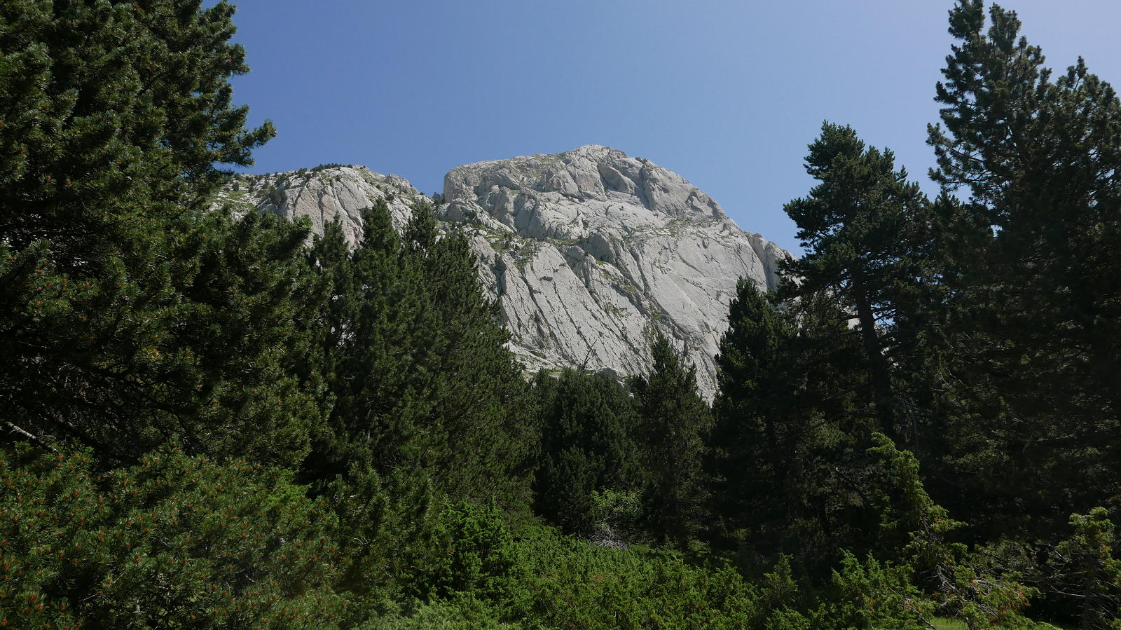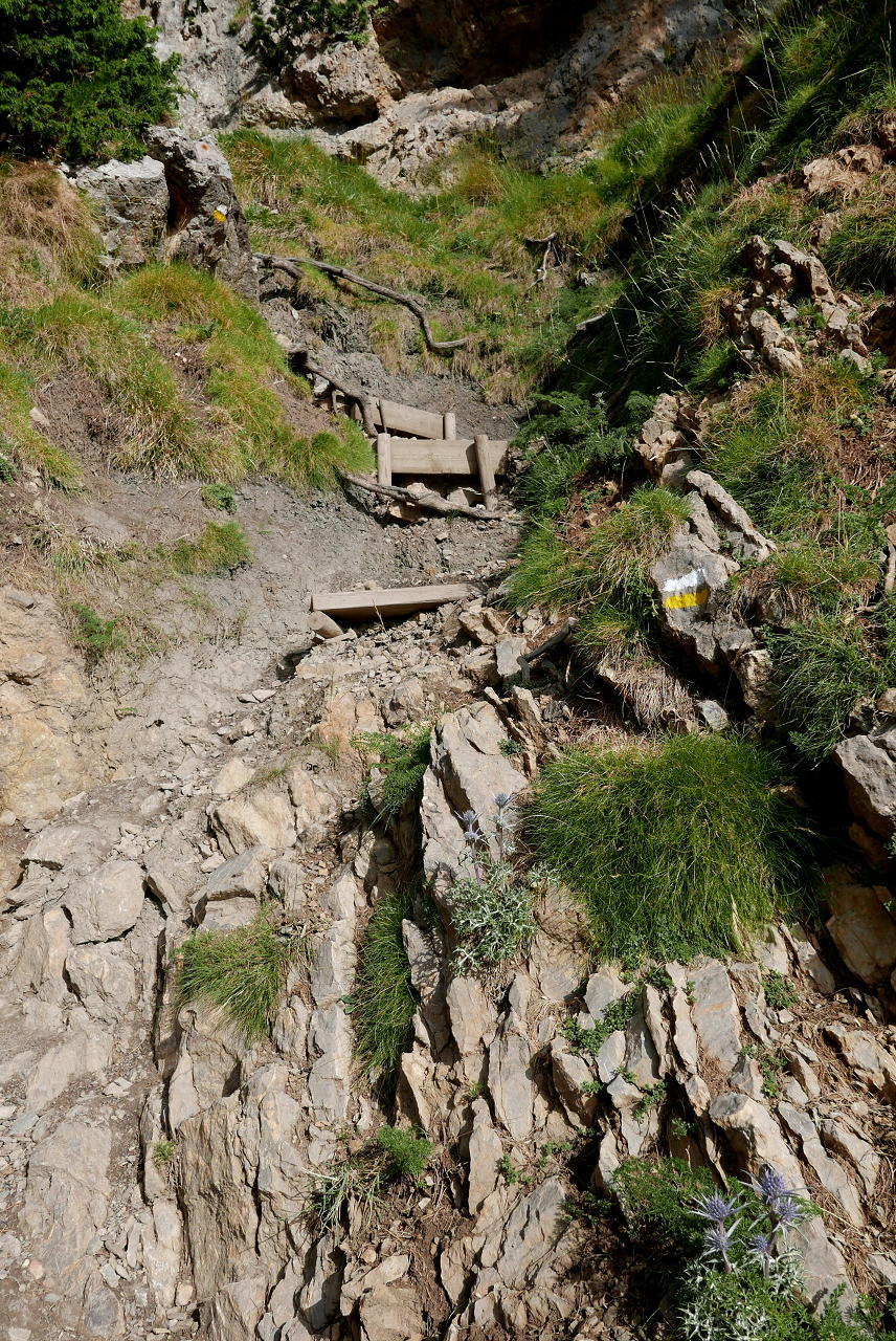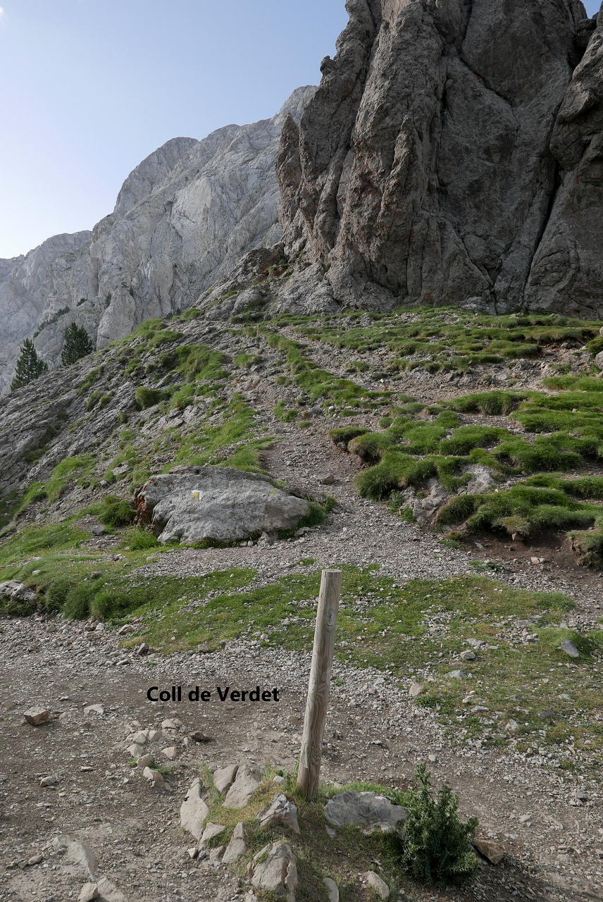 Hay una pequeña trepada (1900m 0h55′) y, cuando este camino muere bloqueado por la roca, unos hitos marcan un giro a la izquierda (1910m 1h03′) para empezar a ascender por una barranquera y, enseguida, subir por el bosque de la izquierda. Encuentro un gran montículo de piedras (2005m 1h14′) y luego hay otros. El camino asciende por pinar, siempre con fuerte pendiente. Tras un último ascenso con algo de tierrilla resbalosa se llega a un estrecho collado, el Col de Verdet (2255m 1h40′).