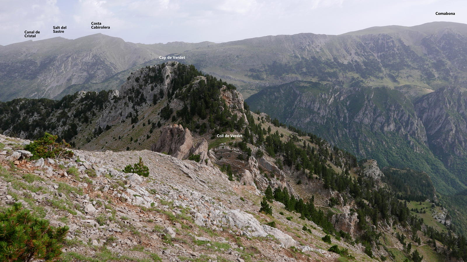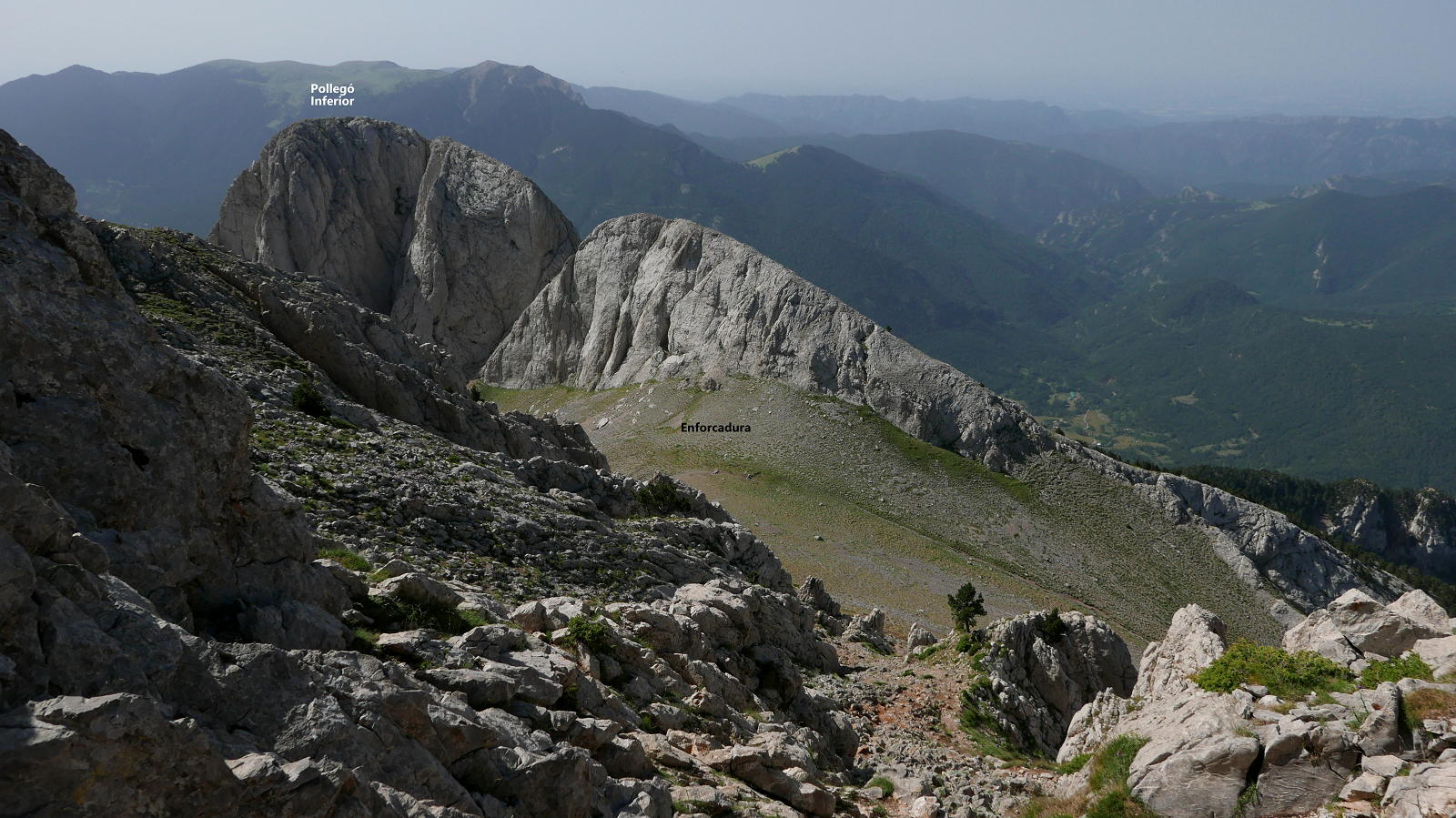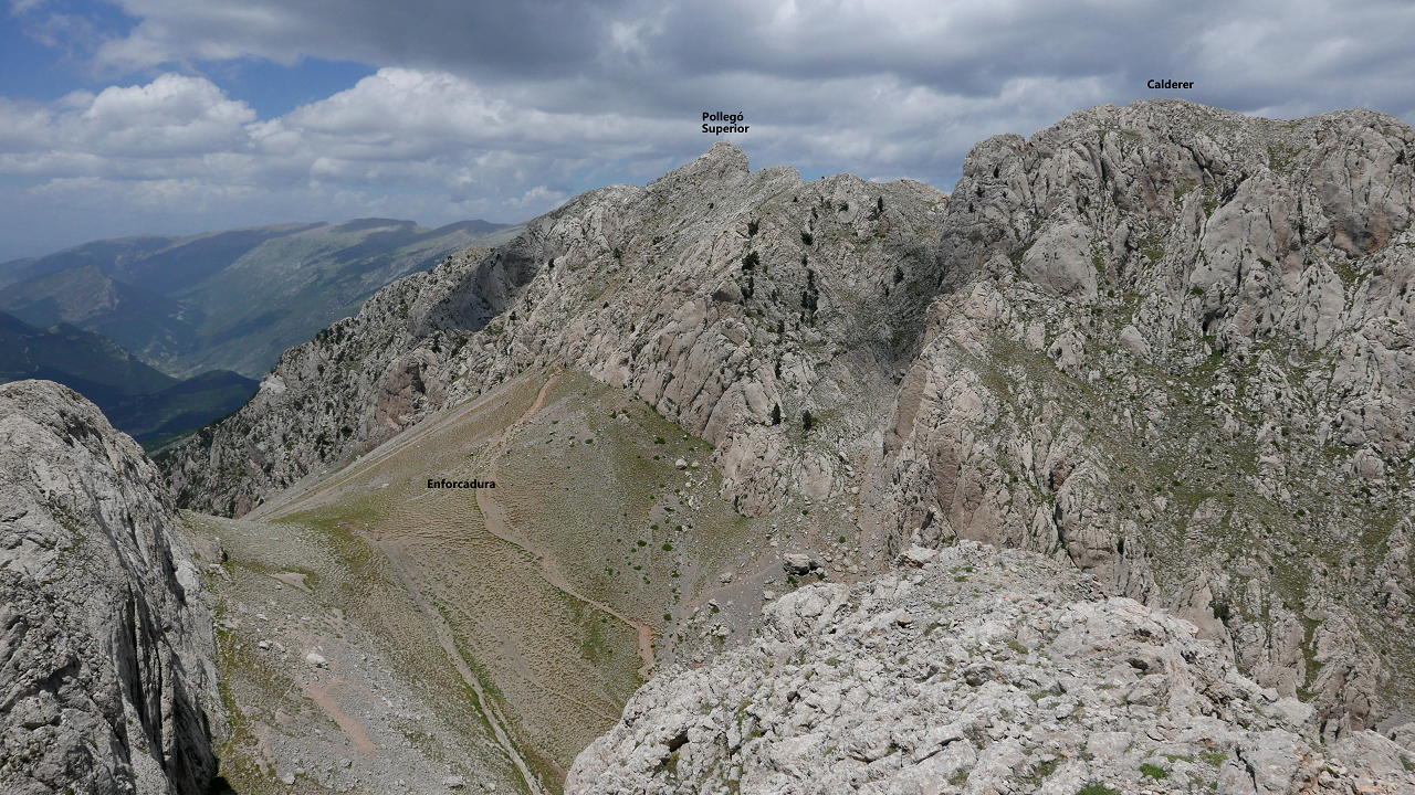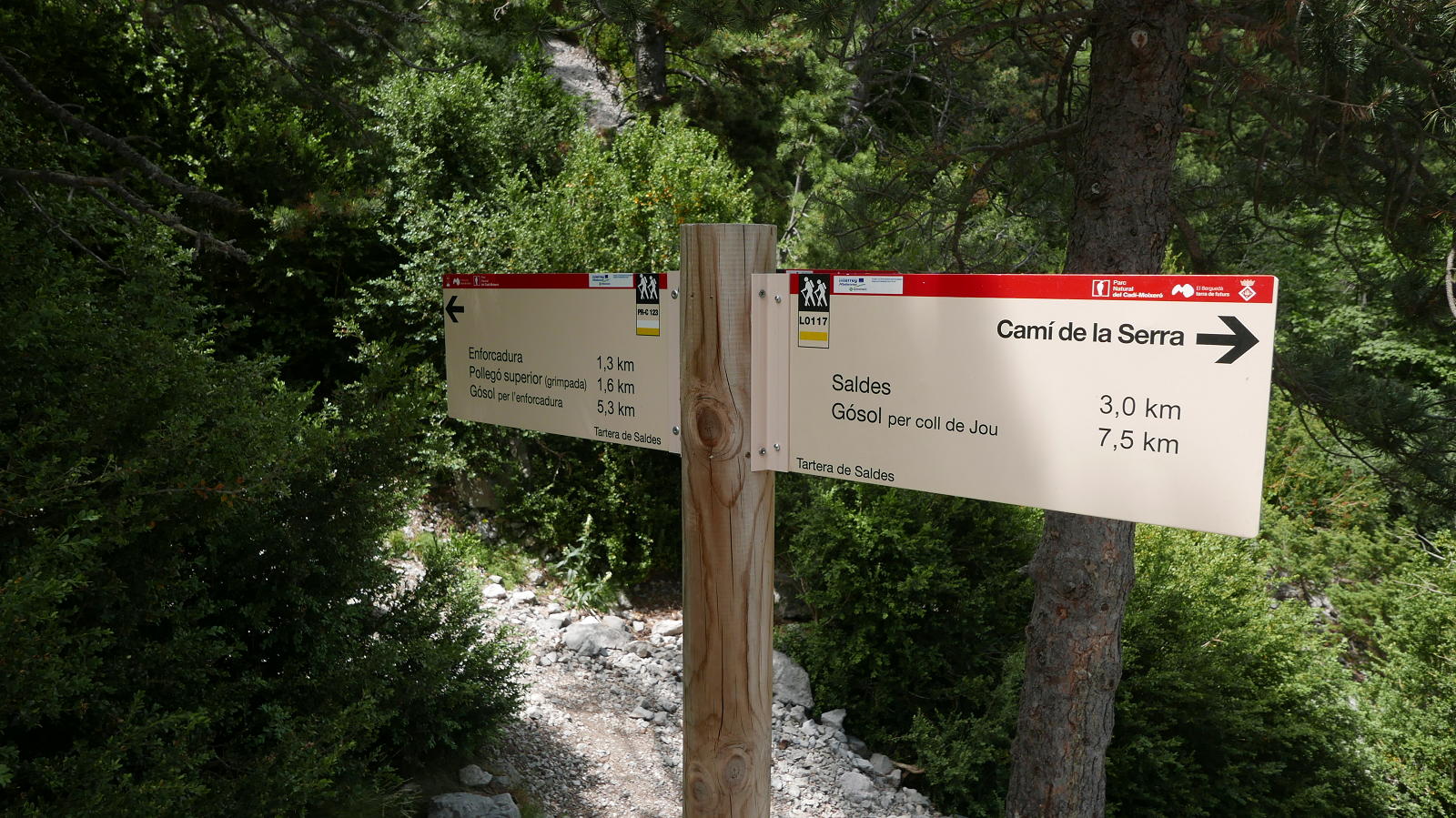Desciendo por la misma ruta y regreso al punto donde inicié la cresta (2125m 7h17′) y continúo por la cresta hasta una bifurcación que tomo a la izquierda (creo que la ruta normal continuaría un poco más porque he dejado las marcas amarillas y yo he tomado un atajo que va a ser algo confuso, es la zona llamada el Balcó de la Joaquima). La bajada es fuerte. Llego a un punto con un destrepe rocoso difícil, pienso que me he equivocado, doy una vuelta intentando buscar el buen camino, pero regreso al mismo punto y veo que hay una cuerda (1970m 7h45′) que me permite el destrepe. Poco después confluyo con el camino marcado (1930m 7h50′). Se pasan algunas pedreras. Bifurcación de caminos (1785m 8h05′) con cartel con 3 direcciones: Saldes, Refugio y subida a la Enforcadura.