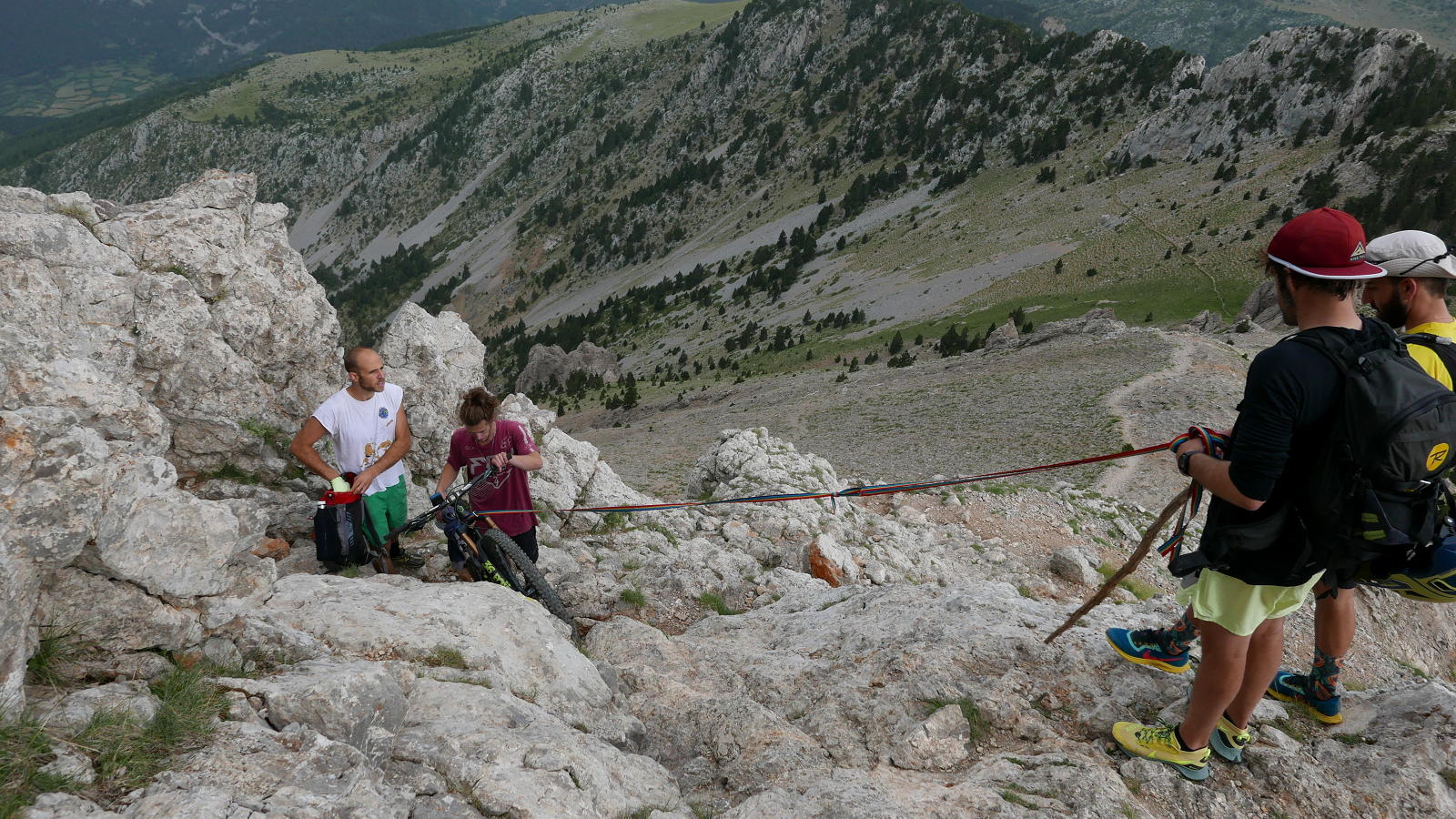 Hay que ir a la izquierda (sur), por zona más rocosa, para dirigirse a la cresta norte de la Cima Norte de Pedraforca. En la primera trepada (2360m 1h57′) guardo los bastones y me pongo el casco. Ya será todo rocoso y siempre apoyando manos, con una dificultad catalogada como F+. Los amagos de tormenta me asustan un poco. Encuentro a 4 jóvenes porteando una bicicleta, dos tiran desde arriba con una cuerda y los otros dos empujan desde abajo. ¿Intentarán el descenso en bicicleta? Se me antoja imposible.
