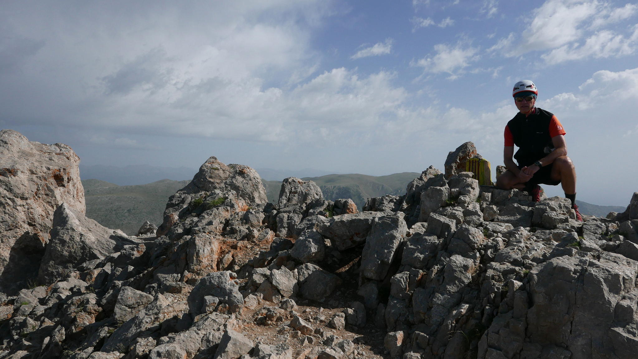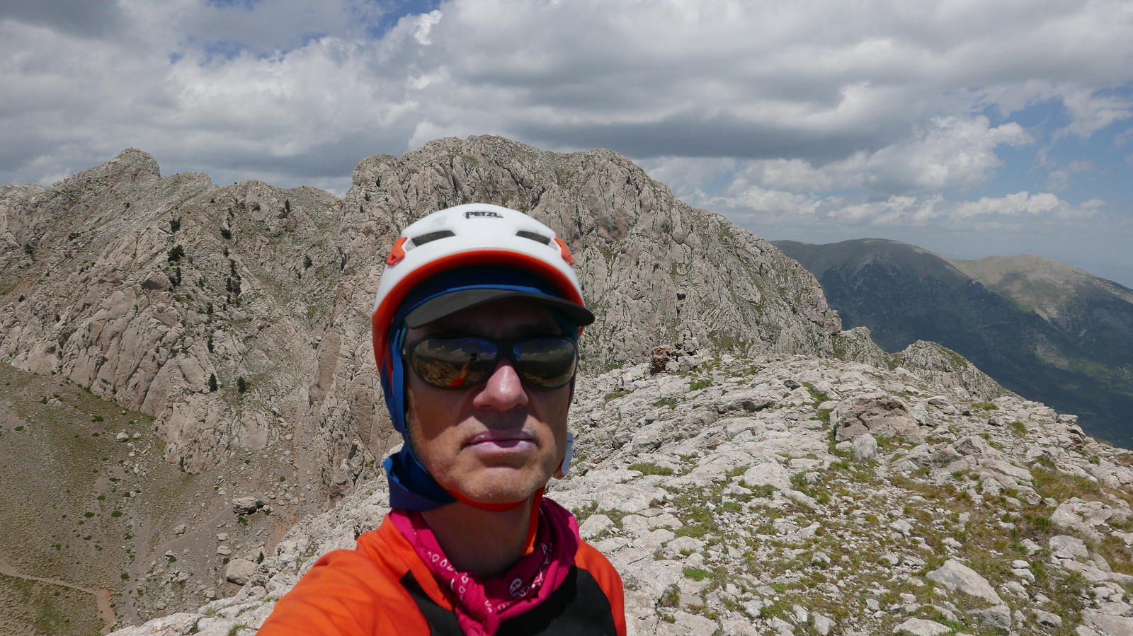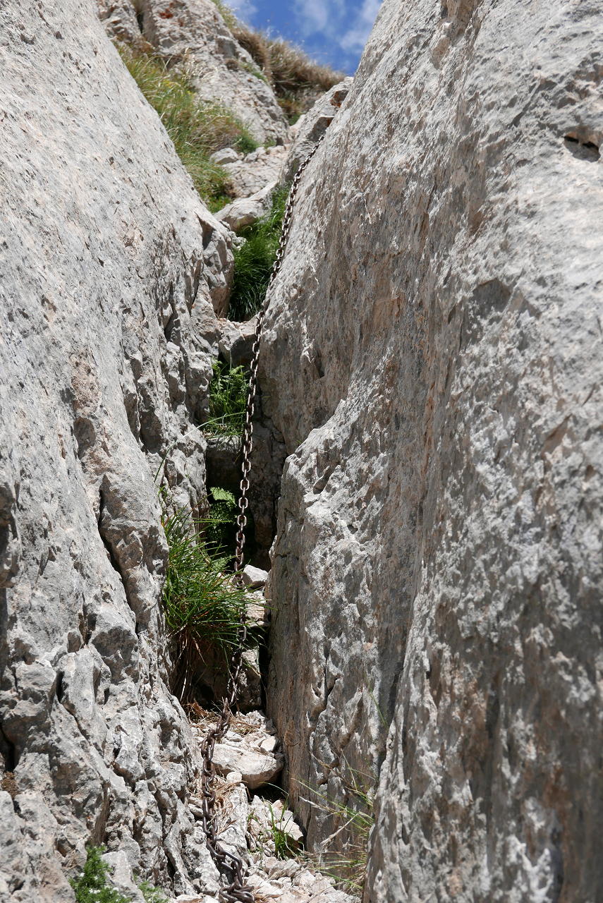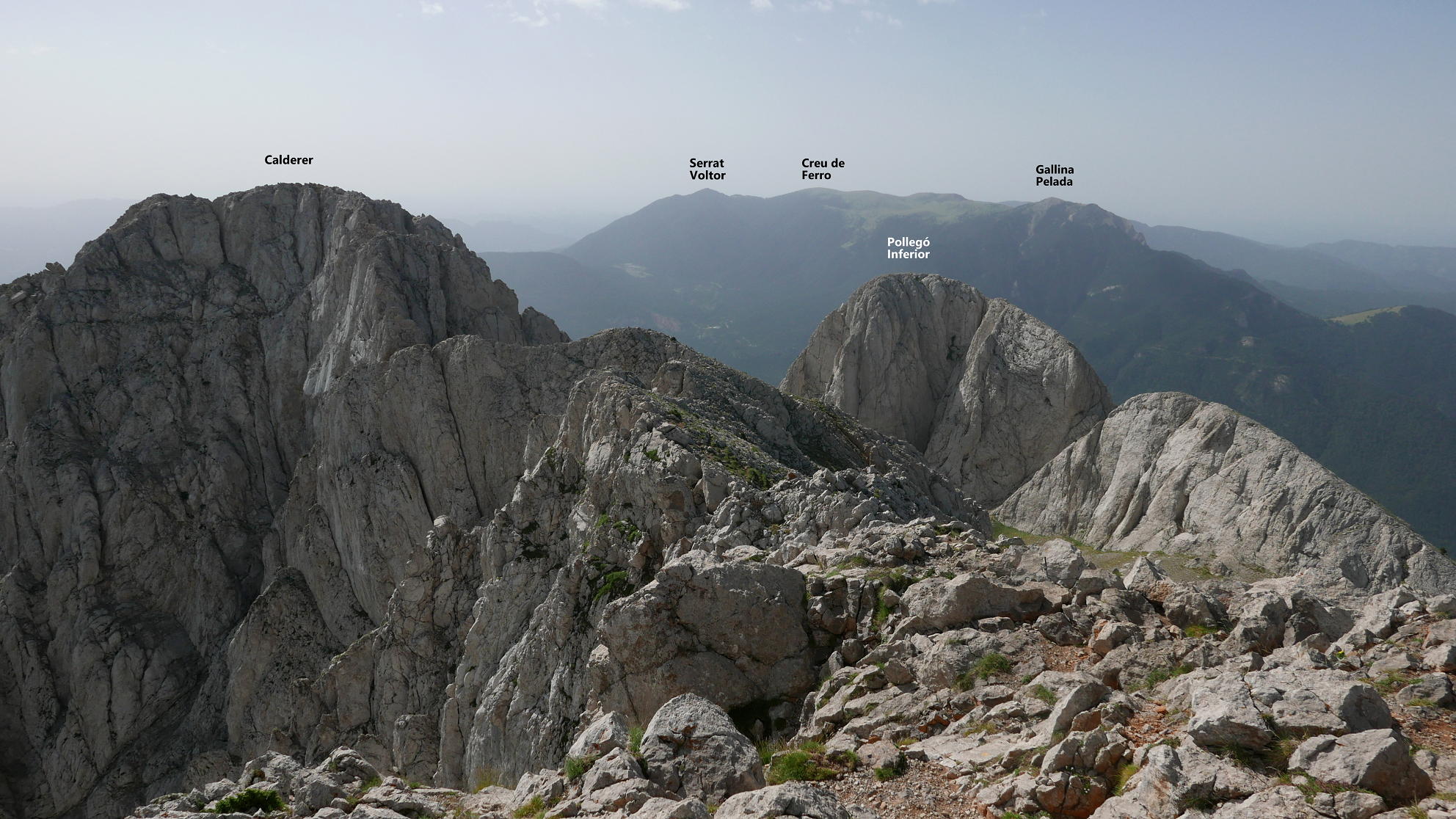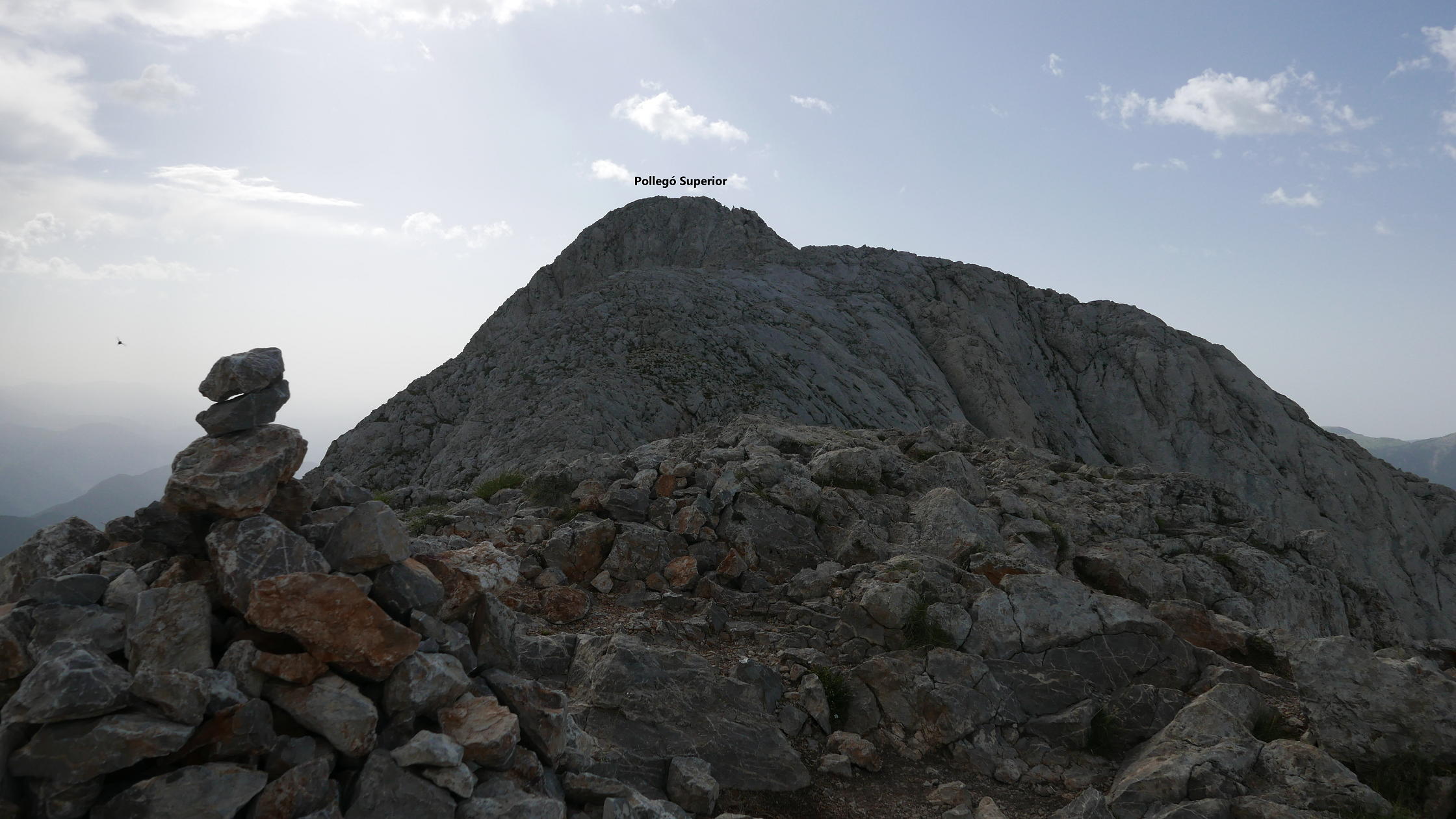 Llego así a la cresta ESE (2105m 5h30′) y giro a la izquierda para afrontar la subida al Inferior. Aquí hay marcas amarillas y verdes. De nuevo bastones a la mochila y casco en la cabeza. Al principio hay una trepada en roca, luego es más bien un lomo con pendiente fuerte y al final otra vez unas trepadas, con una cadena (2410m 6h13′) para ayudarse en una canal. Cima del Pollegó Inferior (2444m 6h16′) donde estoy unos 20′.