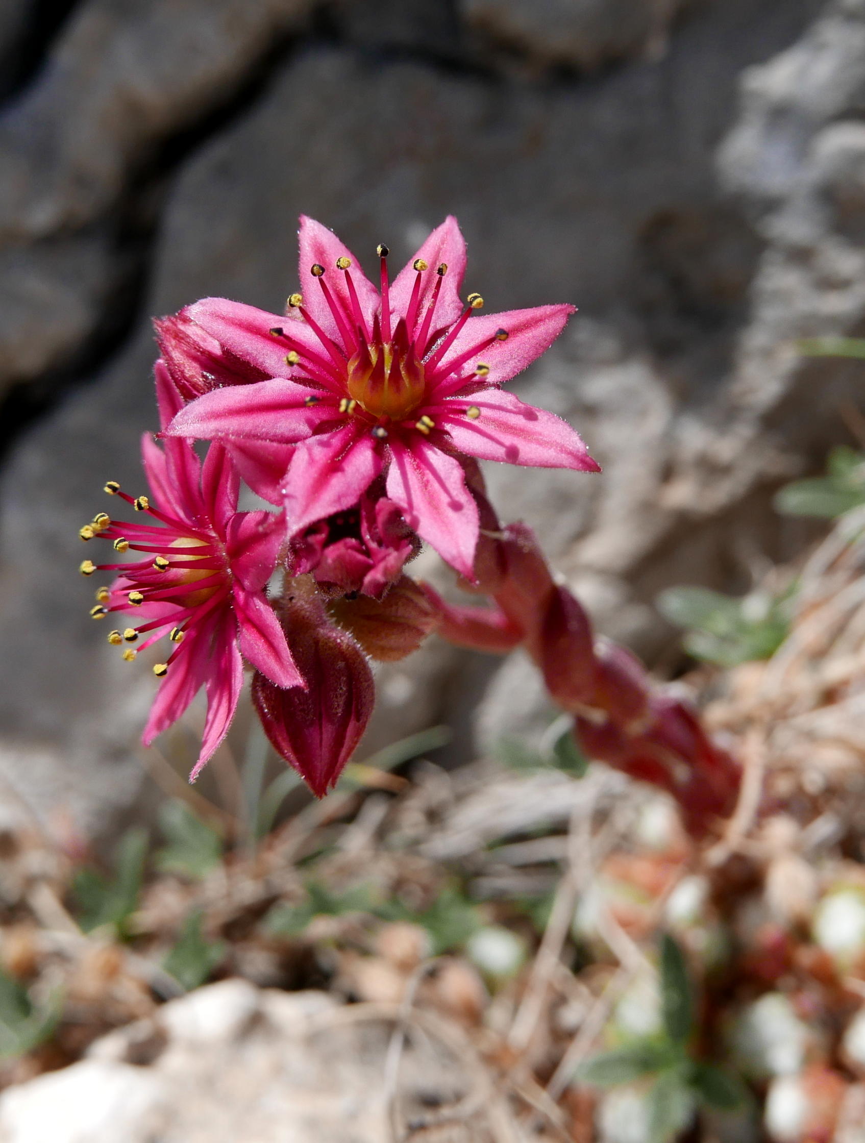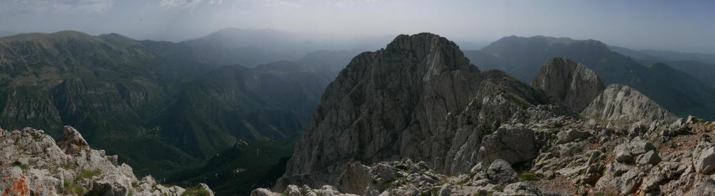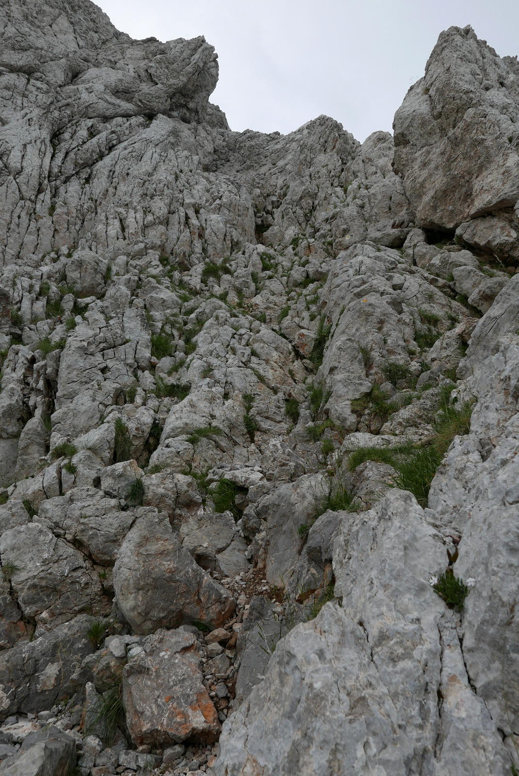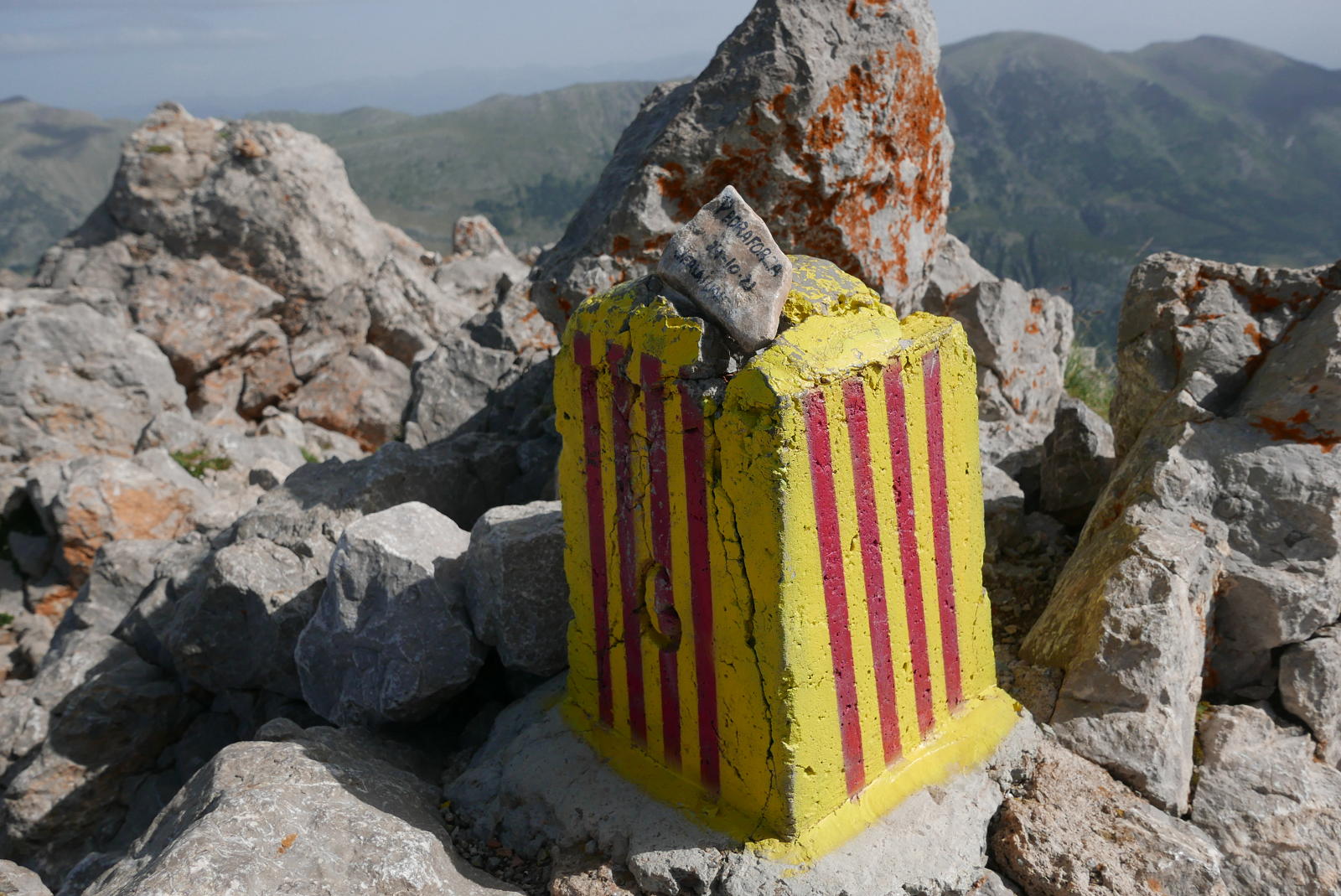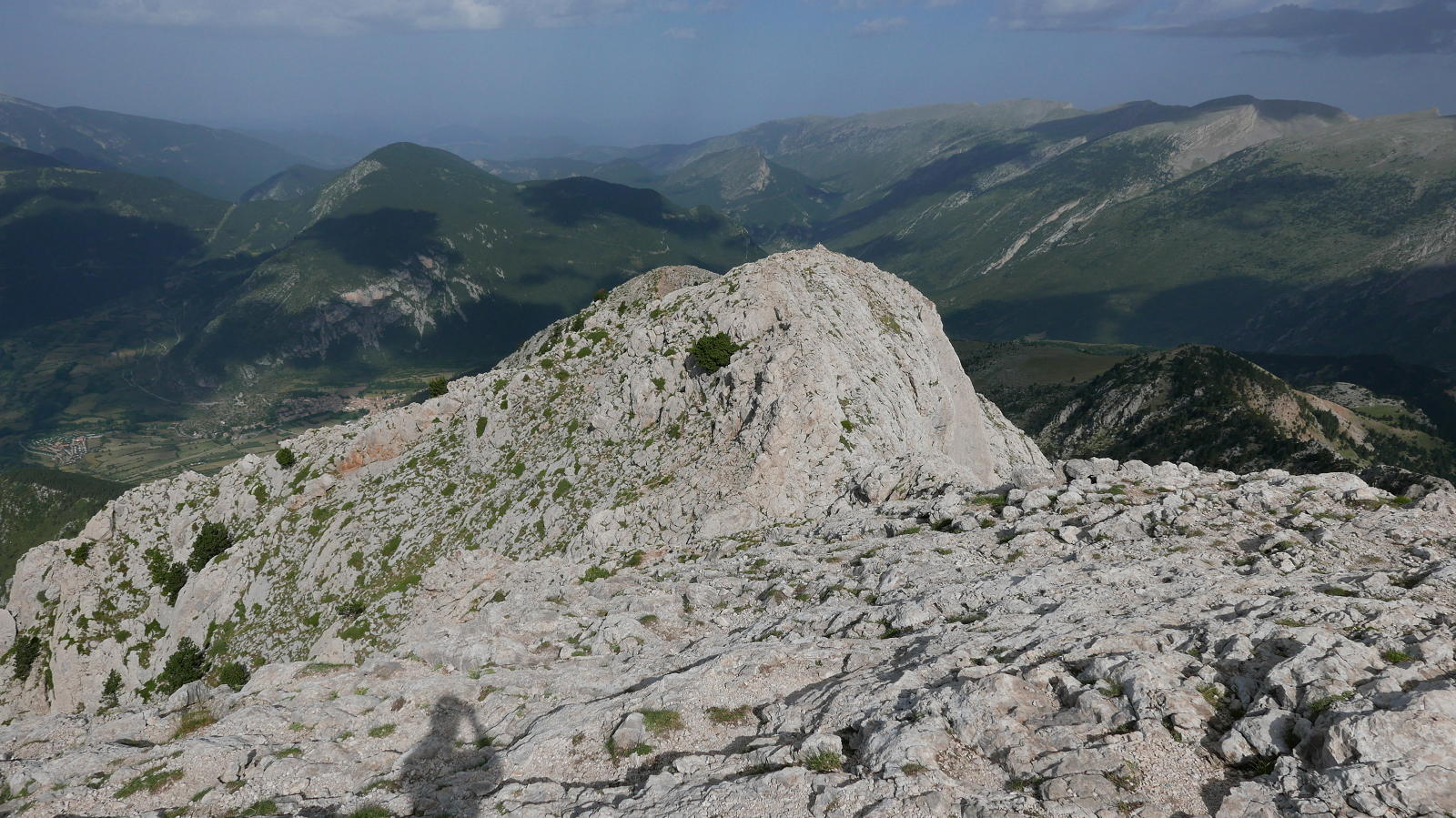 Llego así a la cresta ESE (2105m 5h30′) y giro a la izquierda para afrontar la subida al Inferior. Aquí hay marcas amarillas y verdes. De nuevo bastones a la mochila y casco en la cabeza. Al principio hay una trepada en roca, luego es más bien un lomo con pendiente fuerte y al final otra vez unas trepadas, con una cadena (2410m 6h13′) para ayudarse en una canal. Cima del Pollegó Inferior (2444m 6h16′) donde estoy unos 20′.