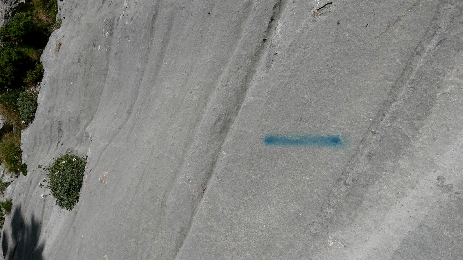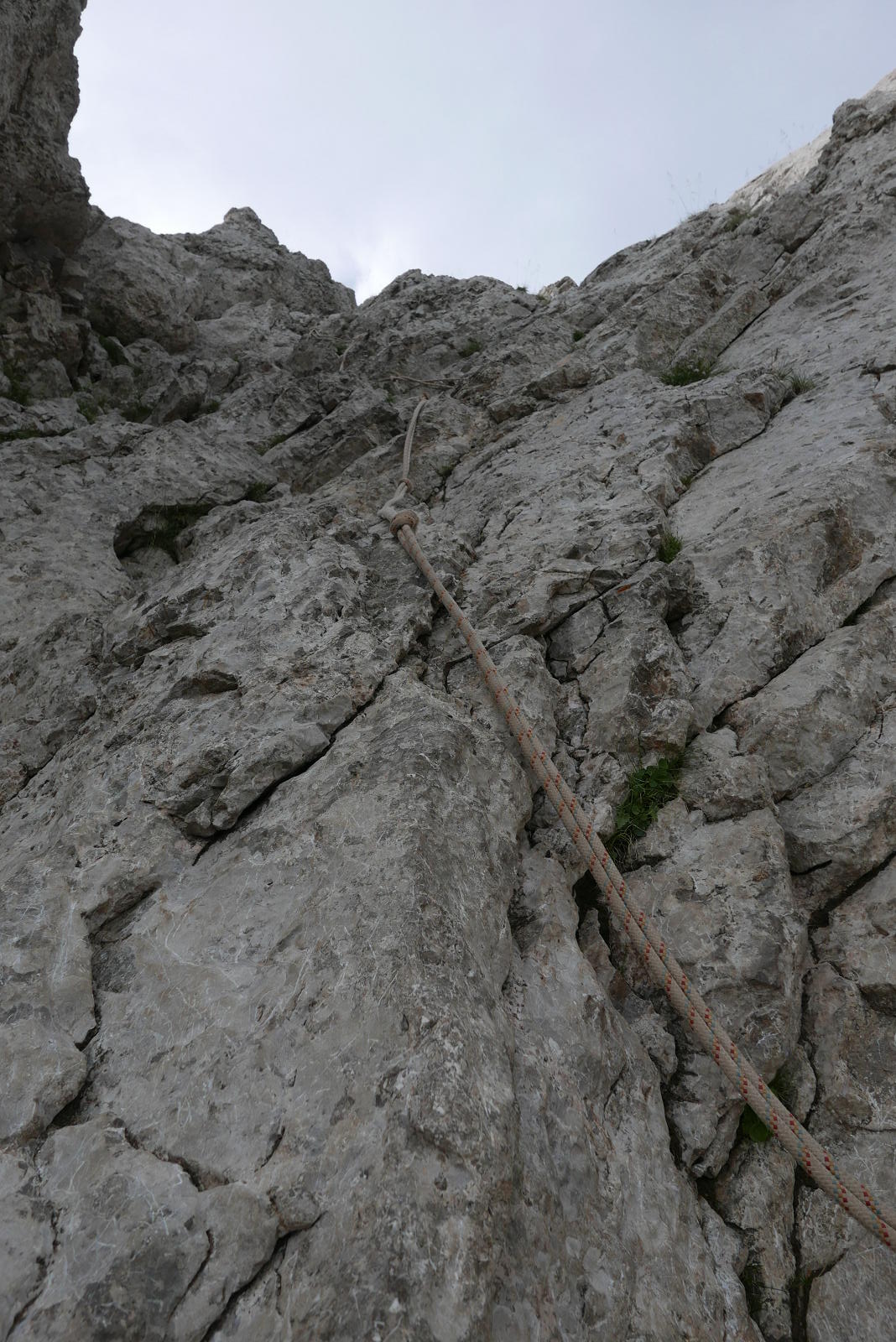En un muro más vertical hay una cuerda para ayudarse en la trepada. La ruta está bien marcada con pintura amarilla que no hay que perder. Va aprovechando viras, chimeneas y pasos en la roca que parecen la única opción para una ascensión sin demasiada dificultad. Alcanzo el Falso Pollegó (2468m 2h20′). Hay que hacer 3 descensos a 3 brechas para llegar al Pollegó Superior (2506m 2h40′). Solo me encuentro una pareja en la cima y luego disfruto de la cumbre en solitario durante 50′.