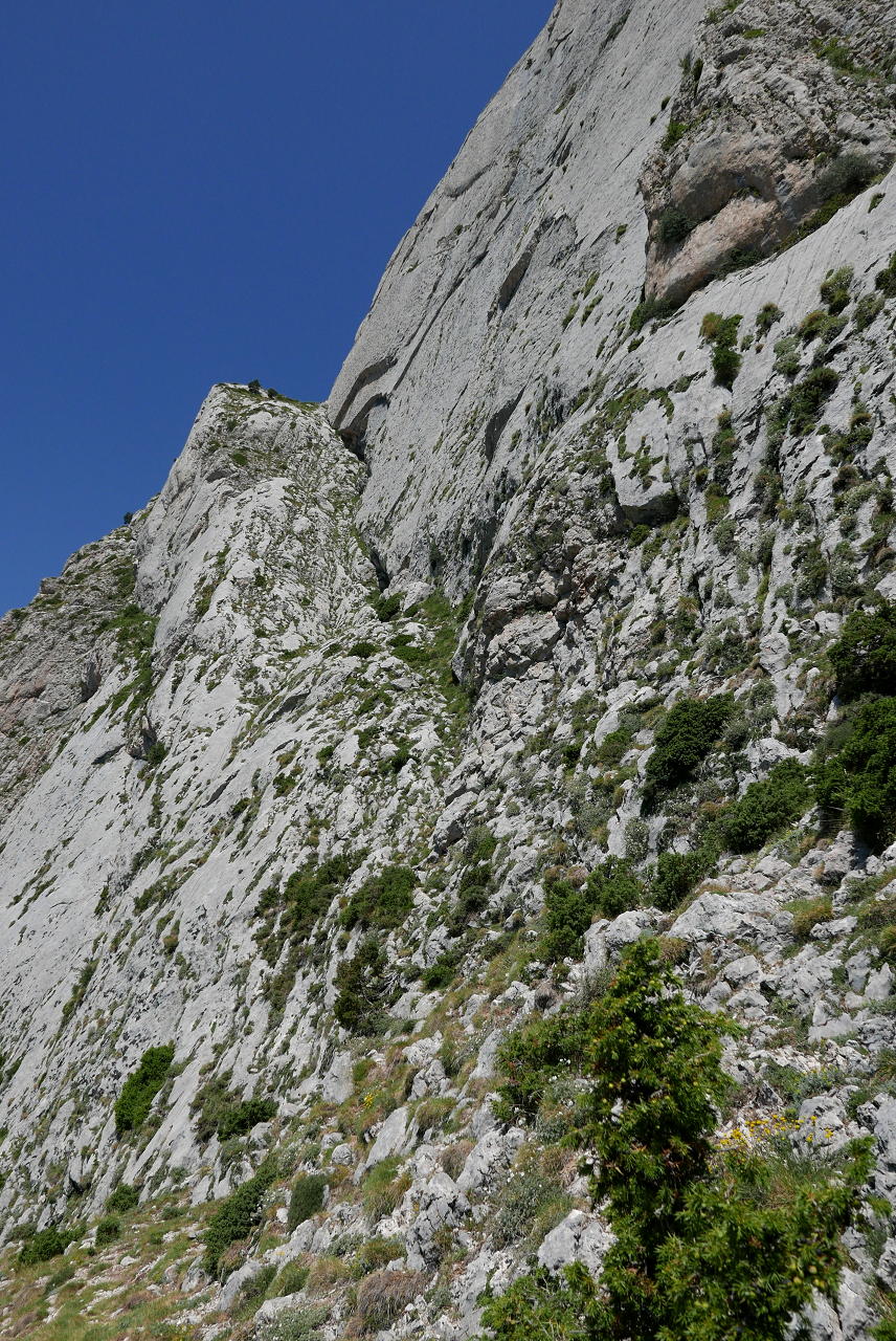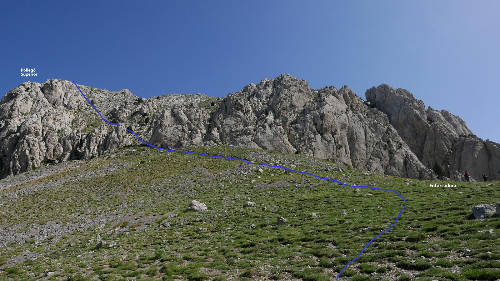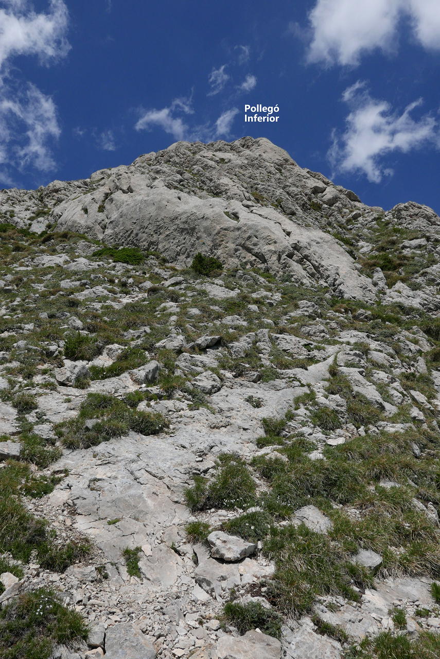 Llego a un claro (2000m 4h43′) donde dejo las marcas azules y me voy a la izquierda. Es algo confuso, pero el objetivo es acercarme a la pared sur de Pedraforca. Encuentro un hito con pintura roja (2060m 5h10′) y sigo hitos bajo la pared hasta donde empieza la chimenea diagonal que escala al Pollegó Inferior. Supuestamente es una vía equipada y mi intención era subir por aquí, pero lo veo francamente difícil y cambio de idea. El GPS me muestra una senda que continúa hasta entroncar con la subida normal al Pollegó Inferior, así que sigo recto (2065m 5h15′). Al subir un lomo veo la senda.