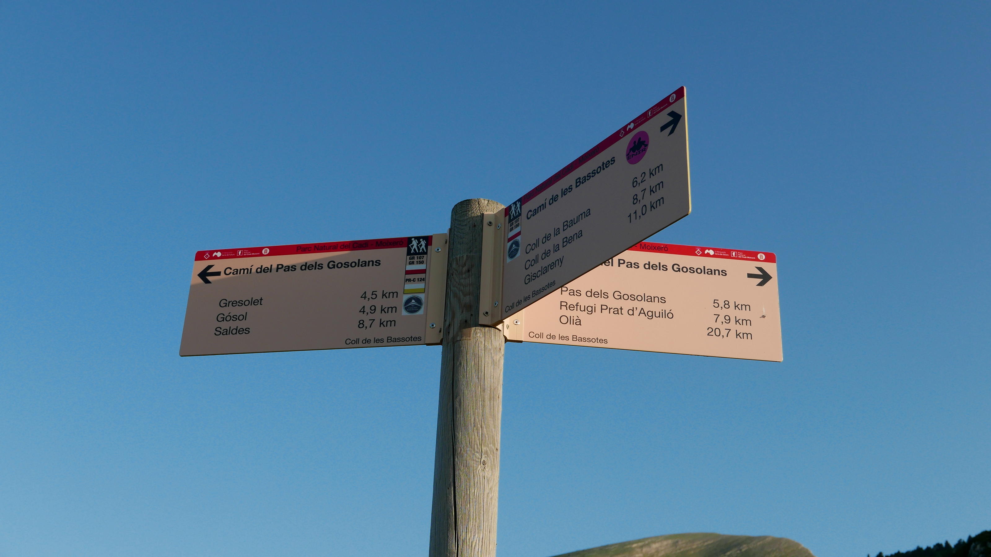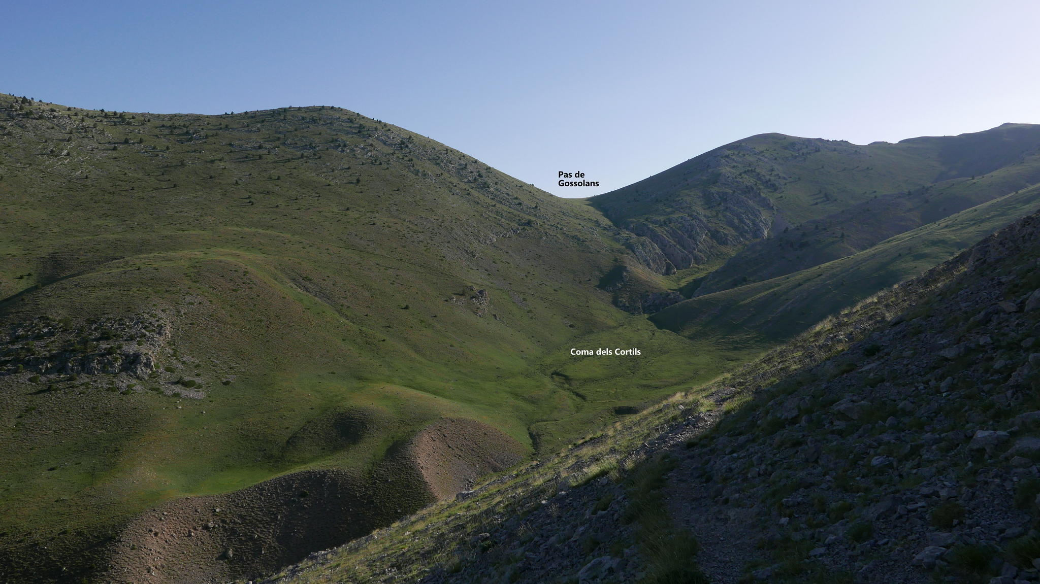 Descripción de la ruta: Coll de les Basotes (1873m) es una amplia zona de pastos. Aparco junto a un cartel de direcciones y paneles informativos. Debería seguir la dirección a Pas dels Gosolans, pero atajo campo a través por suaves laderas de hierba. Al bajar tomaré sendas con hitos que atajan la pista. En el mapa del ICGC Vissir3 se llama camí dels Cortils. Paso una primera valla (2010m 0h22′) y, más arriba, desemboco en el camino (2115m 0h32′) y lo sigo a la izquierda, haciendo grandes zigzags que al volver atajaré, como he dicho antes, por sendas con hitos.