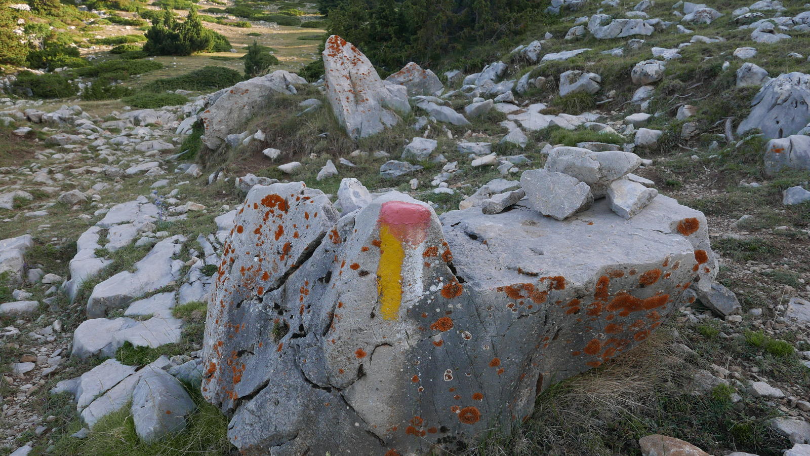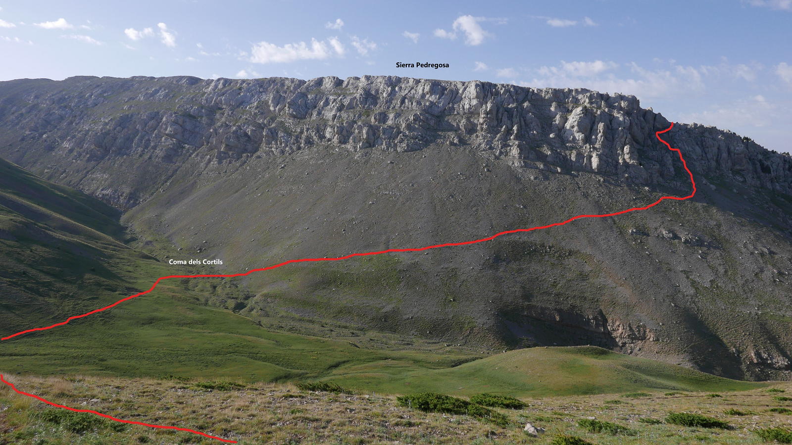 Atravieso otra valla (2260m 0h50′) que será el punto de confluencia de la ruta de descenso. Ahora sigo sin senda hasta encontrar un gran hito (2310m 0h57′) que marca el paso de la Sierra Pedregosa. hay que descender al valle que me separa de la Sierra Cabirolera, valle dels Cortils. La primera parte del descenso es una senda muy pendiente junto a la pared rocosa, con señalización de pintura roja; después la bajada es más suave. El punto más bajo es la vaguada en Font dels Cortils (2185m 1h12′), pasando junto a un abrevadero.