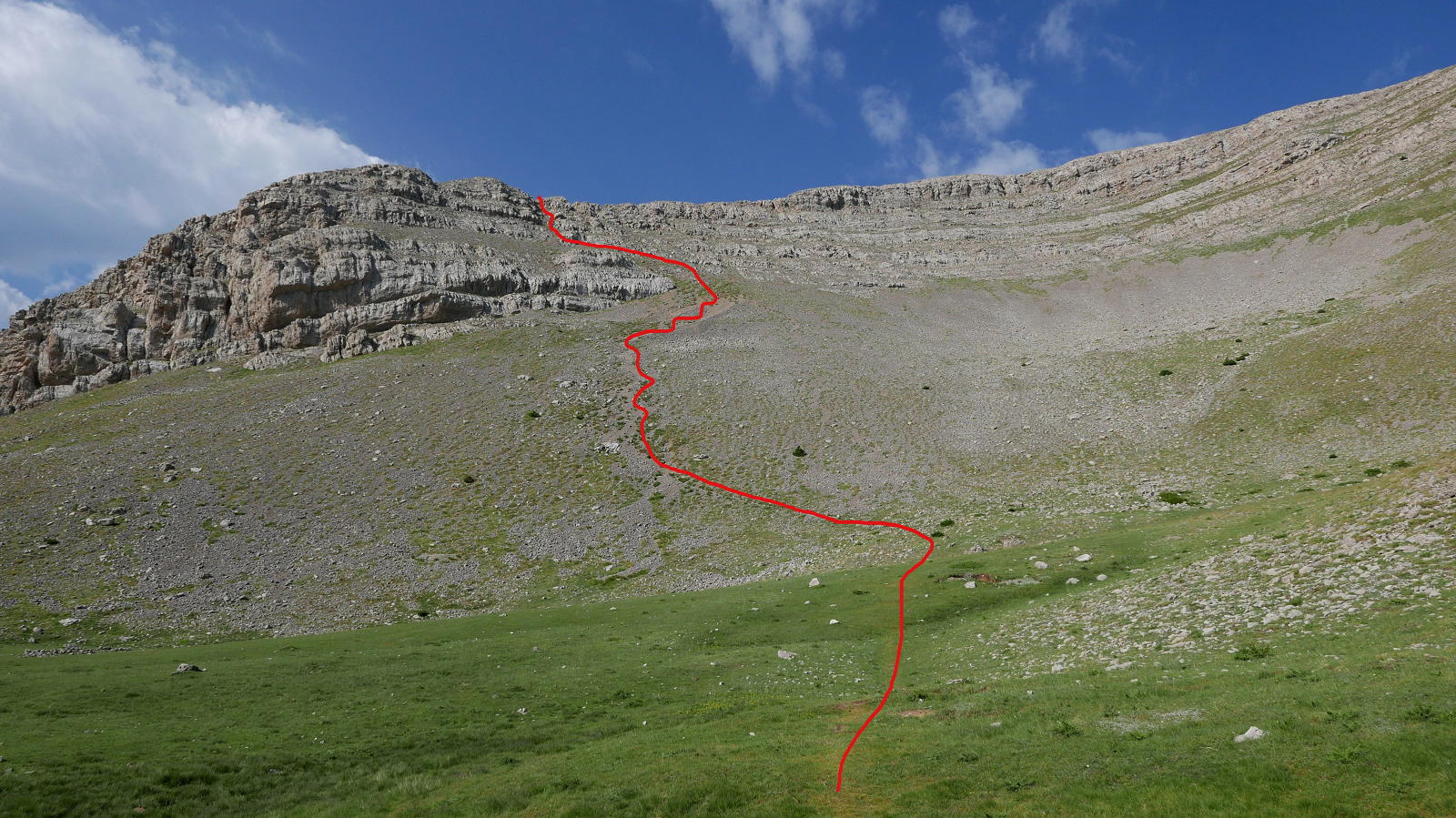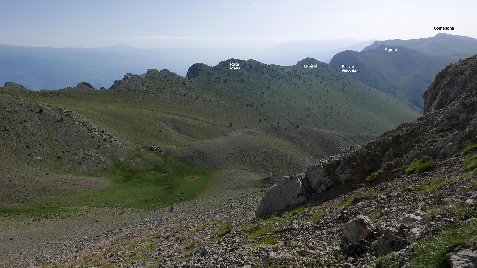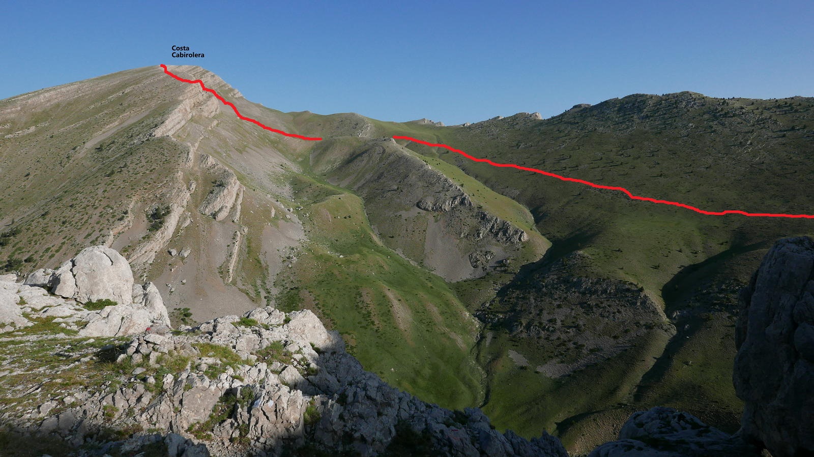 Bajo por la misma ruta al prado de la estelada y, un poco más adelante, me desvío del camino de subida para dirigirme a la izquierda en subida diagonal sin senda hacia la cresta de la Sierra Cabirolera por terreno de hierba y karst. Alcanzo la cresta (2405m 2h52′) y me asomo a la vertiente norte que es una impresionante caída de roca abrupta y vertical. Voy a seguir toda la cresta hacia el este sin problemas, ya que esta vertiente sur es una suave ladera herbosa, pasando los siguientes puntos: