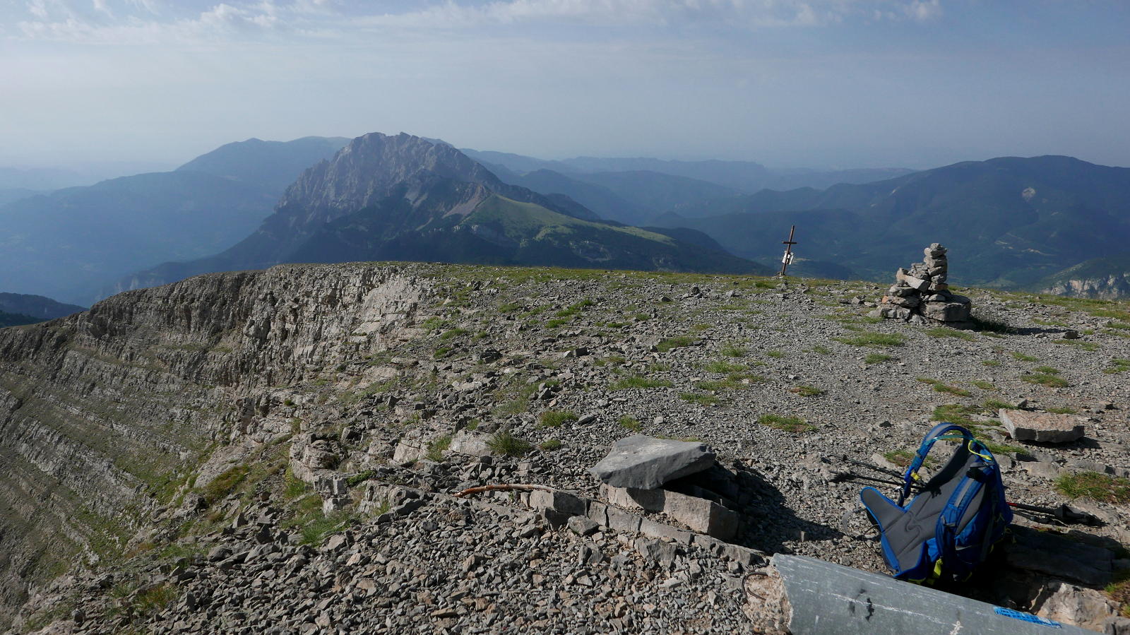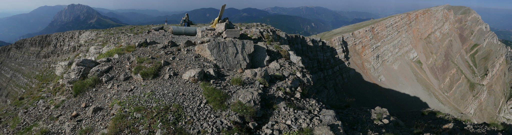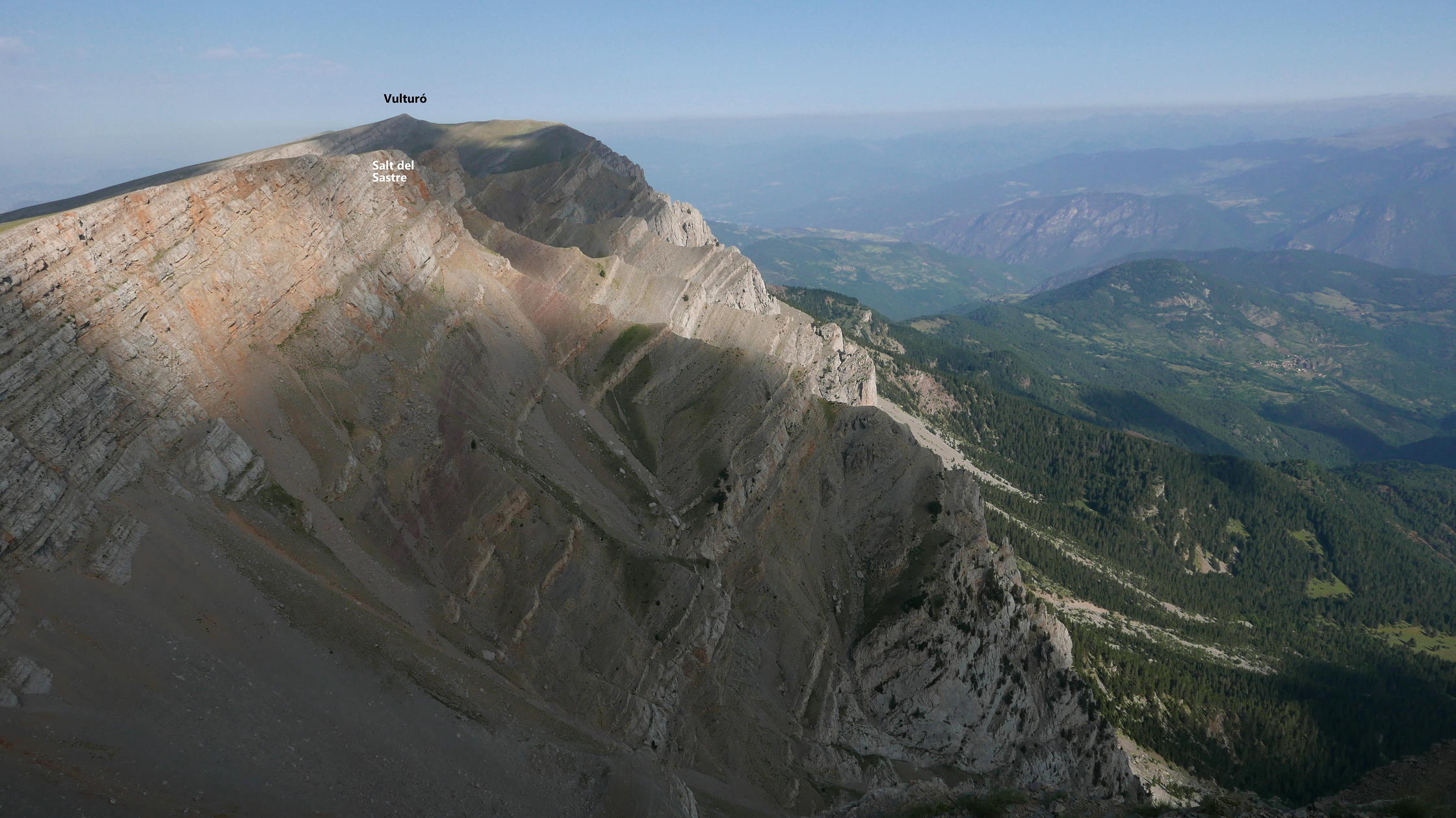 Bajo por la misma ruta al prado de la estelada y, un poco más adelante, me desvío del camino de subida para dirigirme a la izquierda en subida diagonal sin senda hacia la cresta de la Sierra Cabirolera por terreno de hierba y karst. Alcanzo la cresta (2405m 2h52′) y me asomo a la vertiente norte que es una impresionante caída de roca abrupta y vertical. Voy a seguir toda la cresta hacia el este sin problemas, ya que esta vertiente sur es una suave ladera herbosa, pasando los siguientes puntos: