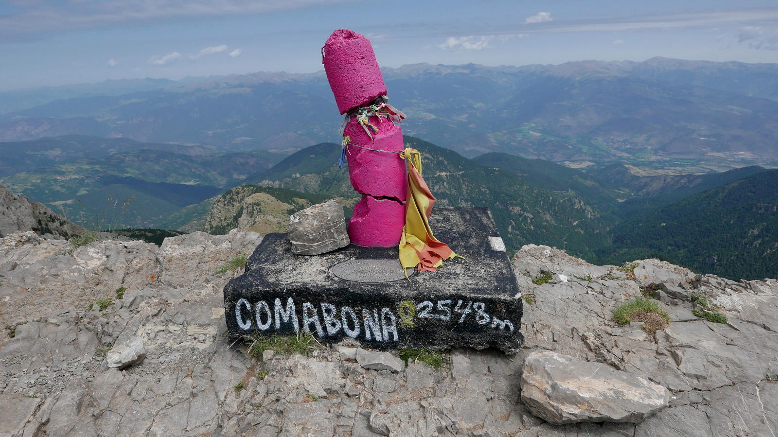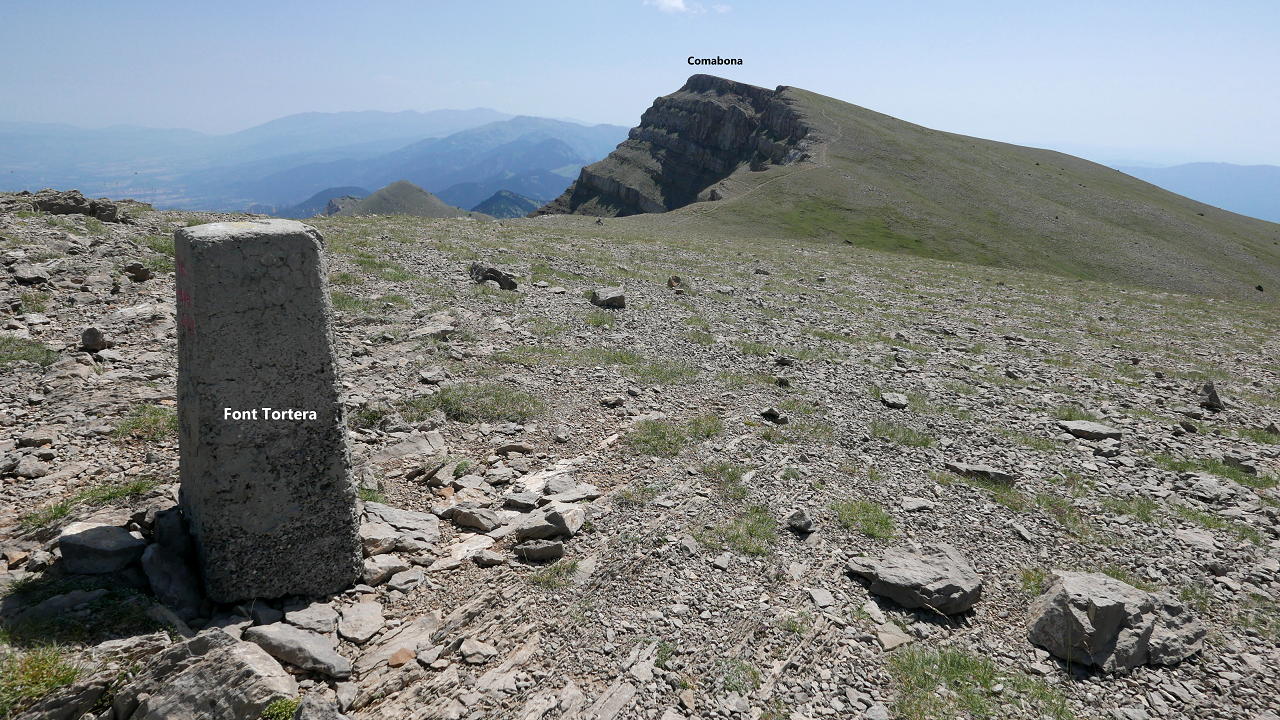 El Pas dels Gosolans es un cruce de caminos, uniría el camino que viene de la Sierra Pedregosa con el que va al refugio Prat d’Aguiló. Yo sigo hacia el este el GR-150-1 hacia Comabona, que se me antoja todavía bastante lejano. El sendero se pierde, pero por terreno herboso cómodo, no hay problema. Paso junto al pico Aguiló y encuentro un gran hito (2490m 4h27′) recuperando la senda balizada que me lleva al Puig de Font Tortera (2521m 4h31′) y, desde aquí, rápidamente al Comabona (2548m 4h41′).