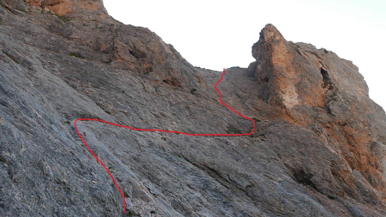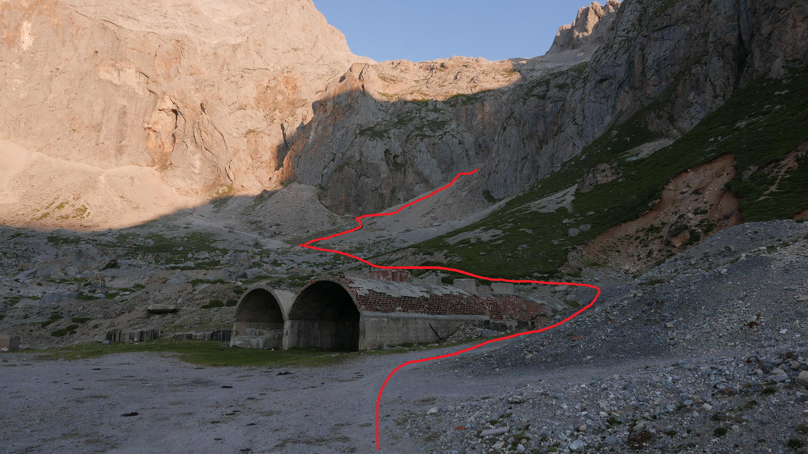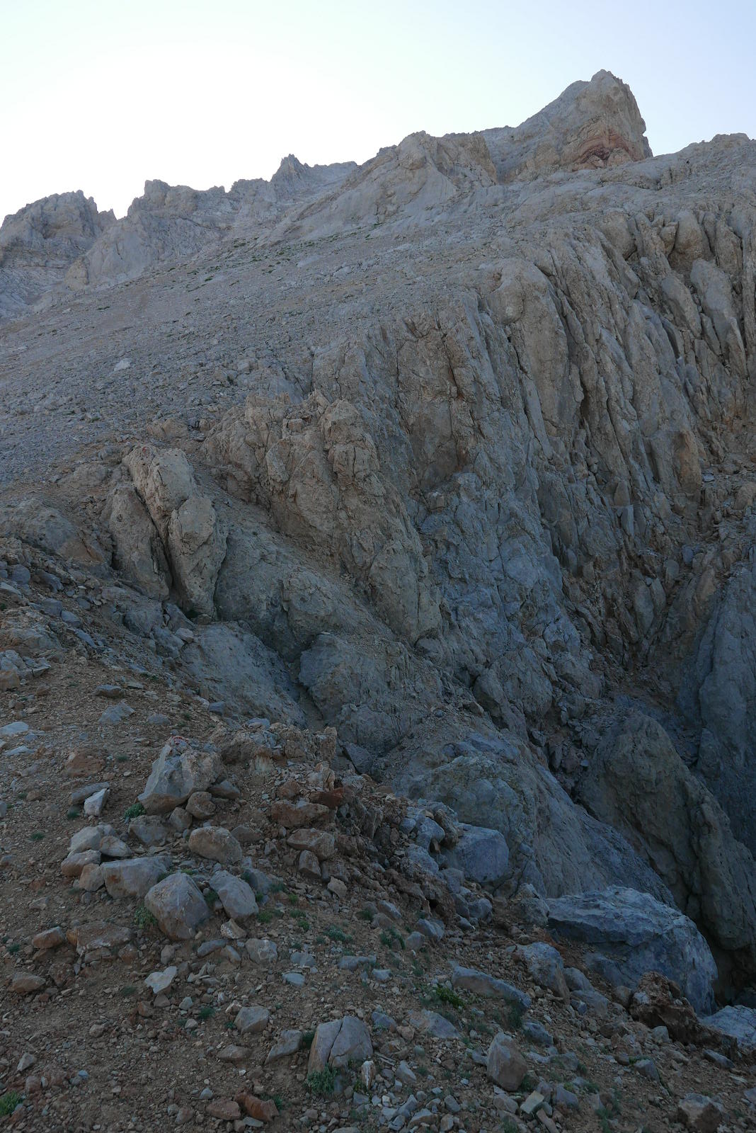 Desemboco en la pista (1540m 1h17′), paso junto a las instalaciones mineras y comienza la subida de la canal del Vidrio. El comienzo es más suave, pero luego se cierra la canal y se llega a una zona rocosa. Veo una vira (1850m 1h51′) en la roca hacia la derecha, la tomo y al final de la vira empiezo a trepar la pared de mi izquierda siendo un tramo comprometido, pero me permite acceder a un lomo herboso (1880m 2h00′). Un poco más arriba veo dos hitos y una marca roja (1890m 2h03′) que debe ser el acceso al lomo desde la canal; yo me he metido en una zona más complicada que no debe ser la correcta.