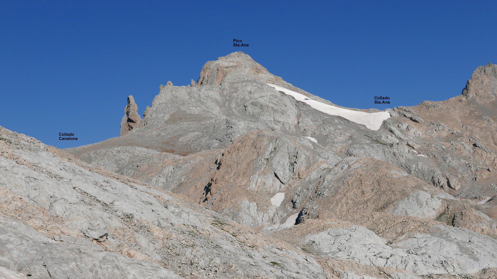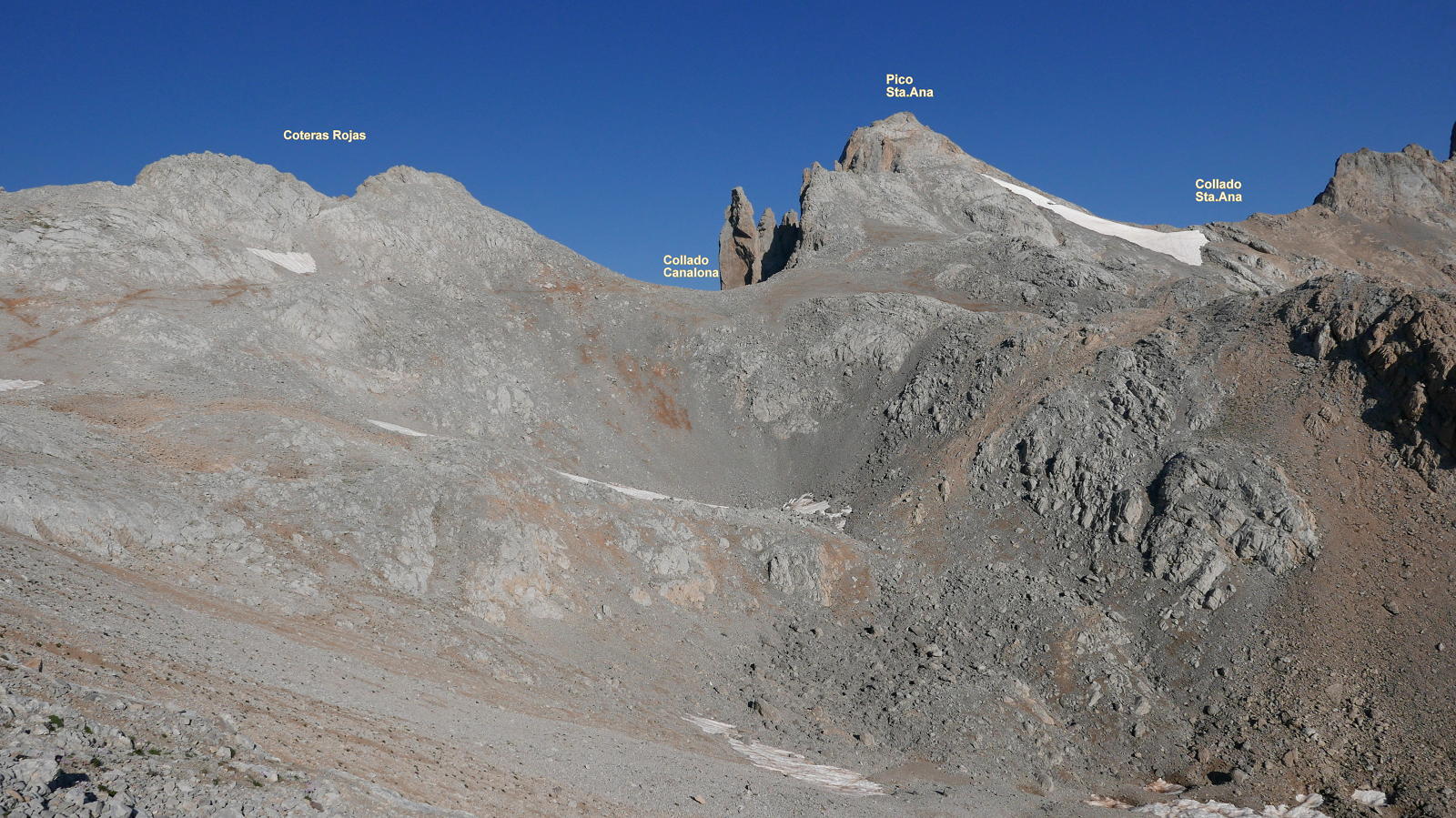 Vuelvo a la confluencia de sendas (2460m 4h10′) y sigo hacia el collado Canalona (2452m 4h21′). Debería bajar a la derecha, pero sigo hasta el collado Santa Ana (2503m 4h30′) pasando un nevero. Desde este collado desciendo hacia una senda con numerosos hitos (2470m 4h36′) que baja a confluir con la senda que viene del collado Canalona (2420m 4h43′). A partir de aquí, al principio senda buena, pero luego terreno rocoso y pedregoso incómodo, esquivando jous. Siempre con hitos, pero algún tramo es confuso.