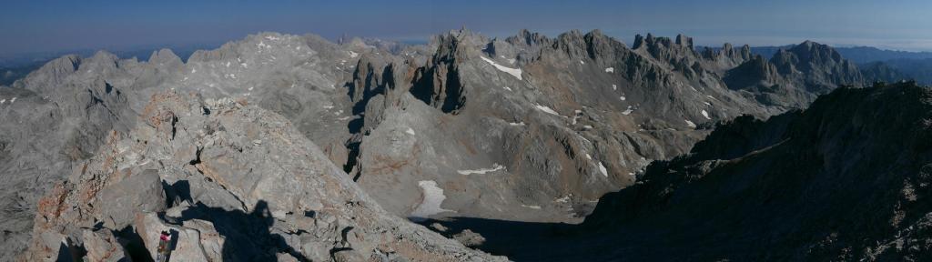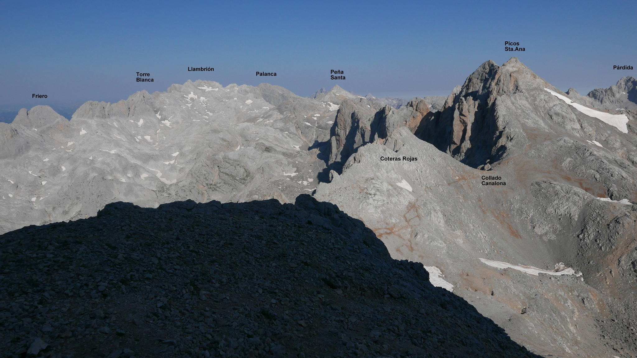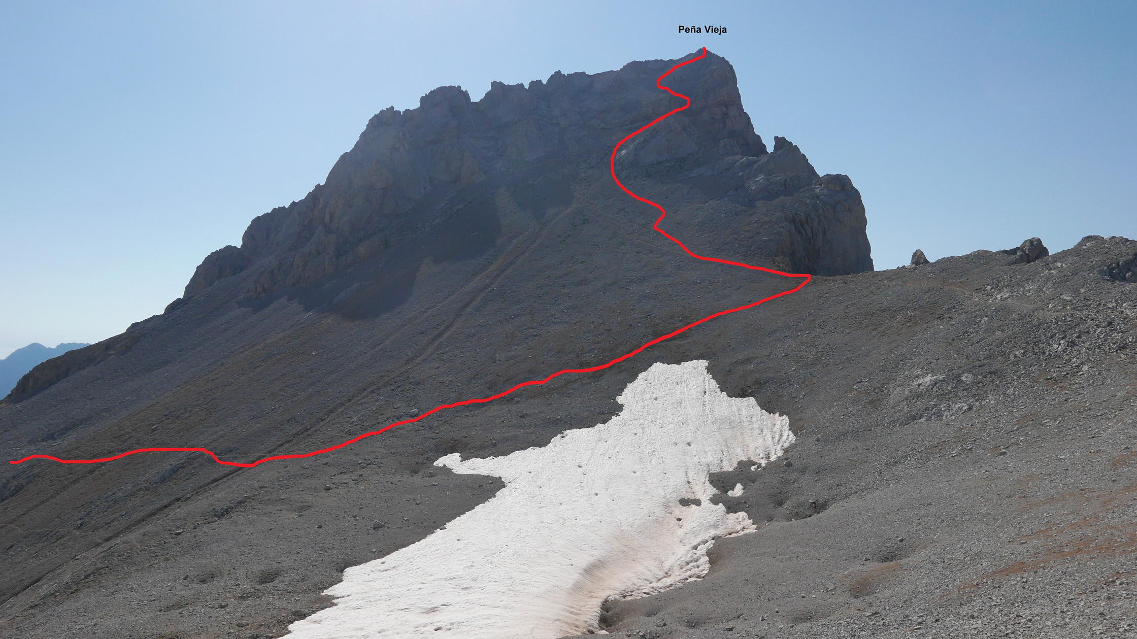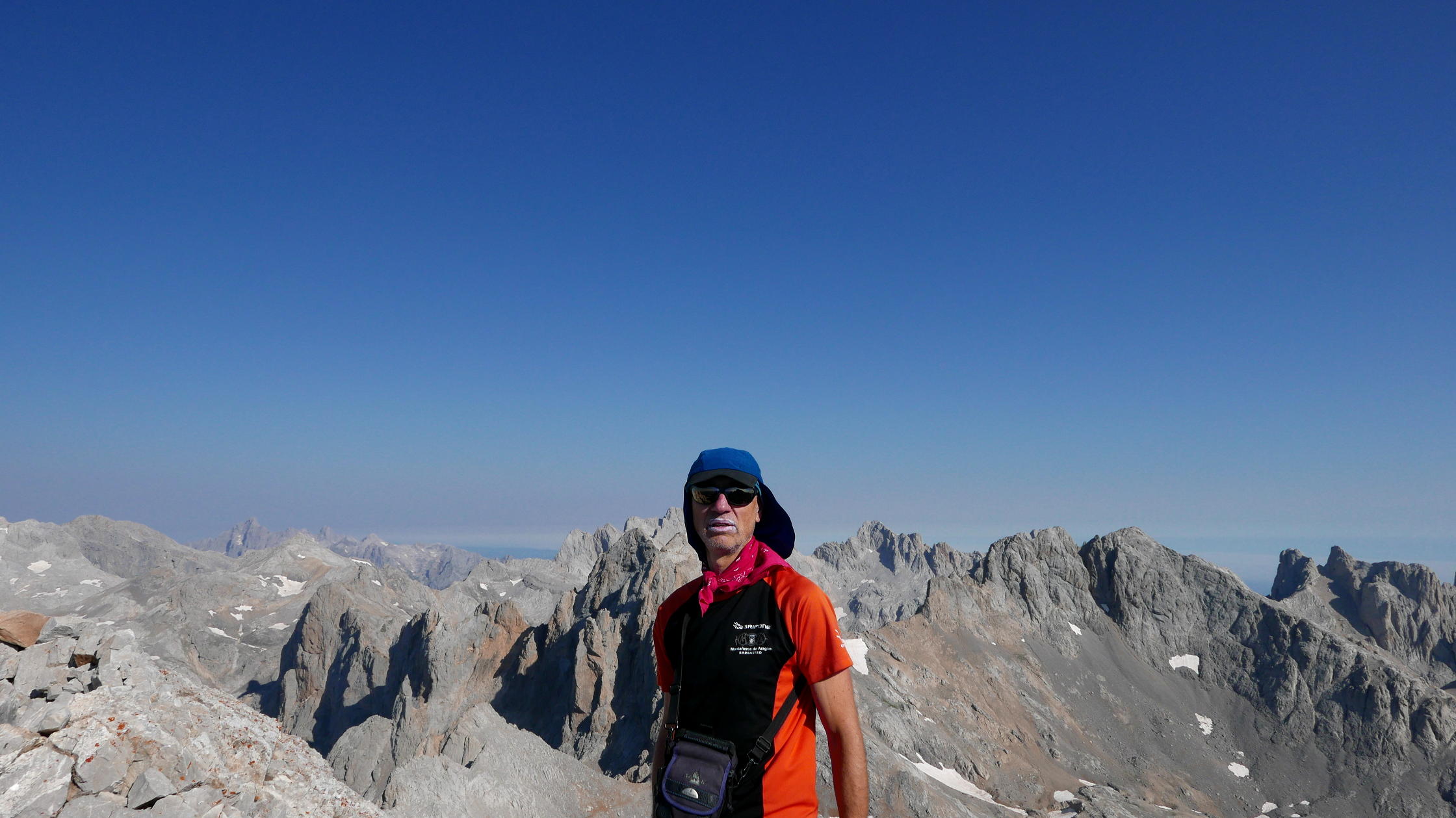 Sigue la canal, pero más amplia, con senda clara y zonas algo herbosas. Al final se va volviendo más rocosa. Considero el final de la canal (2195m 2h40′) y paso a la subida hacia el collado. Hay hitos y señales de pintura verde y de pintura roja, aunque siempre escasas. Giro a la izquierda (2425m 3h08′), hay huella de paso en zona rocosa y confluye con la senda que viene del collado Canalona (2460m 3h12′). Yo voy a la izquierda a encarar la subida final. Sigo huella de paso, algún tramo hay que apoyar las manos pero todo sin dificultad hasta la cima (Peña Vieja 2617m 3h33′) donde paso 25 minutos haciendo fotos y admirando las cumbres de Picos de Europa que me rodean.
