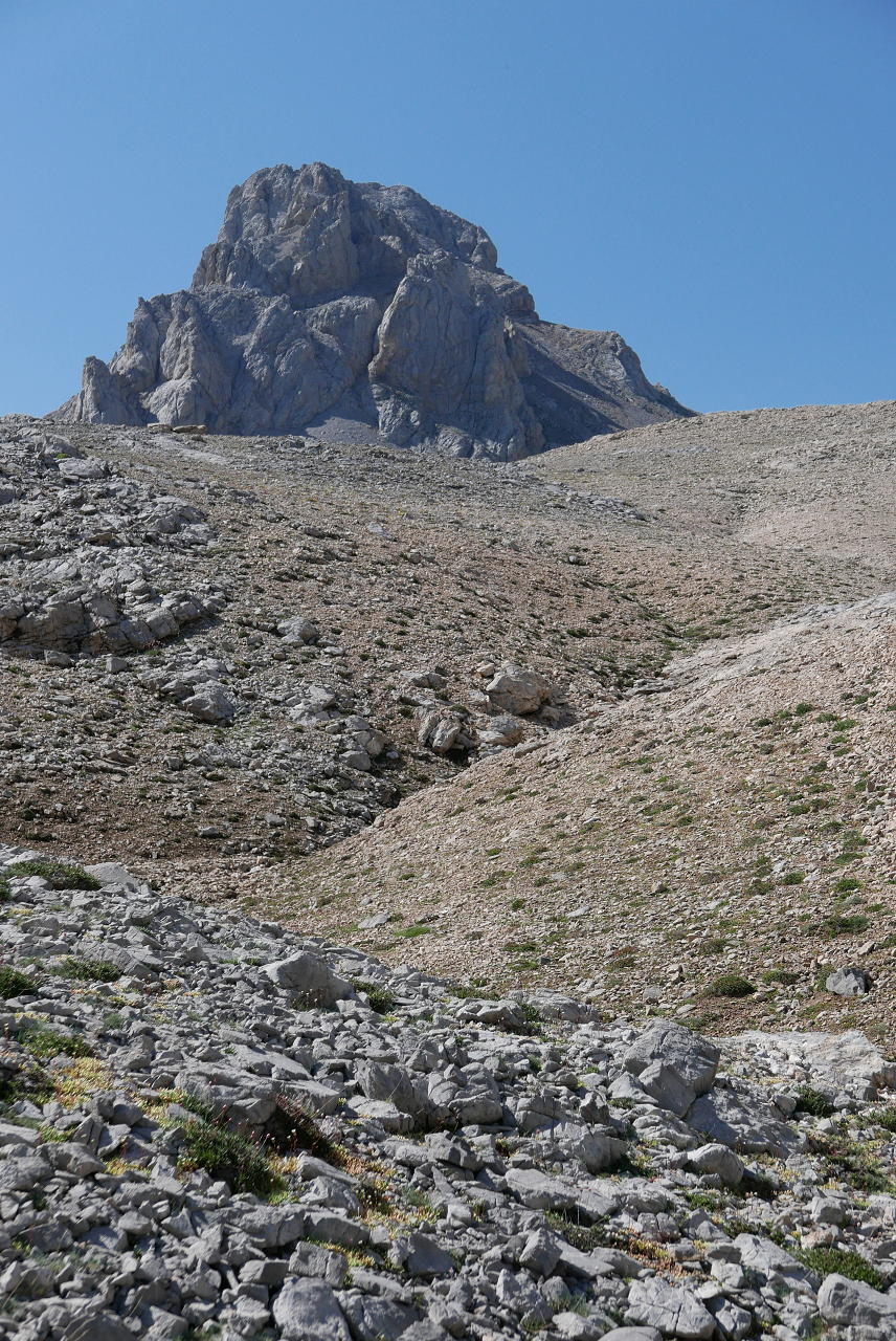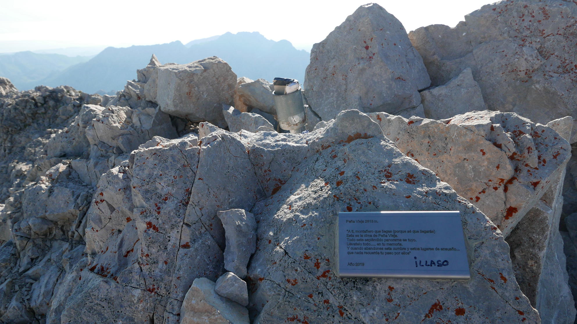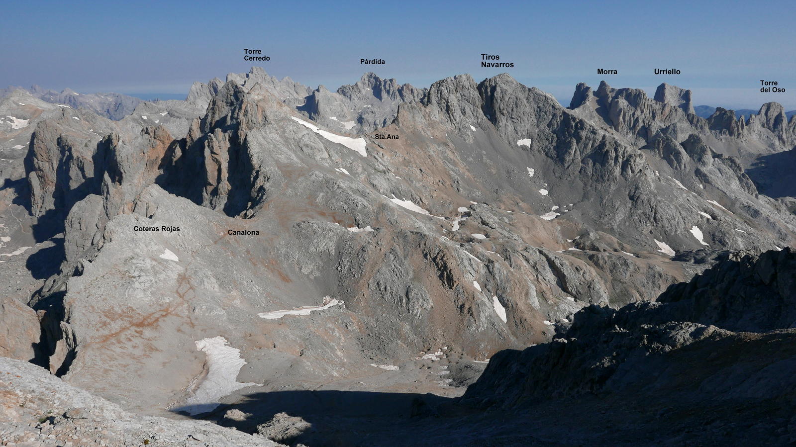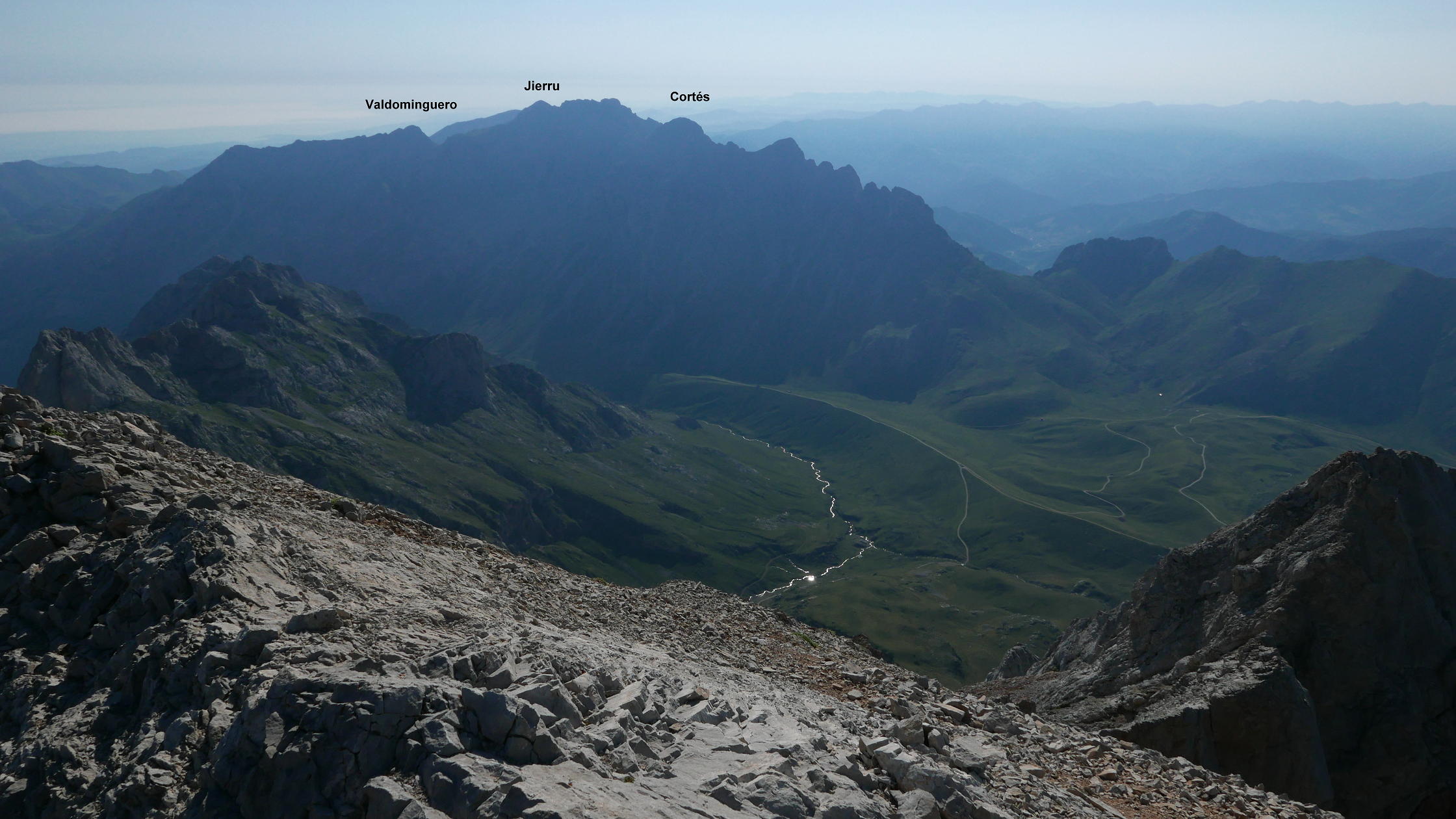 Sigue la canal, pero más amplia, con senda clara y zonas algo herbosas. Al final se va volviendo más rocosa. Considero el final de la canal (2195m 2h40′) y paso a la subida hacia el collado. Hay hitos y señales de pintura verde y de pintura roja, aunque siempre escasas. Giro a la izquierda (2425m 3h08′), hay huella de paso en zona rocosa y confluye con la senda que viene del collado Canalona (2460m 3h12′). Yo voy a la izquierda a encarar la subida final. Sigo huella de paso, algún tramo hay que apoyar las manos pero todo sin dificultad hasta la cima (Peña Vieja 2617m 3h33′) donde paso 25 minutos haciendo fotos y admirando las cumbres de Picos de Europa que me rodean.