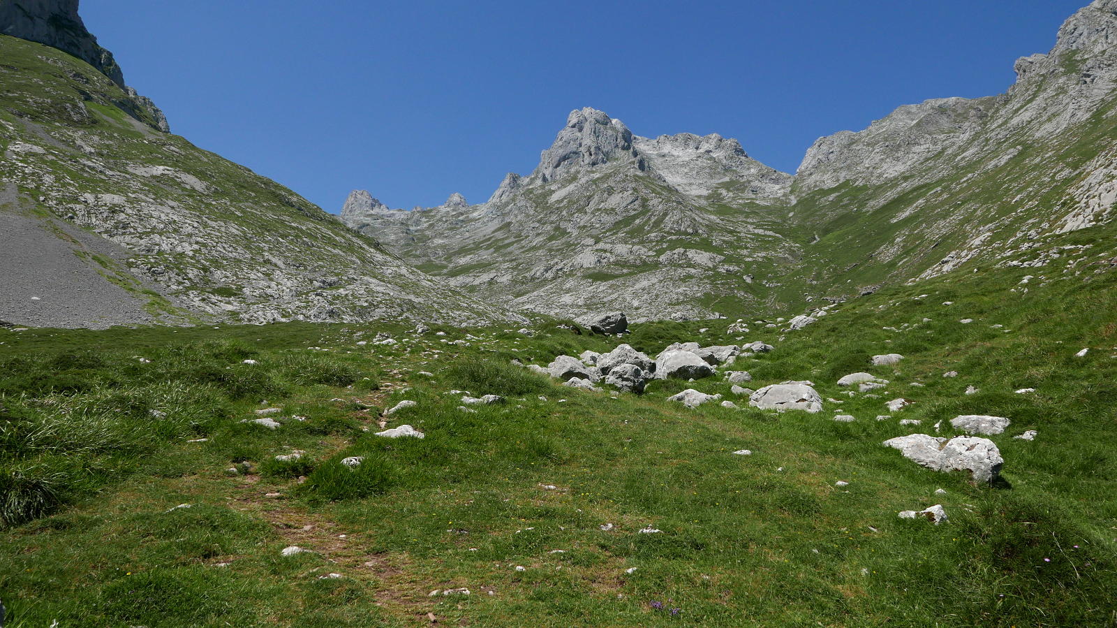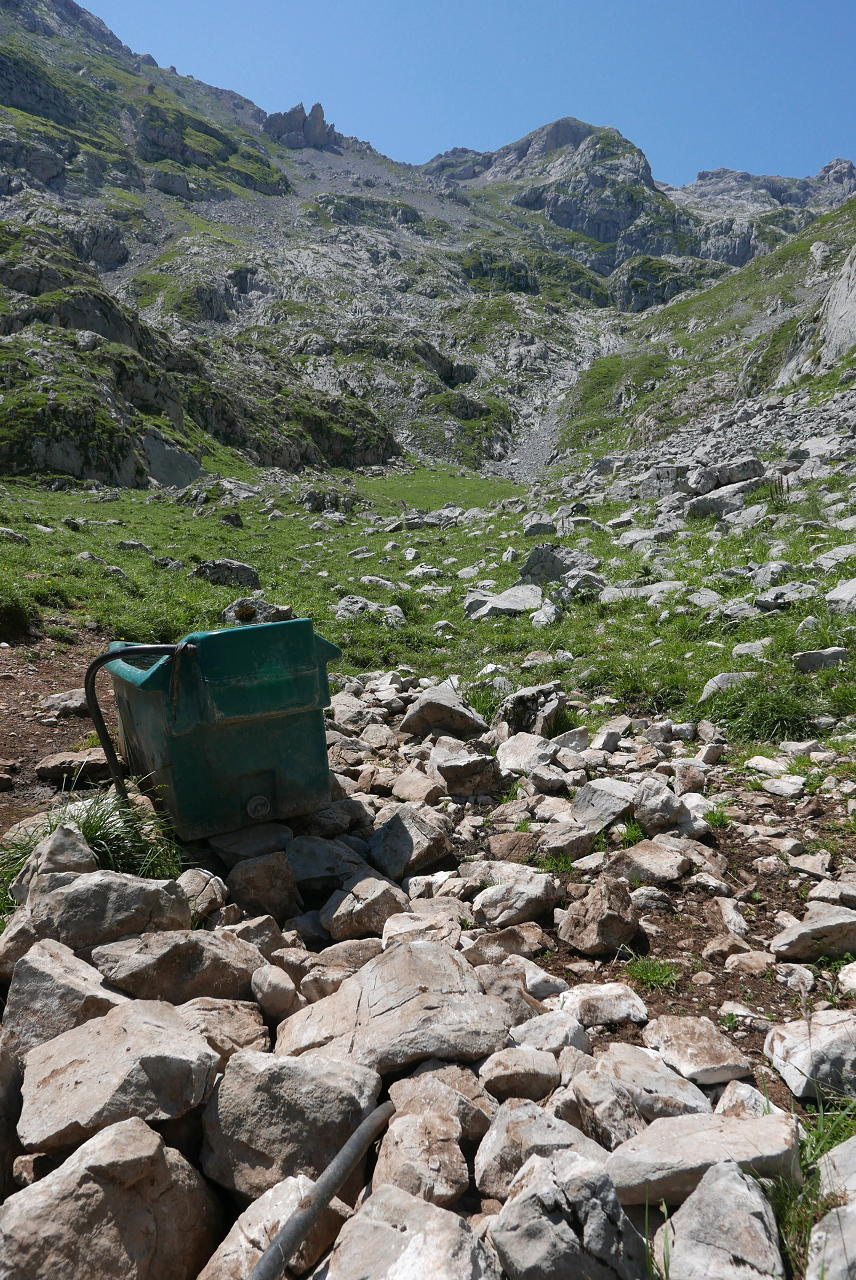 Sigo hitos a la derecha (2305m 4h57′), parece que también hay hitos a la izquierda. Llego por fin a una zona con verde (1765m 6h11′), que se agradece un poco de hierba y unos metros más allá me asomo al curioso lago de Moñetas. Bajo a la izquierda por una canal estrecha y pendiente con vegetación que conecta sin problemas con la senda que viene del lago. Hay hierba, pero sigue habiendo mucha piedra. Hay una bañera (1510m 6h34′) con agua para las vacas. Unión (1445m 6h42′) con otro camino que viene de la izquierda , porque veo hitos que bajan desde allí. Descenso por un valle más amplio y más herboso y ya veo la pista de la Vega de Sotres.