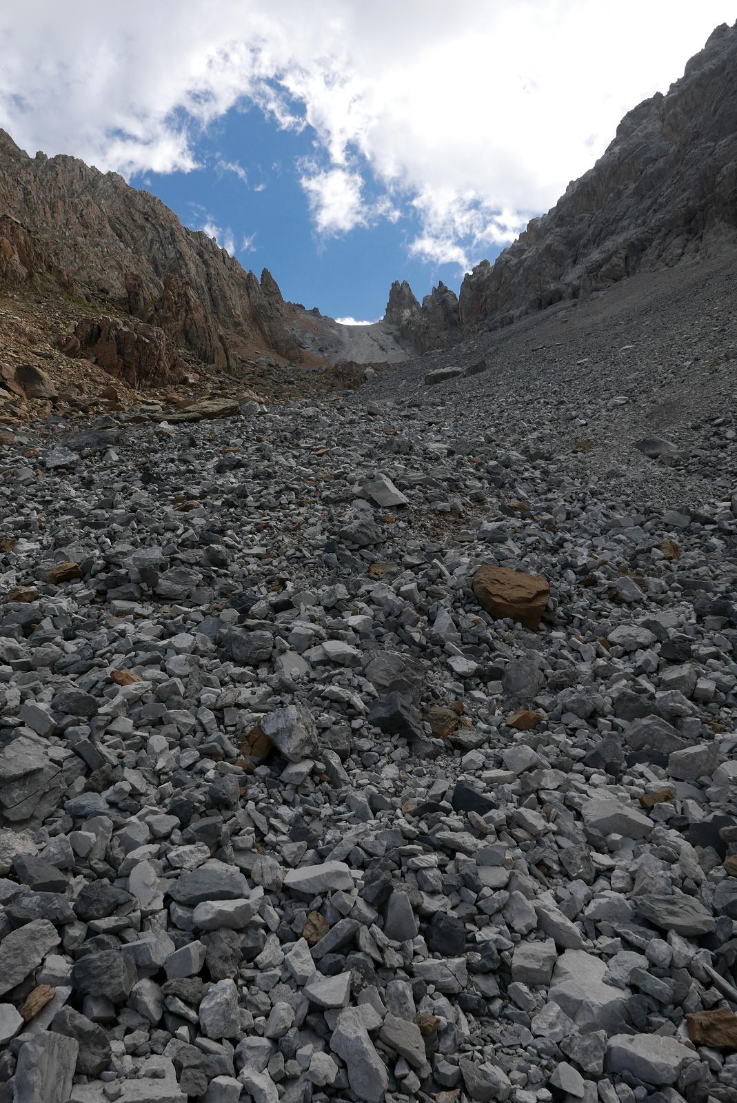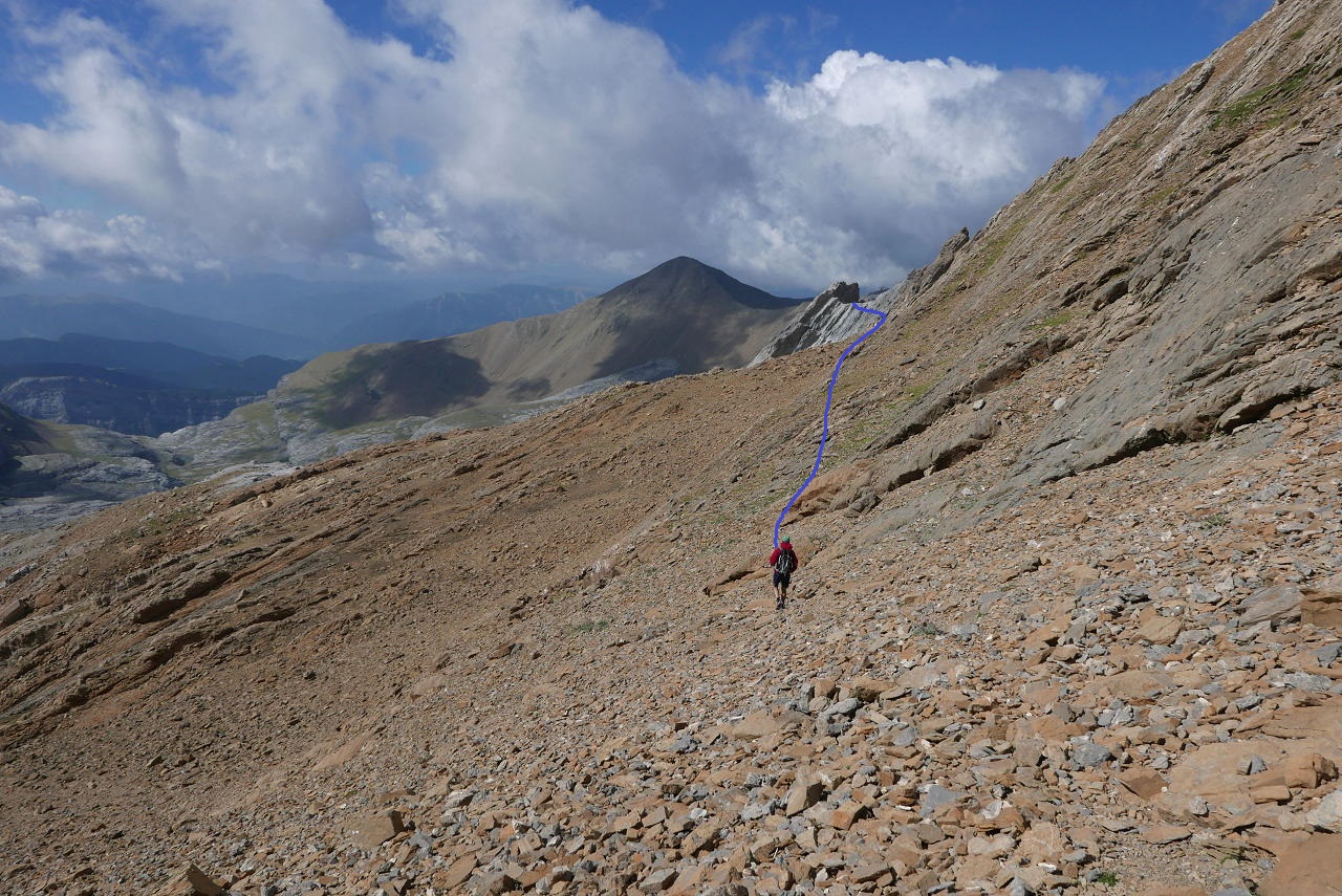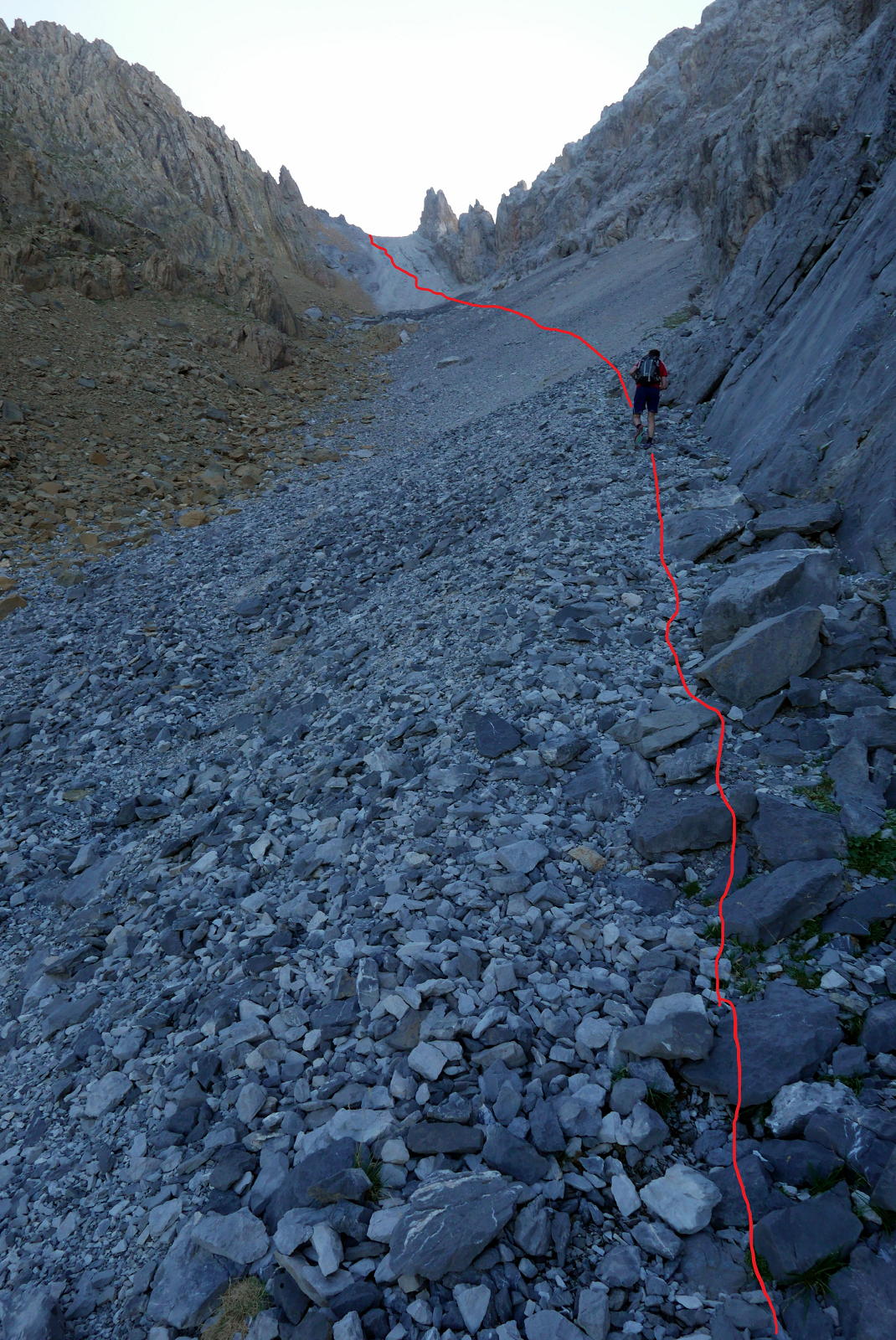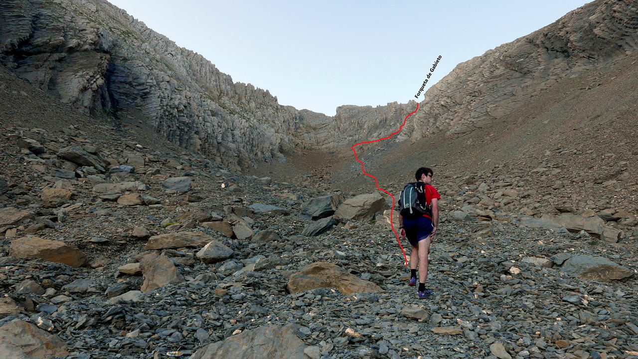 Pasados unos lomos herbosos con menos pendiente conectamos con el camino que viene del puerto de Bujaruelo (2385m 1h46′) y continuamos por traza de senda clara hasta la Forqueta Escuzana (2516m 1h57′) a la que se accede cuando te acercas a las paredes de apariencia infranqueable y la senda gira a la derecha, subiendo un tramo de fuerte pendiente por tierrilla. Al otro lado de la Forqueta se desciende mediante unos destrepes en la roca y luego, sin perder mucha altura, hasta el fondo de un vallecito. Si se cruza este valle y se continúa recto nos meteríamos en la Faja Escuzana; nosotros desde el fondo de valle (2525m 2h14′) giramos a la izquierda para ascender por este estrecho valle pedregoso con piedra parda a la izquierda y gris a la derecha. Ascendemos por la parte de piedra gris por una huella de paso que, dentro de lo que cabe, facilita un poco el ascenso. El descenso por aquí será bastante rápido.