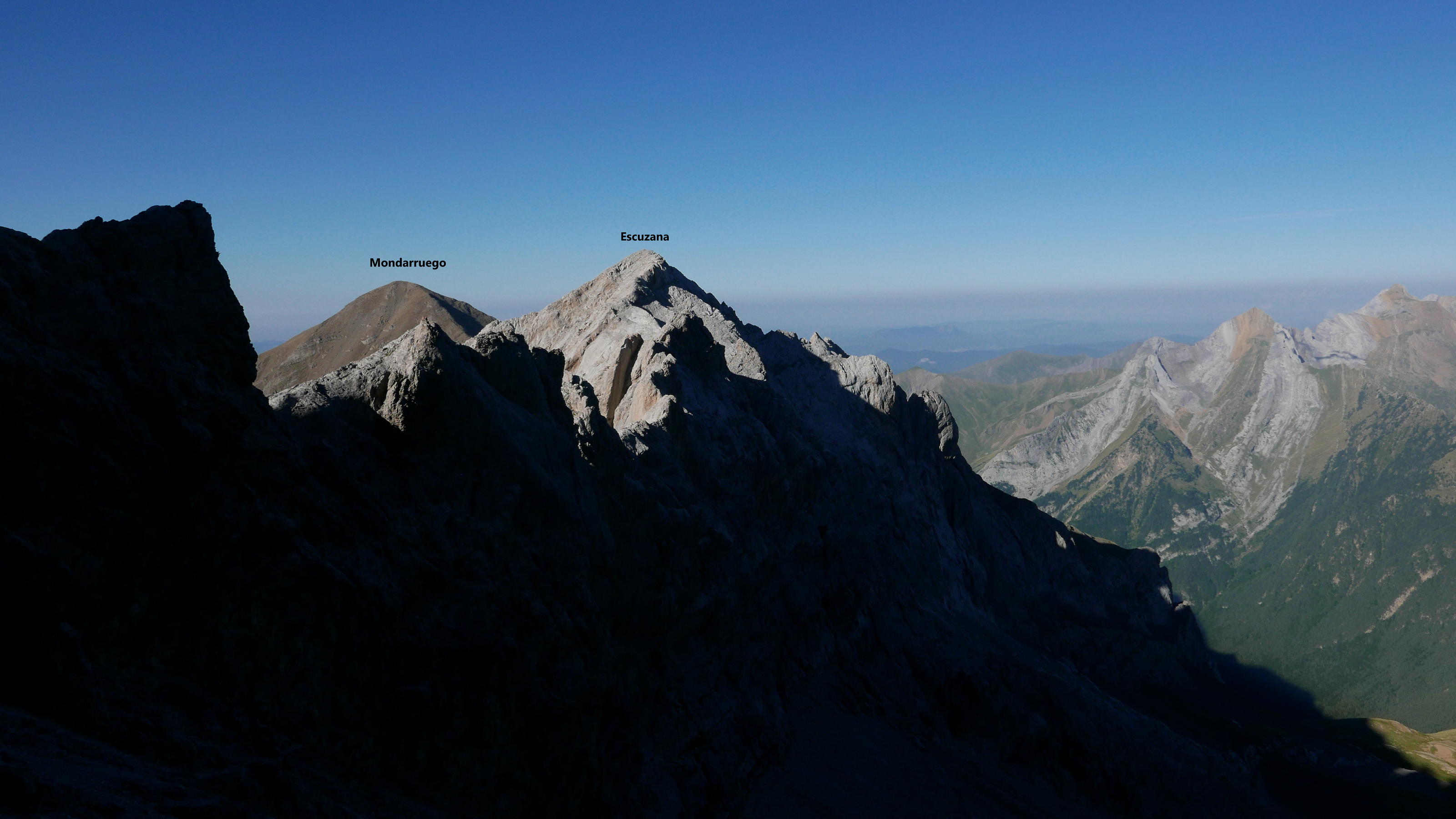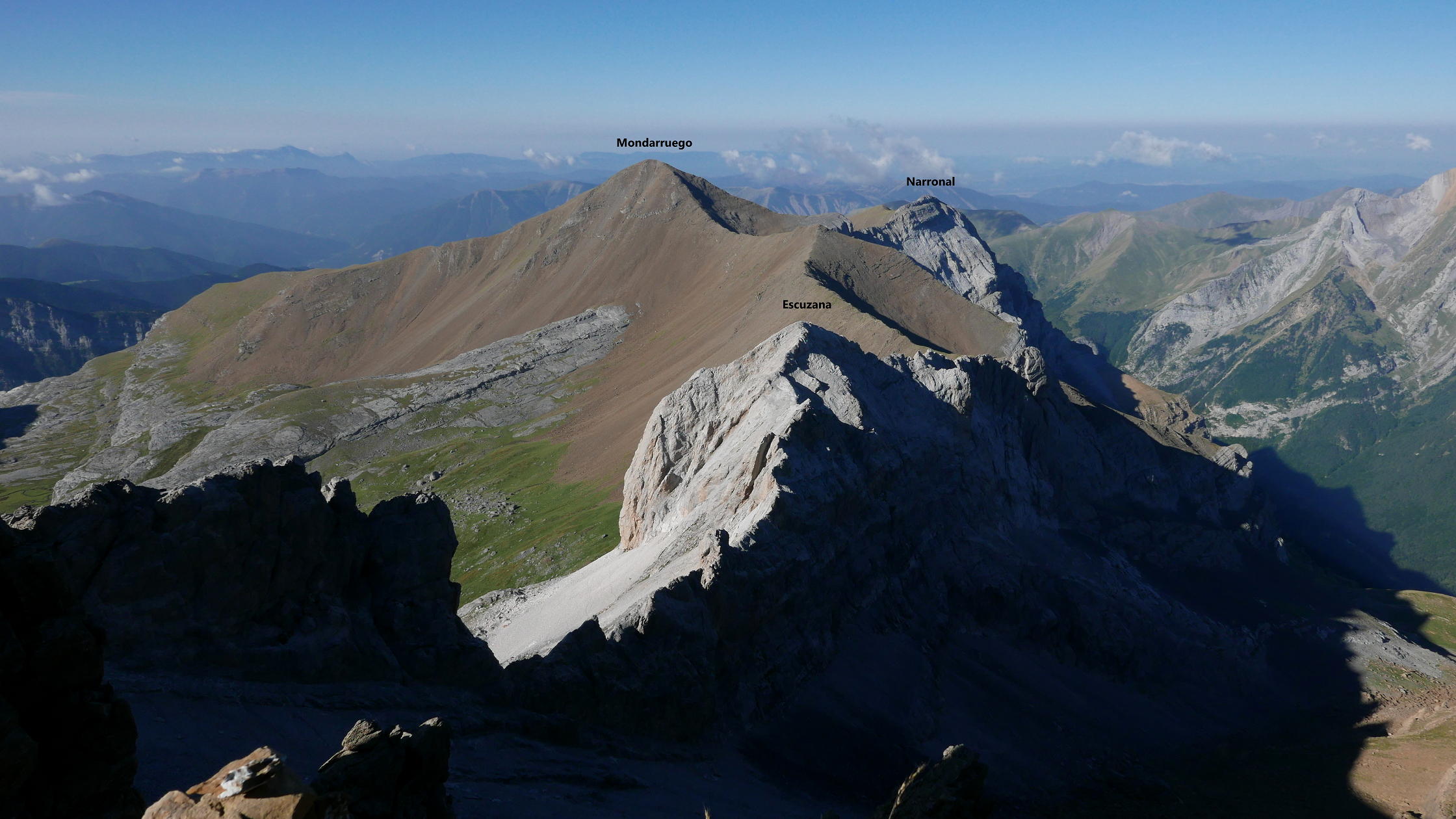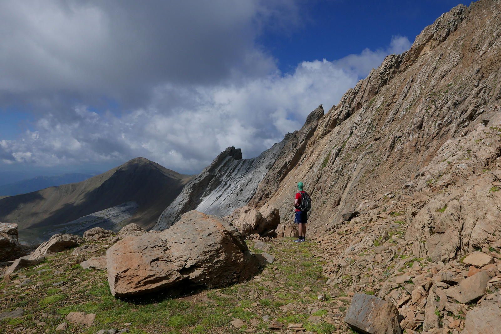 Pasados unos lomos herbosos con menos pendiente conectamos con el camino que viene del puerto de Bujaruelo (2385m 1h46′) y continuamos por traza de senda clara hasta la Forqueta Escuzana (2516m 1h57′) a la que se accede cuando te acercas a las paredes de apariencia infranqueable y la senda gira a la derecha, subiendo un tramo de fuerte pendiente por tierrilla. Al otro lado de la Forqueta se desciende mediante unos destrepes en la roca y luego, sin perder mucha altura, hasta el fondo de un vallecito. Si se cruza este valle y se continúa recto nos meteríamos en la Faja Escuzana; nosotros desde el fondo de valle (2525m 2h14′) giramos a la izquierda para ascender por este estrecho valle pedregoso con piedra parda a la izquierda y gris a la derecha. Ascendemos por la parte de piedra gris por una huella de paso que, dentro de lo que cabe, facilita un poco el ascenso. El descenso por aquí será bastante rápido.