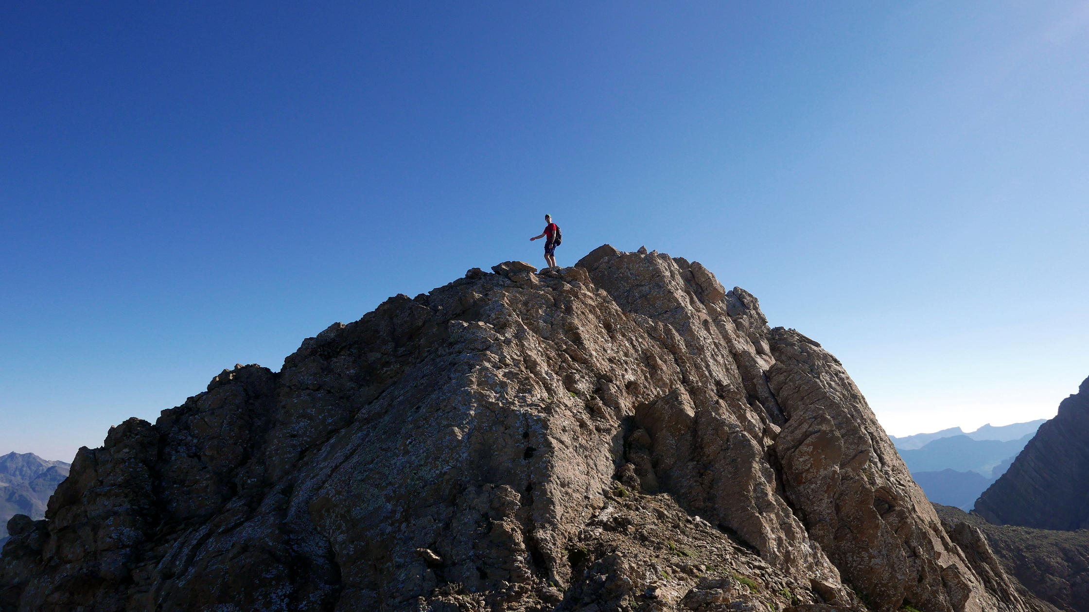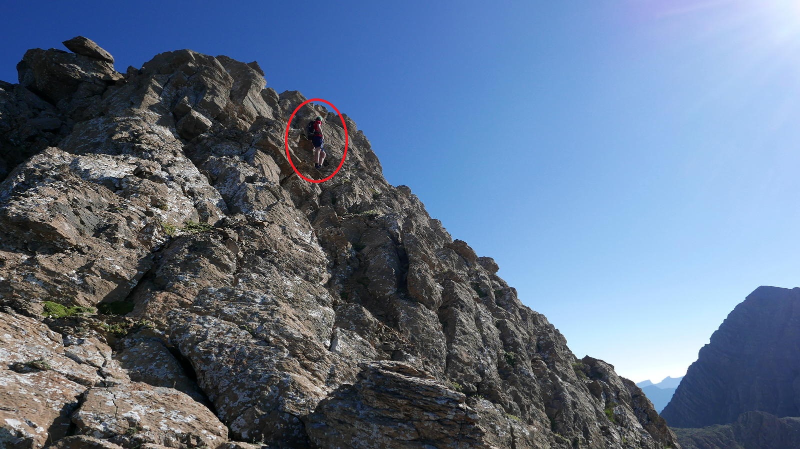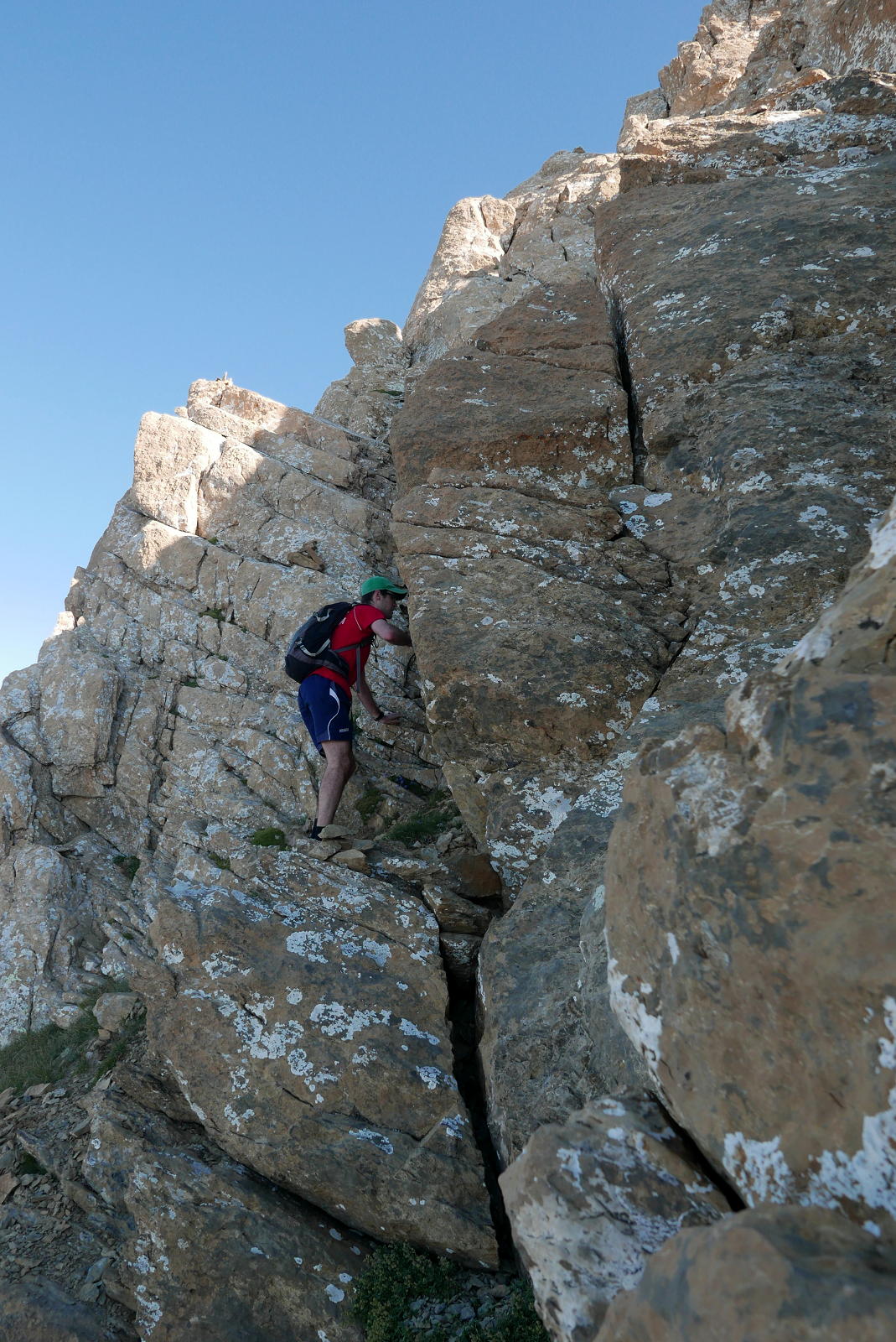 En la parte superior parece que se llega a un collado, pero no es tal, realmente es la cresta sur del Gabieto SW. Antes de llegar a ese aparente collado nos desviamos algo a la izquierda y accedemos a la cresta (2870m 2h58′). Martín toma la iniciativa y, con su habitual agilidad y sentido de la orientación, sigue la ruta marcada con hitos que nos lleva escalando, con pasos de IIº y IIº+, bastante expuestos, hasta la cima del Gabieto Suroccidental (3035m 3h39′).