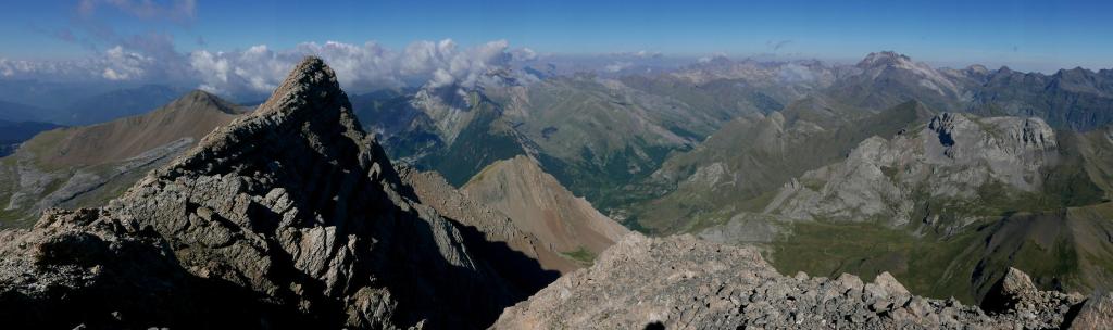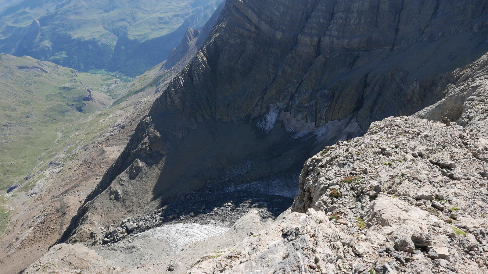 Un pequeño descenso y otra trepada nos lleva por la cresta, ya más fácil, al Gabieto Nororiental (3031m 4h08′), donde comemos algo y descansamos un rato (4h30′). El descenso hacia el Cuello de Gabieto es fácil. A nuestra izquierda el pequeño glaciar norte del Taillon, con una caída vertiginosa. Sin llegar al Cuello de Gabieto (2945m 4h39′) giramos a la derecha (SW) y descendemos por una senda que luego se pierde. Hay que ir faldeando la pared sur de los Gabietos, que está compuesta por pedreras y roca con mucha pendiente. Hay algún hito y a veces hay que pasar resaltes rocosos complicados. La clave es perder la menos altura posible ya que tenemos que volver a atravesar la cresta sur en el punto donde accedimos a ella durante la subida. Pasamos sobre esta cresta sur (2865m 5h22′) para afrontar el descenso de la pedrera, buscando las zonas de piedra fina para bajar con rapidez y seguir la misma ruta de ascenso hasta Bujaruelo (1330m 7h31′)