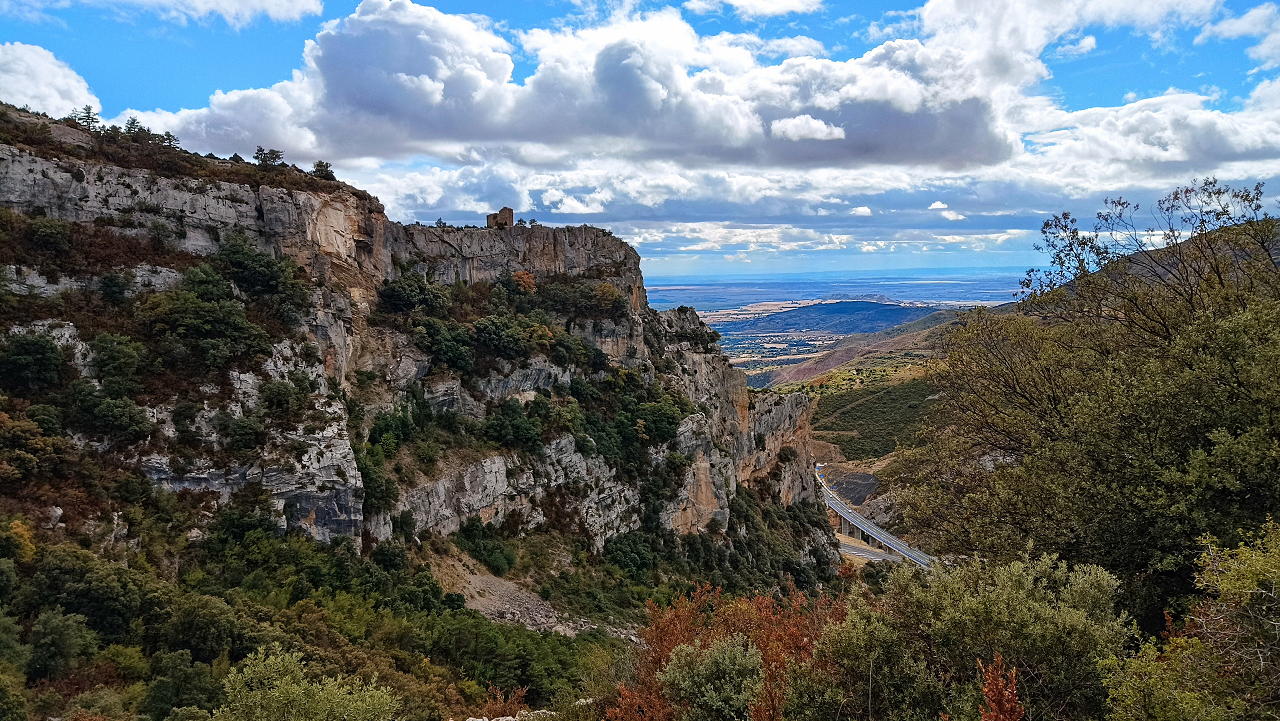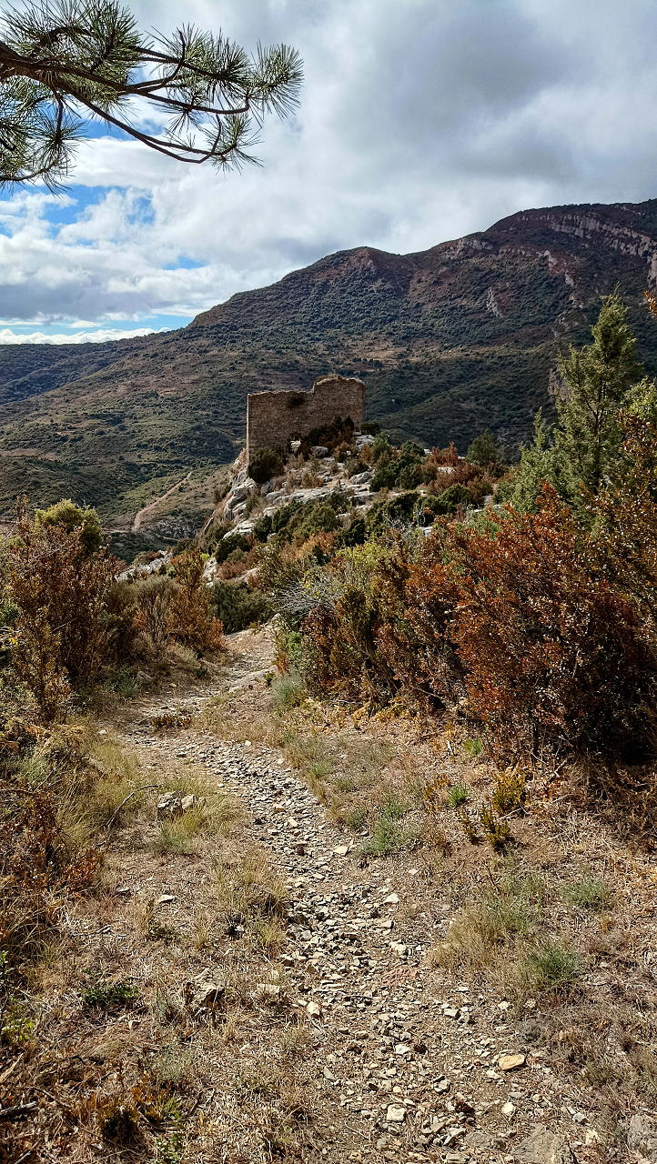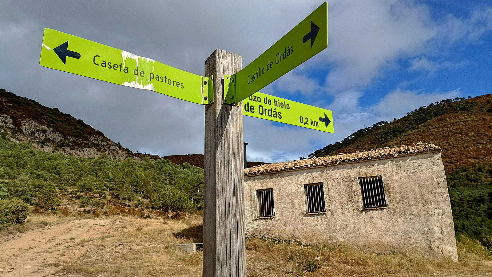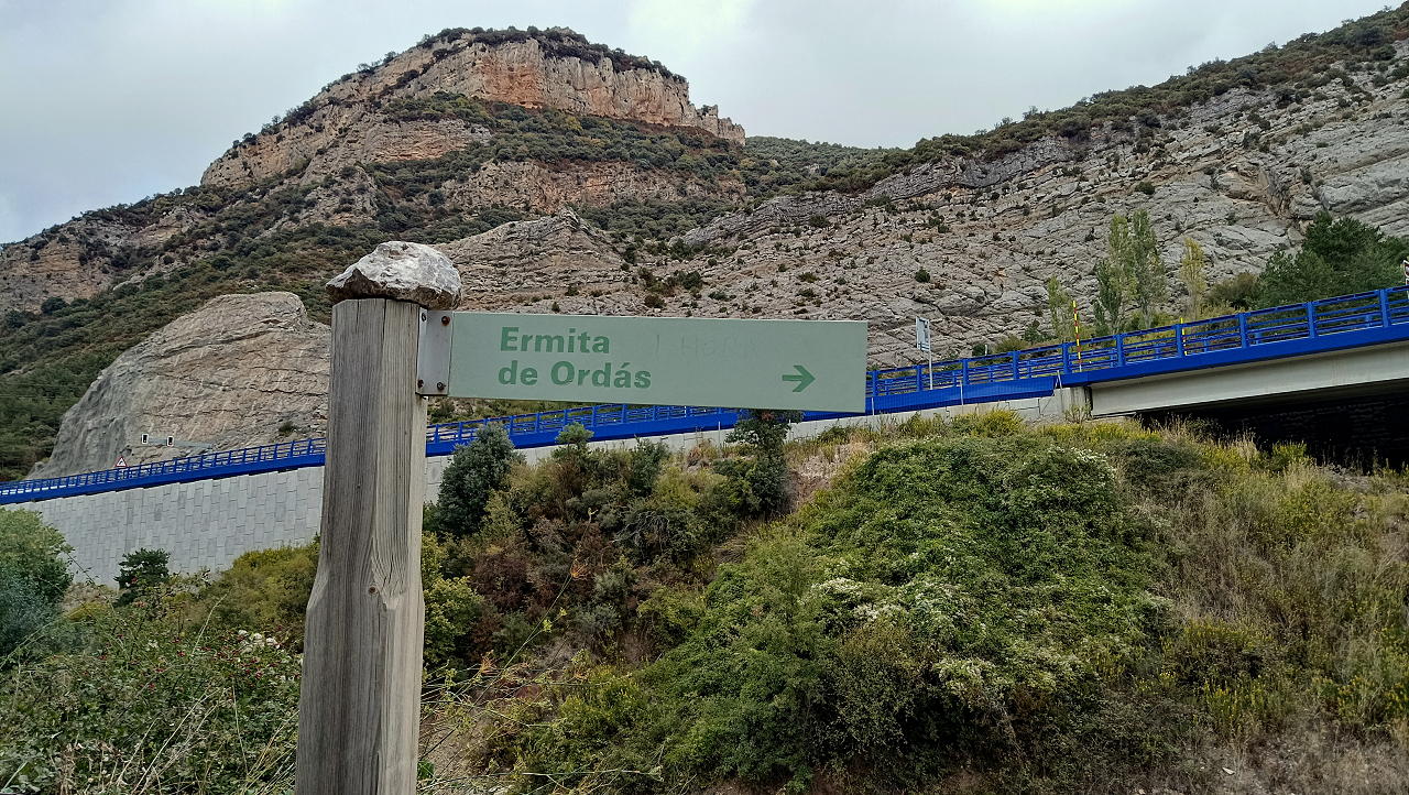 Se pasa junto a una cabaña de piedra de pastores (1055m 0h19′) y se llega a la ermita de Ordás (1090m 0h25′) que, como edificio, no tiene ningún interés. Más atractivo es acercarse a las ruinas del castillo (1065m 0h30′) que se alza sobre un espolón rocoso con espectaculares vistas de la Hoya de Huesca, por un lado, y el congosto del Isuela por otro. De vuelta a la ermita sigue una pista, pasa junto a una balsa de agua que está seca, y enseguida se toma una senda a la izquierda con un hito señalizador y con fuerte subida.