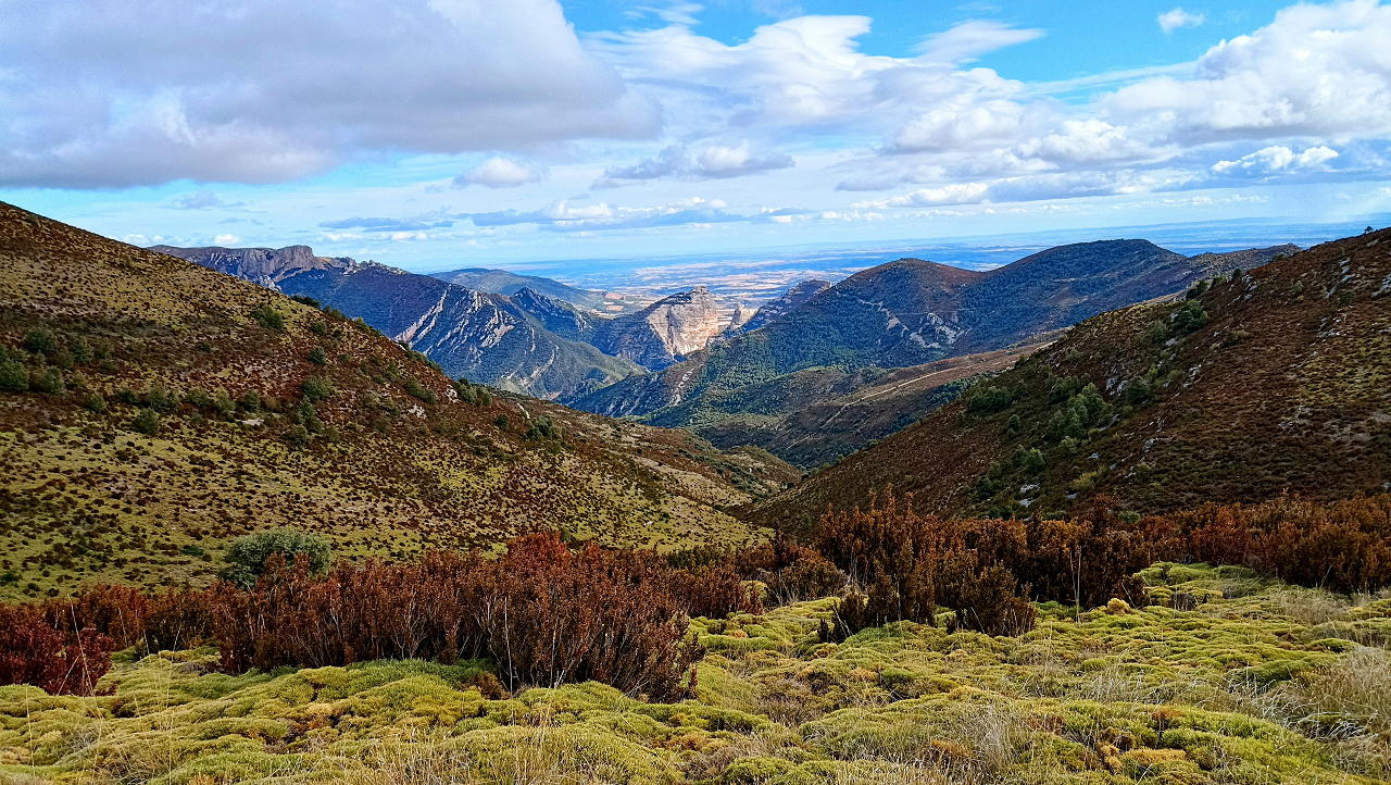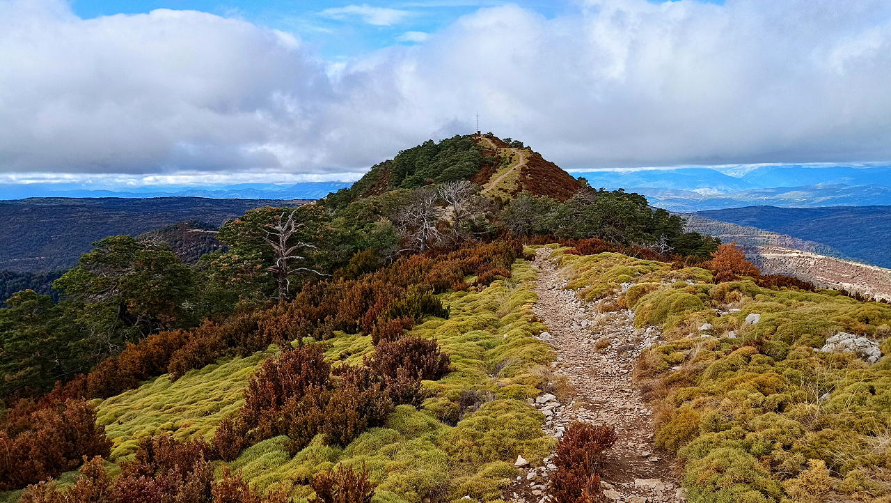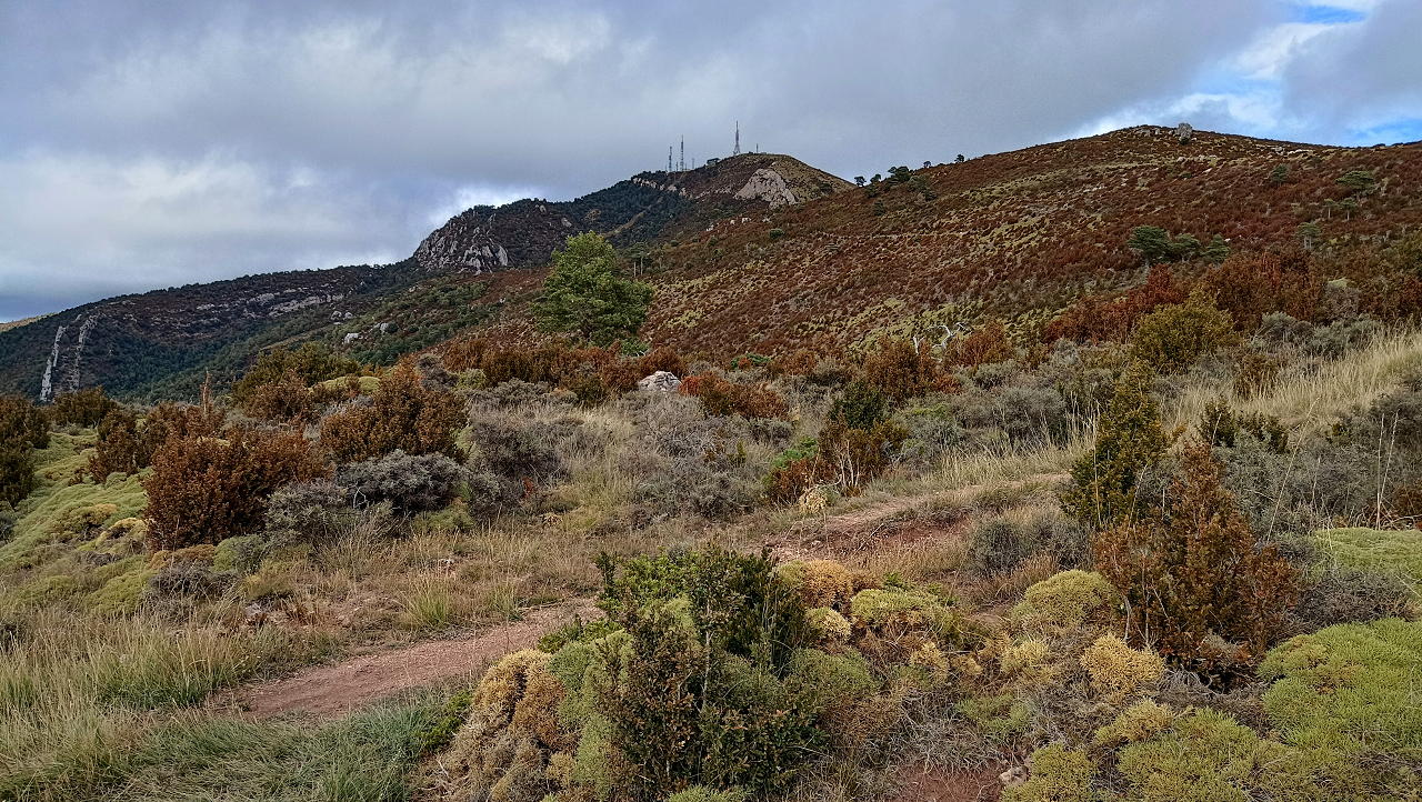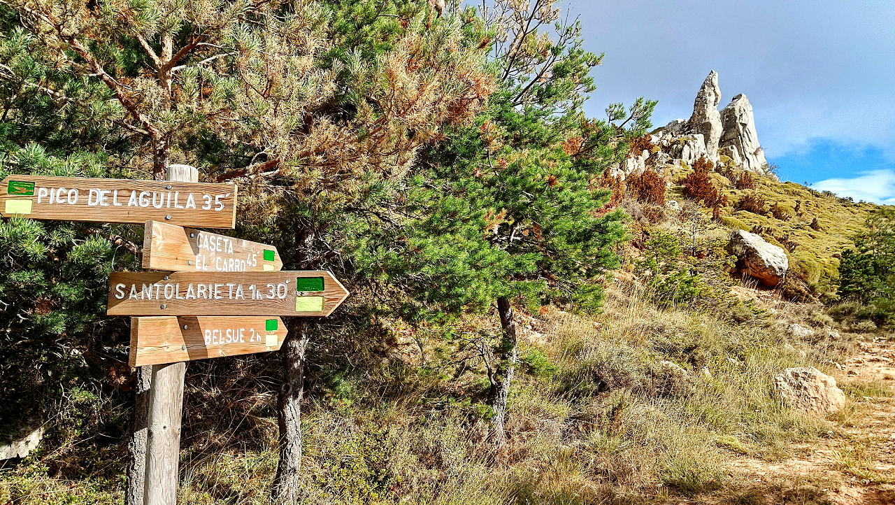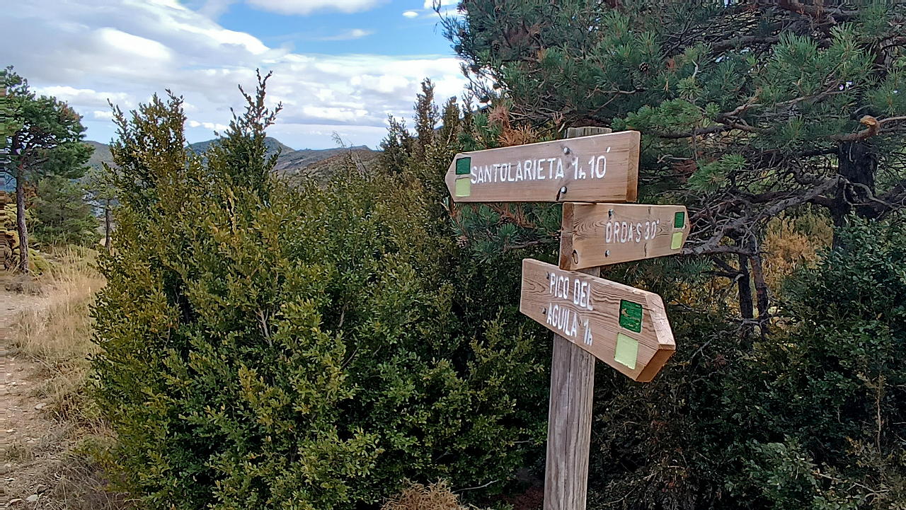 El sendero tendrá varias bifurcaciones, todas ellas señalizadas con carteles. La primera bifurcación a la derecha a Santalorieta (1290m 0h55′), hay que seguir a la izquierda. Ya tengo a la vista el pico del Águila y también bonitas vistas hacia atrás, con el salto de Roldán. La segunda a la derecha a Belsué (1400m 1h09′), hay que seguir de nuevo a la izquierda. La tercera a la izquierda a Arguis (1565m 1h22′), hay que seguir a la izquierda, siendo este camino que viene de Arguis el que suele ser la ruta normal. Unos metros más arriba se accede a la carretera (1585m 1h25′) que viene de Mesón Nuevo. Dejo la instalación de antenas a la derecha y subo a la izquierda al pico del Águila (1627m 1h34′), como siempre con unas vistas espléndidas.