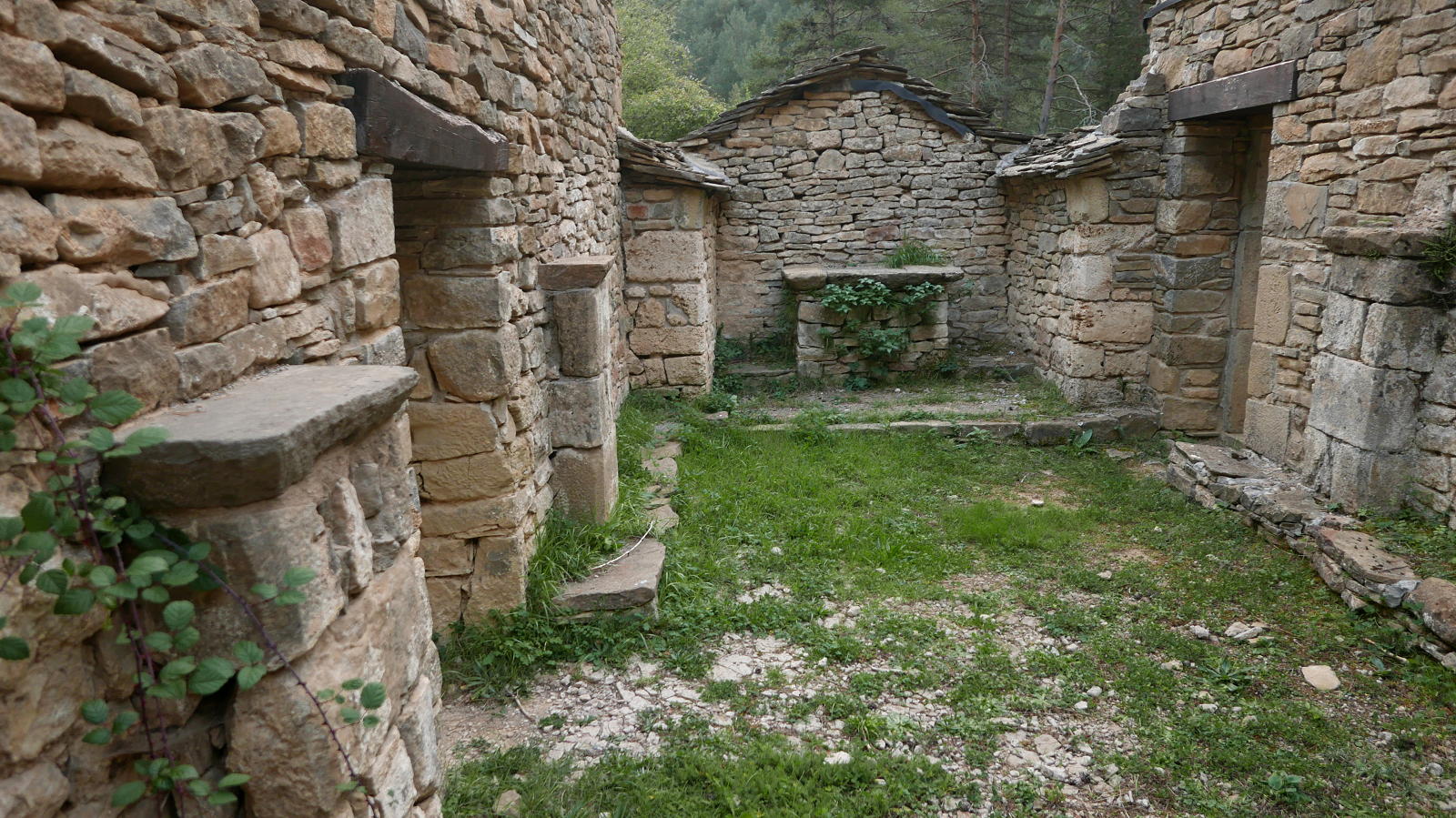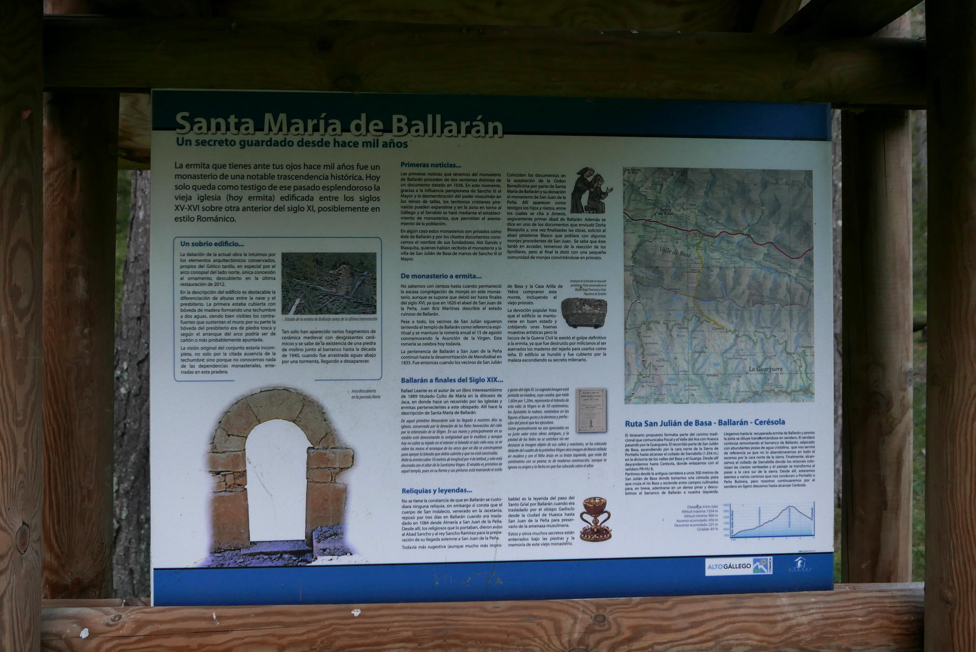 Descripción de la ruta: Aparcamiento (895m). Cruzo el río Basa sin problemas sobre los pilones de cemento. Al otro lado continúa una pista, al principio muy pedregosa, luego de piso más amable. Se puede tomar un atajo (945m) a la derecha que no veo a la subida, pero sí que lo aprovecho en la bajada. La pista cruza un barranco (985m 0h14′) seco que desciende a mi izquierda formando profundas cárcavas hacia el barranco de Ballarán. Llego a la ermita de Ballarán (1040m 0h26′), situado en un apacible prado abierto en el bosque, en estado ruinoso, sin cubierta, pero los muros nos dejan apreciar perfectamente la planta de la nave edificada en los siglos XV, XVI sobre otra edificación del siglo XI.