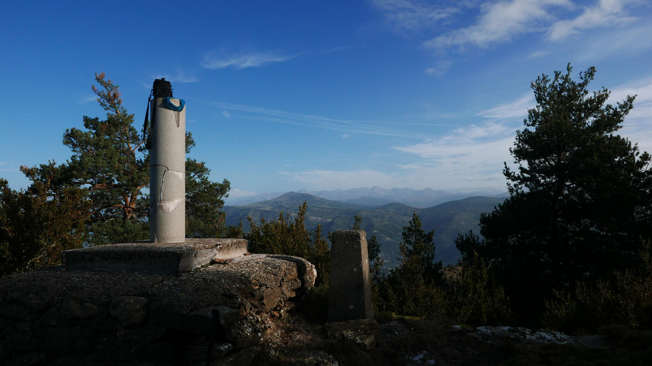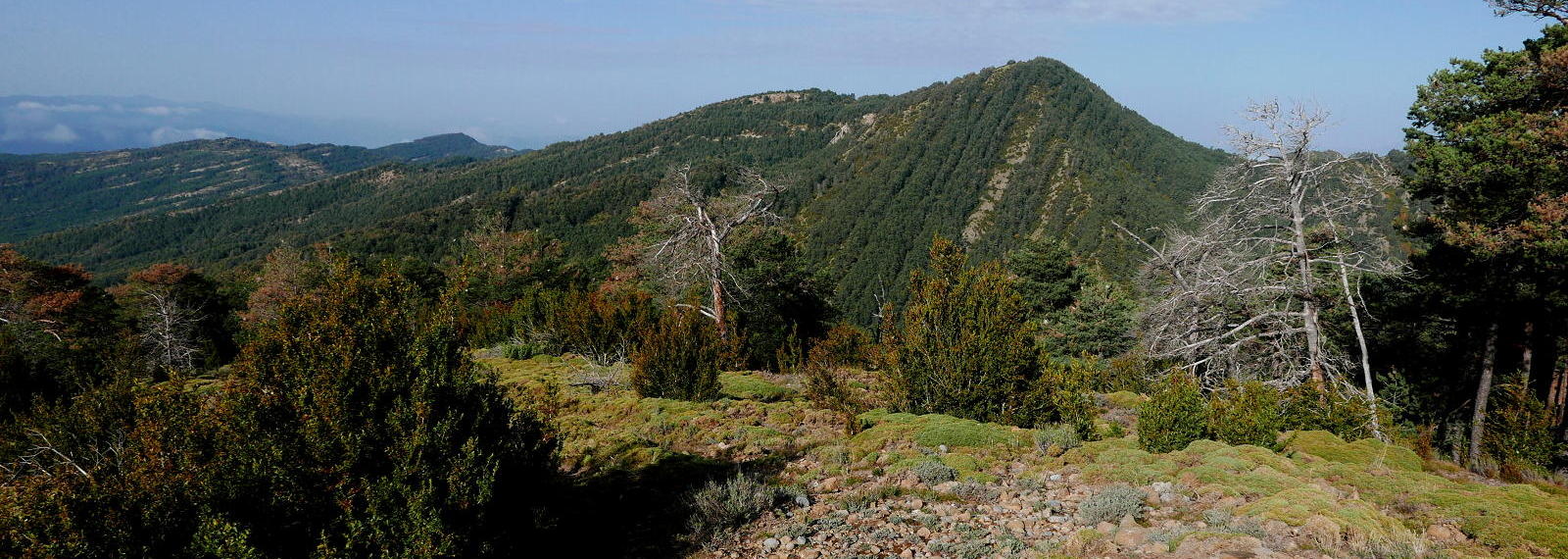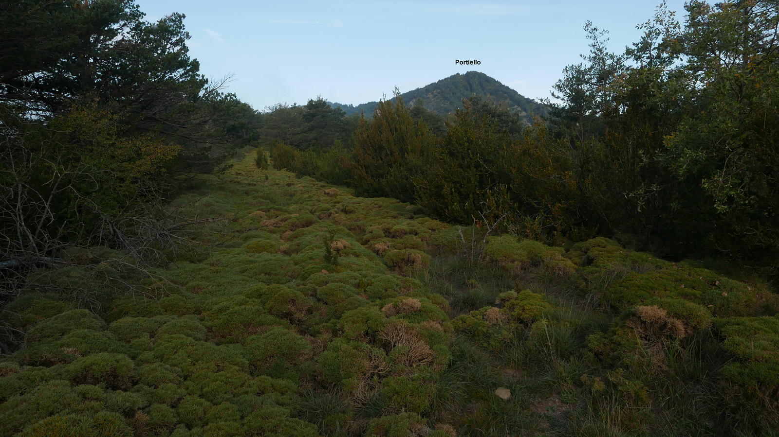 Más o menos de frente, hacia el SSE sigue el camino a Ceresola. Hacia la derecha, girando al NW se va al pico Portiello. Aparentemente es una trocha abierta en el bosque pero que se ha cerrado con erizones. Hay traza de paso a veces, más arriba hitos, pero se pierden con facilidad. Trato de seguir la cresta, más bien un poco por la izquierda, ya que a la derecha está más cerrado por bosque y el avance se vuelve complicado. En cualquier caso, aunque un poco incómodo, la orientación es clara y no hay ninguna zona peligrosa. En el pico Portiello (1544m 1h44′) hay un gran vértice geodésico. Desde el collado he tardado algo más de lo que esperaba.