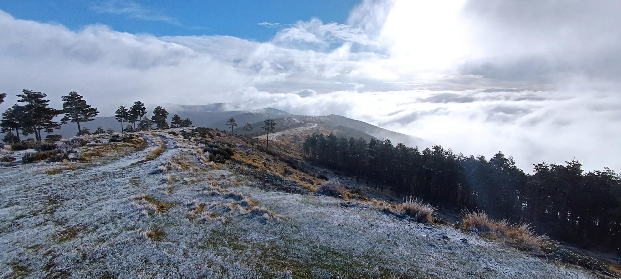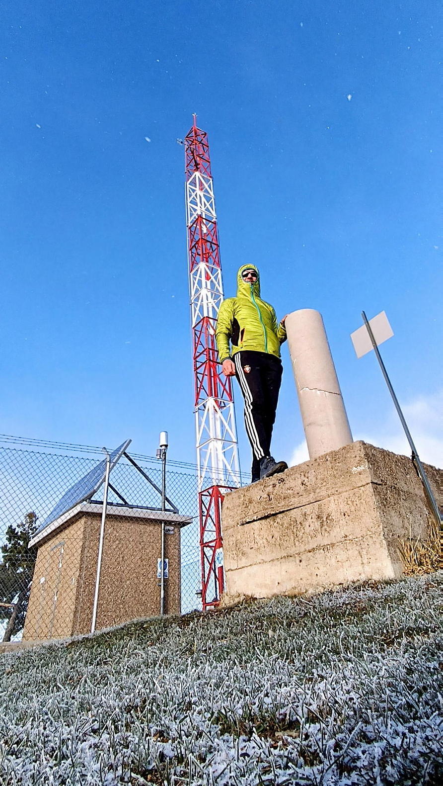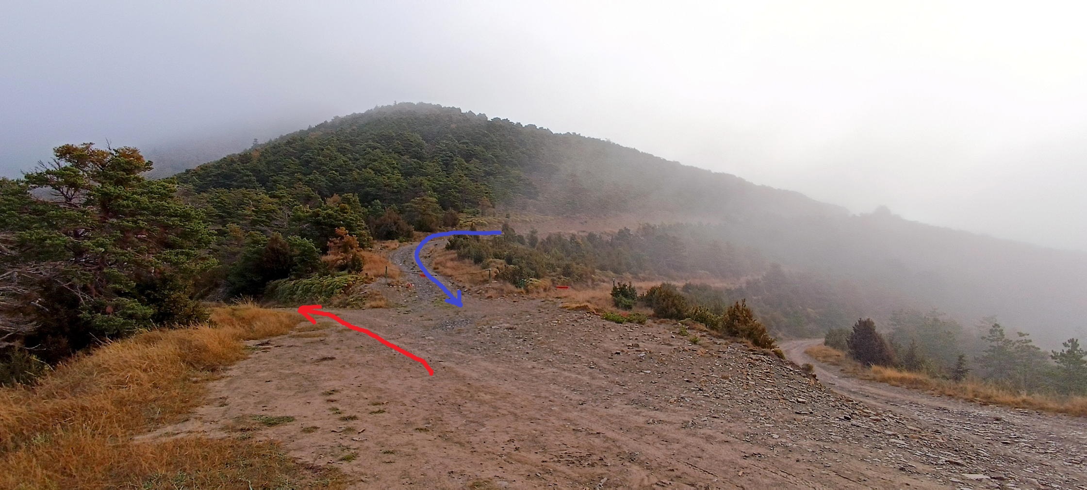 La cresta ya no tiene pérdida de camino a la cima del Albarún (1550m 1h54′) , con su vértice geodésico y su antena de comunicaciones. El viento, aunque no muy fuerte, produce una sensación de frío intenso. Unas pocas fotos y continúo la cresta hacia los yacimientos de gas de las Candeleras. Pero bastante antes de llegar me desvío por un camino a la derecha (1495m 2h11′) que desciende hasta conectar con una pista (1385m 2h17′) que tomo hacia la derecha y que me conducirá a la confluencia de caminos donde están las cadenas (1230m 2h38′).
