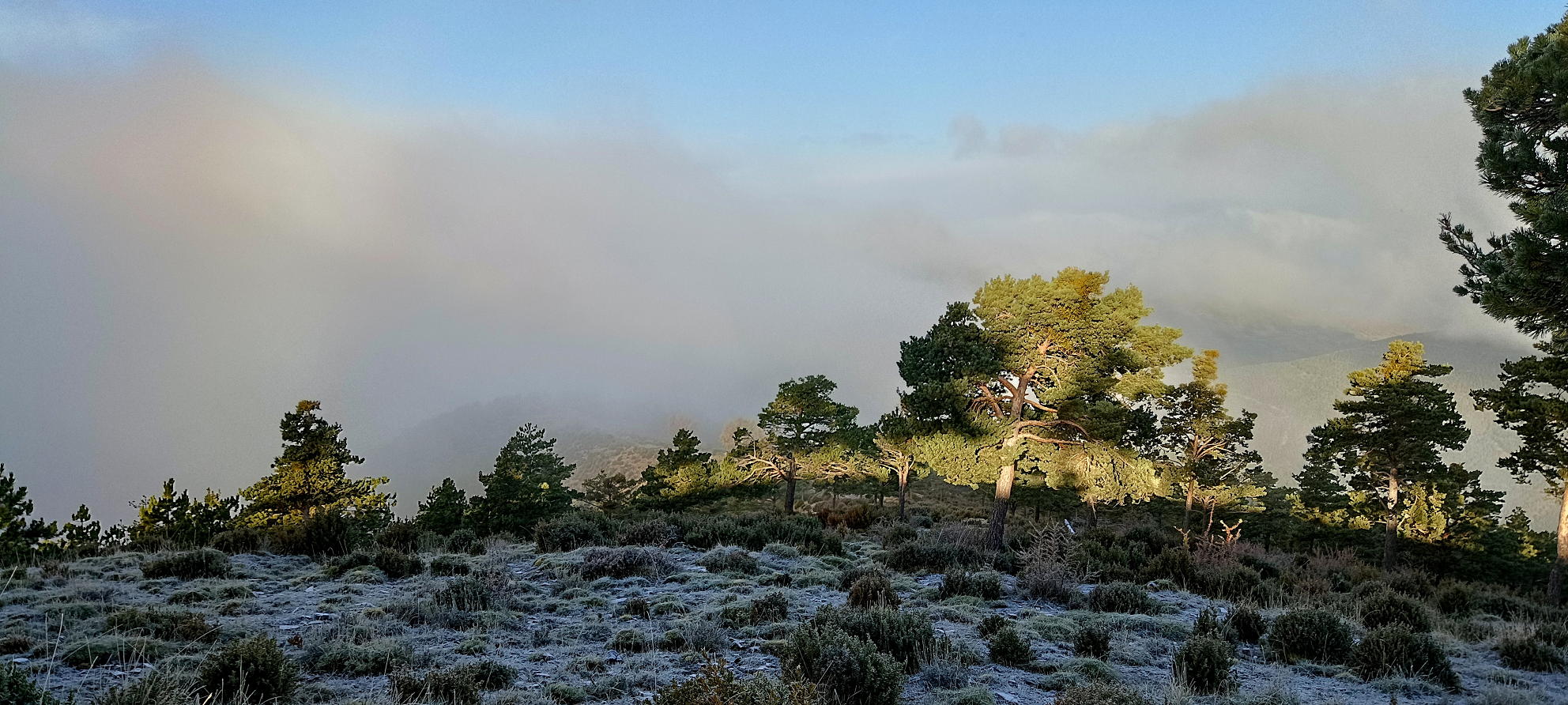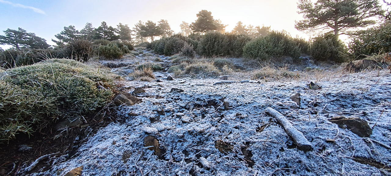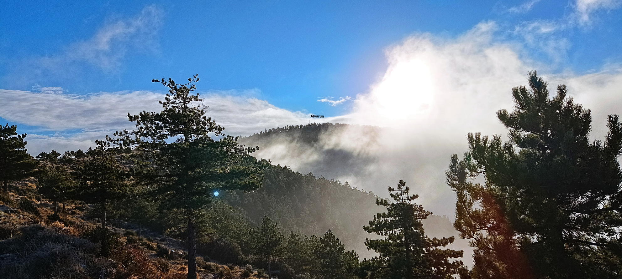 La cresta ya no tiene pérdida de camino a la cima del Albarún (1550m 1h54′) , con su vértice geodésico y su antena de comunicaciones. El viento, aunque no muy fuerte, produce una sensación de frío intenso. Unas pocas fotos y continúo la cresta hacia los yacimientos de gas de las Candeleras. Pero bastante antes de llegar me desvío por un camino a la derecha (1495m 2h11′) que desciende hasta conectar con una pista (1385m 2h17′) que tomo hacia la derecha y que me conducirá a la confluencia de caminos donde están las cadenas (1230m 2h38′).