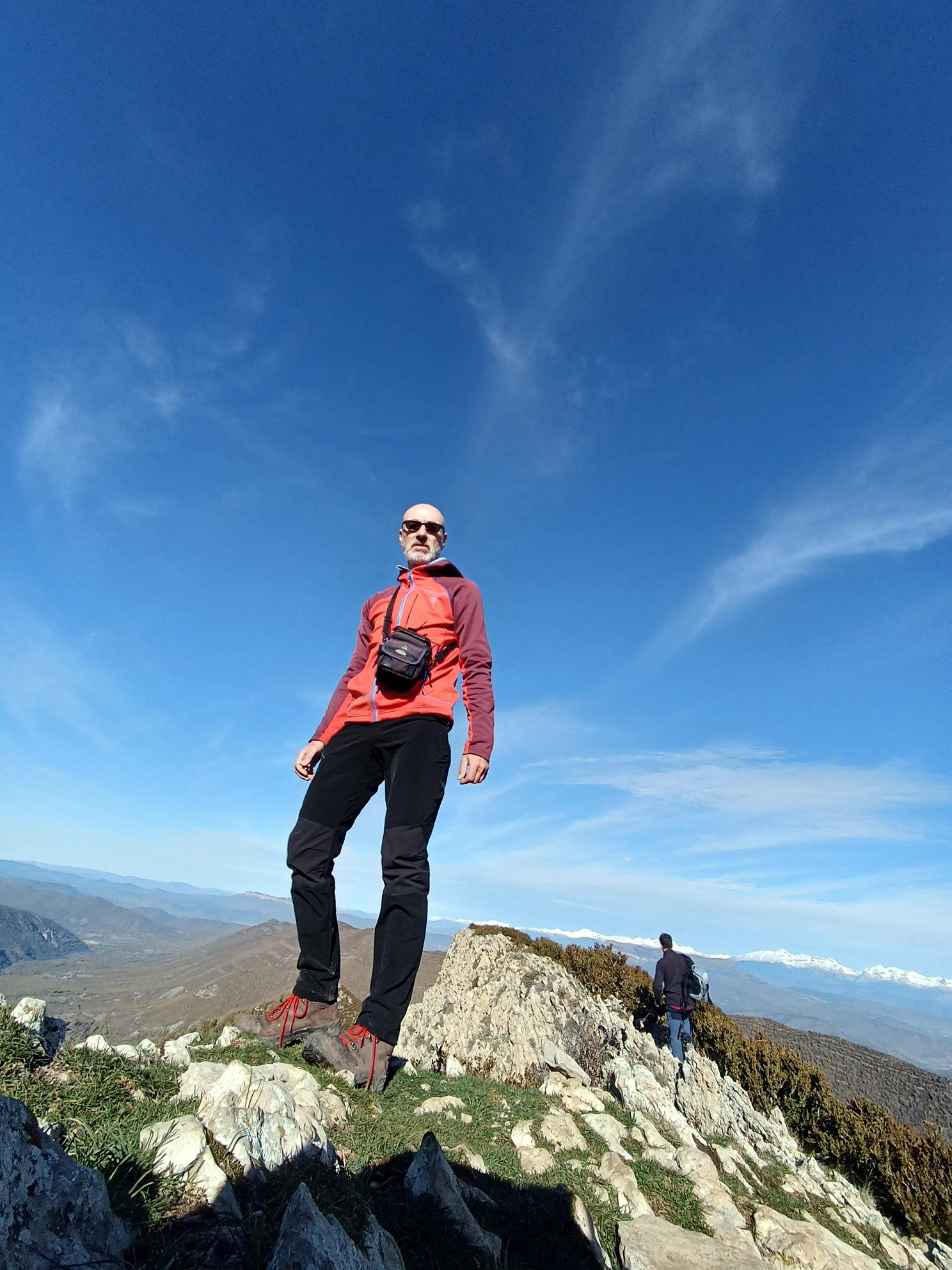 Continúo el camino, pero enseguida me doy cuenta de que tengo que volver al collado y tomar una difusa senda a la izquierda (oeste) que ascienda entre vegetación de boj pero sin pérdida hasta la cresta (1540m 2h25′). Hay que seguir la cresta hacia el norte, sobresale la roca caliza, hay que prestar atención, es un tramo entretenido y hay un par de destrepes para llegar al collado de Peiró 1490m 2h52′). Un ascenso con buena pendiente lleva a la cima del Peiró (1579m 3h01′).