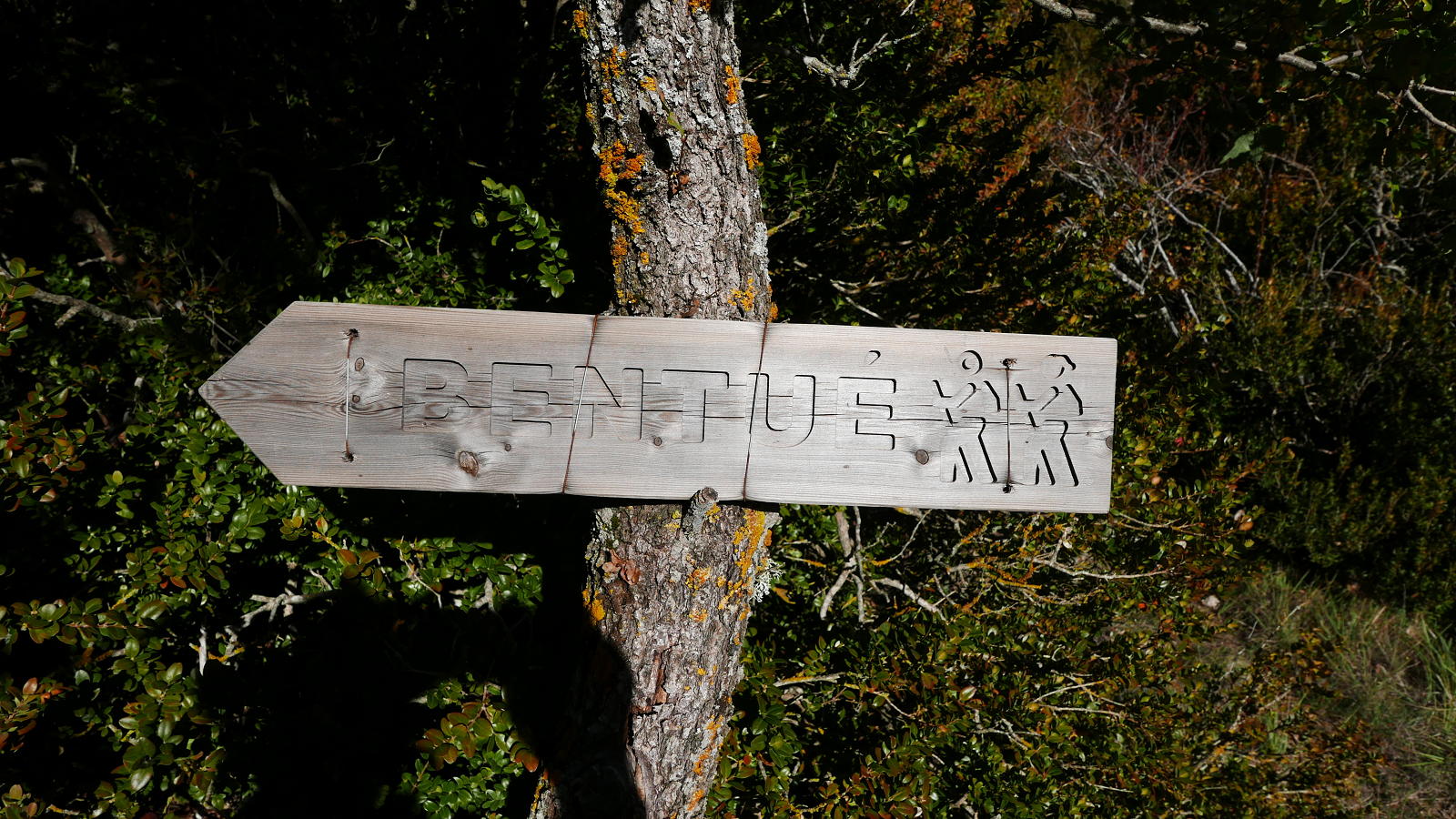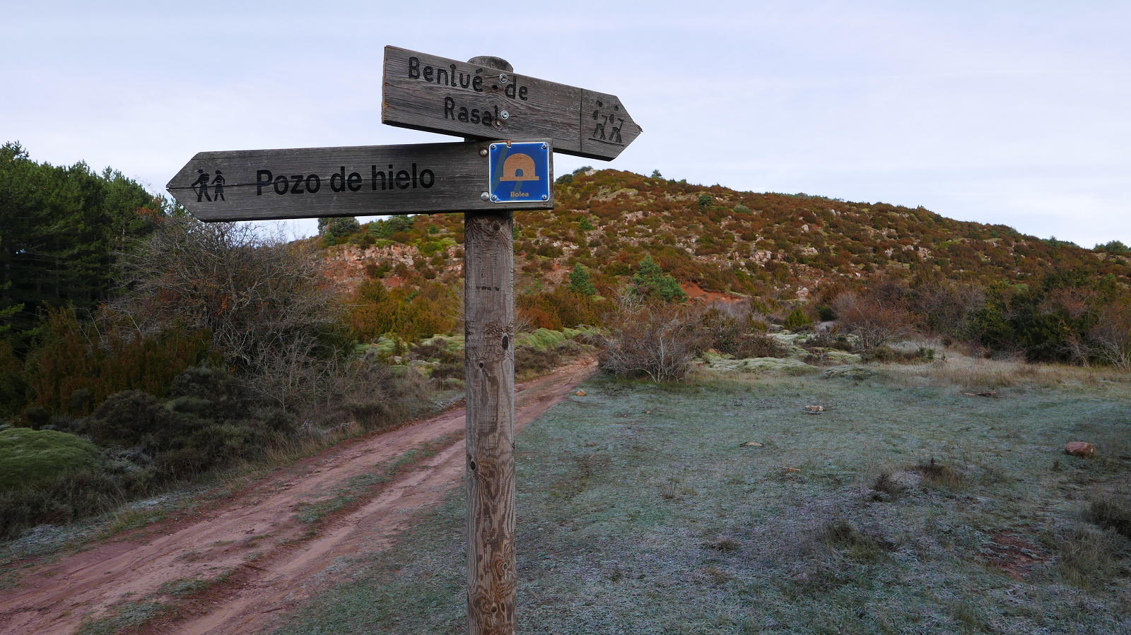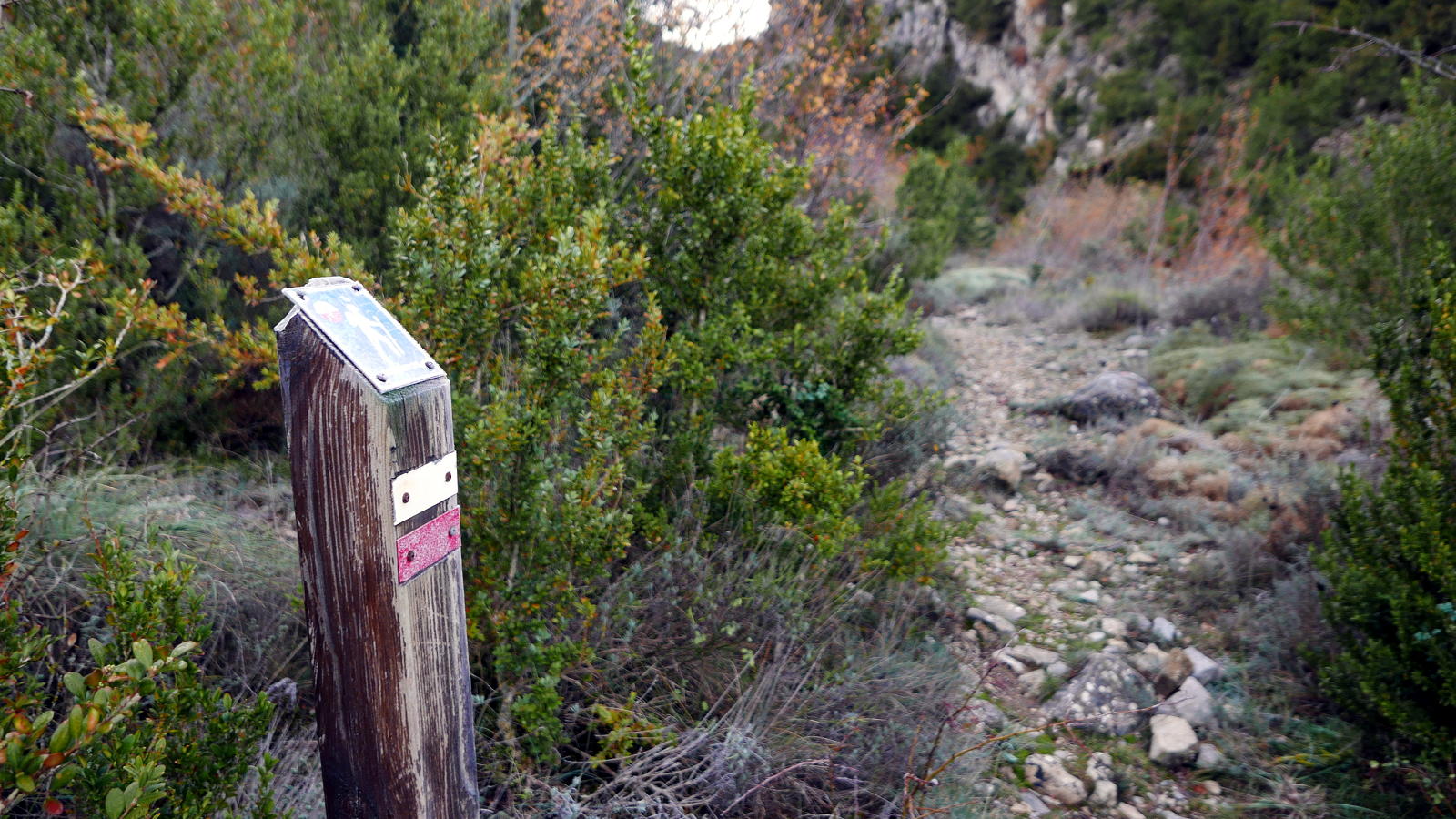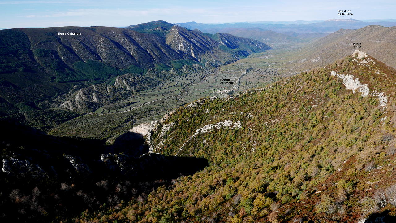 Toca continuar la cresta hacia NNW, en general un pelín por su derecha, hasta subir a una cota sin nombre que llamaré Punta Norte del Peiró (1501m 3h30′). Después retrocedo un poco hasta un punto en que hay un hito gordo que marca el descenso hacia el SW por una senda medio perdida, entre vegetación en un bosquete de quejigos, en algunos puntos hay que estar atento al GPS. Tiene fuerte pendiente y, con el barrillo y la hojarasca, está bastante resbaladiza. Por fin, más abajo, hay un cartel de madera (1330m 3h53′) que pone Bentué. Parece que el camino está más claro y desemboca en una pedrera (1115m 4h08′) recta para abajo.